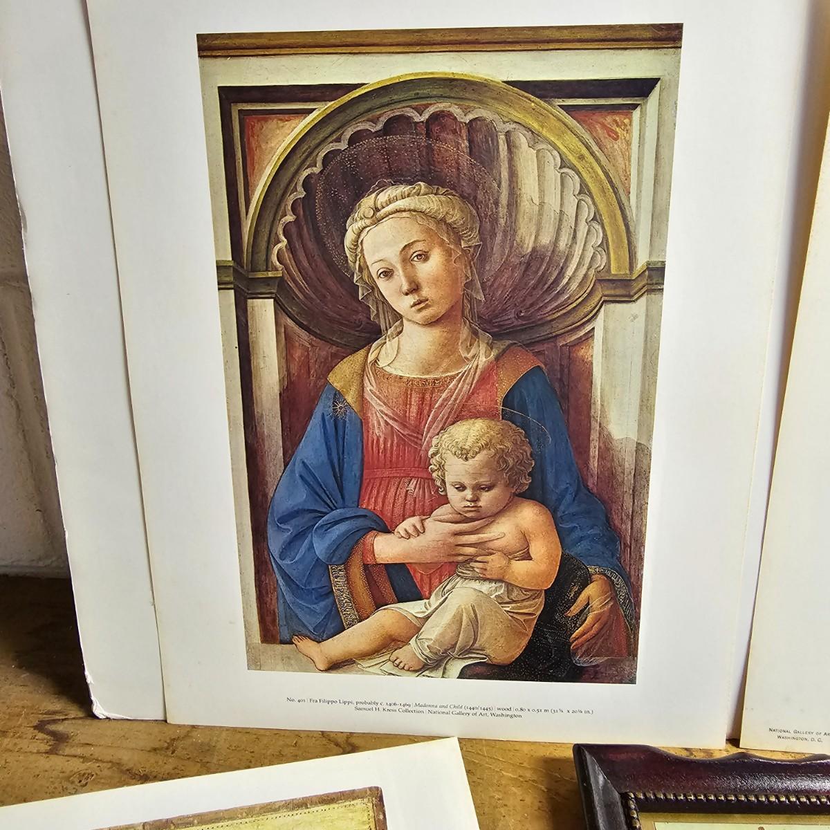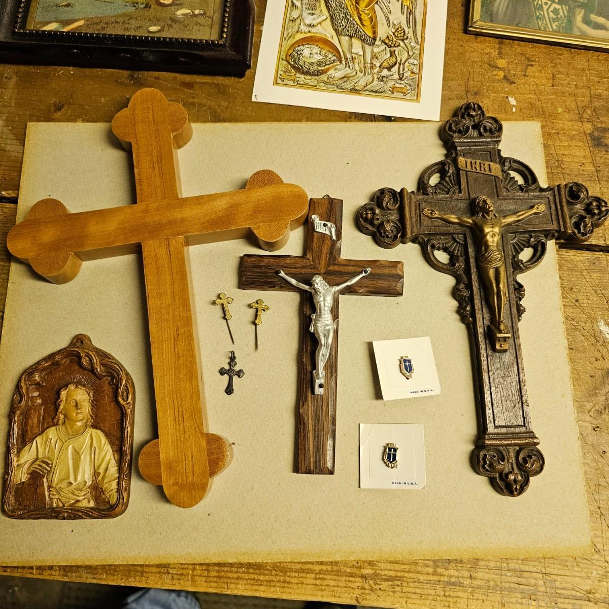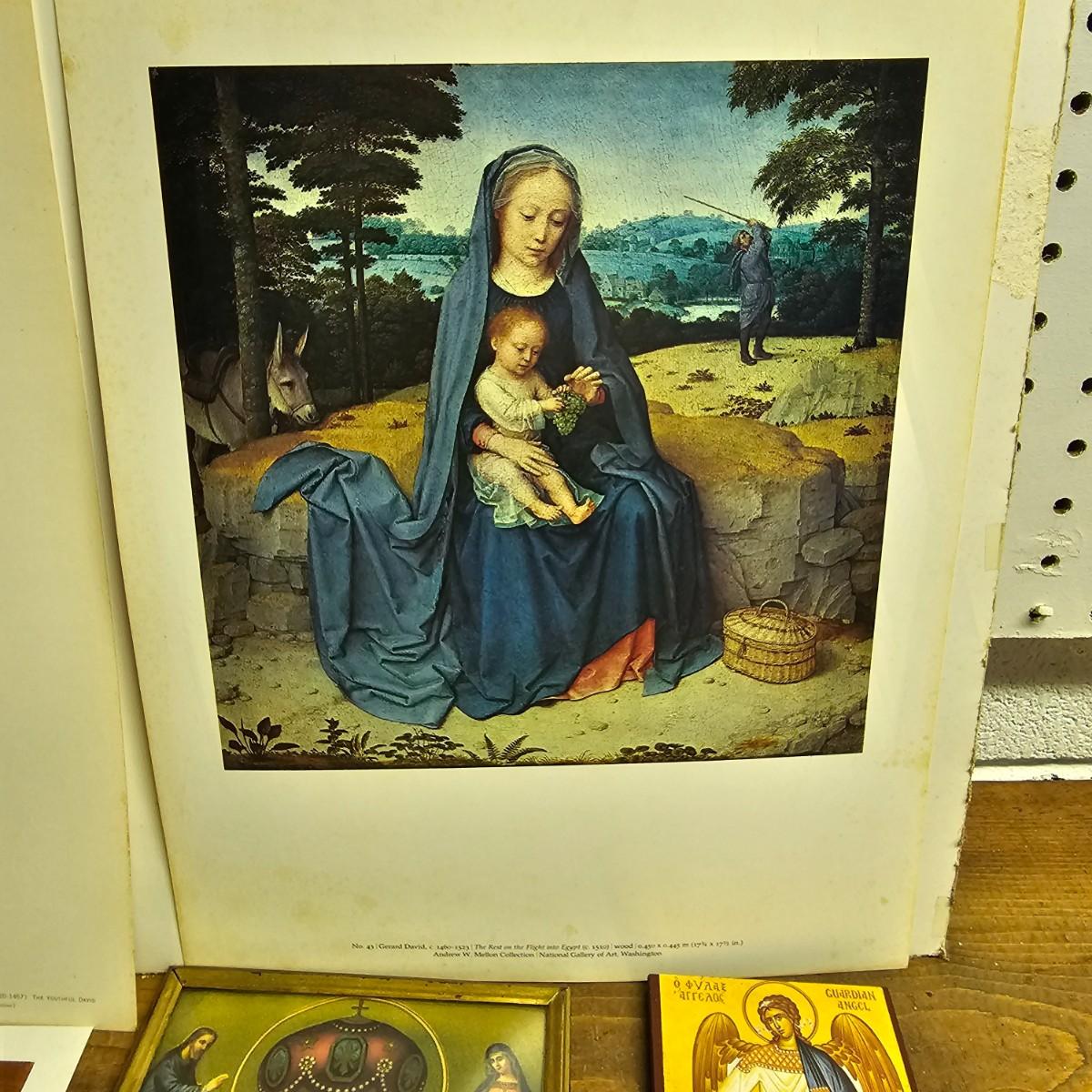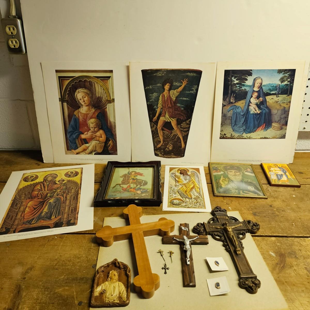 Several images of religious importance. Madonna and child, saints and symbols. Largest prints are 11" x 14", large wooden cross is 8" x 11"H. See photos for details. Shipping available.