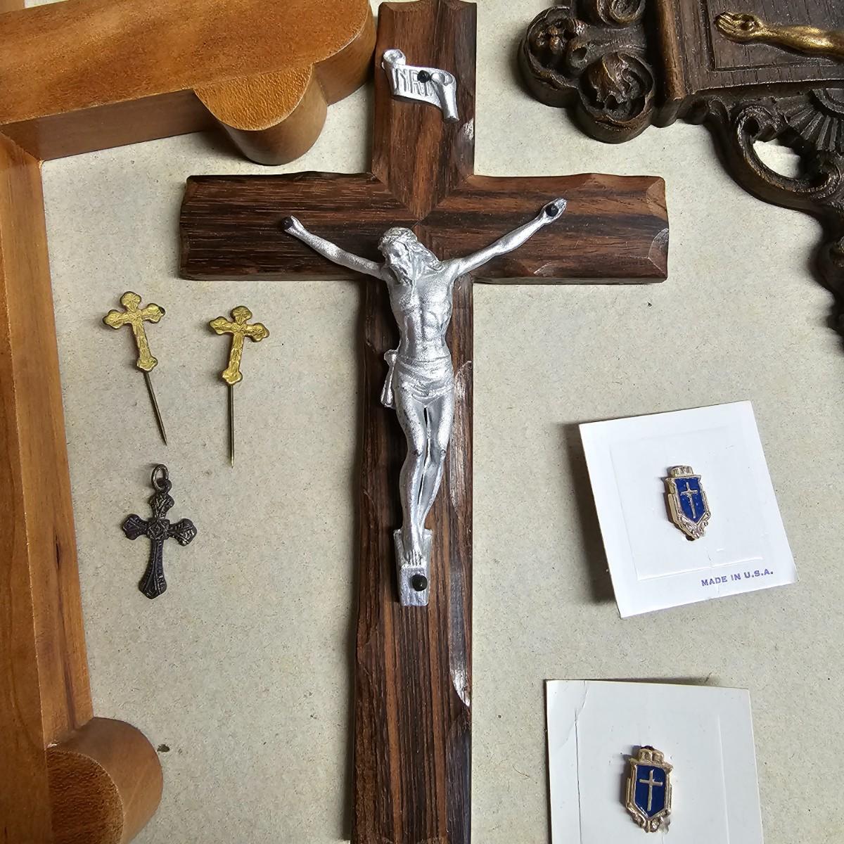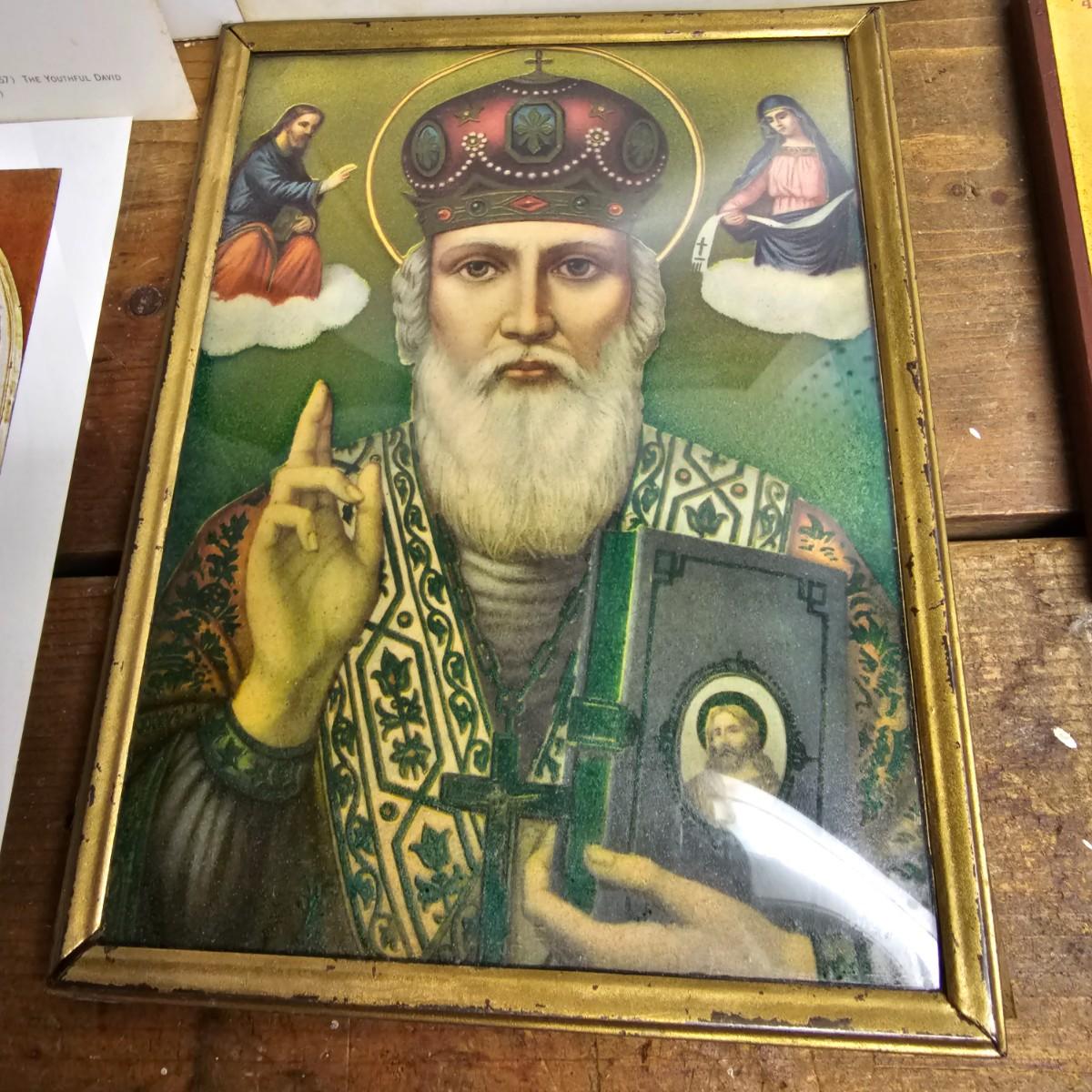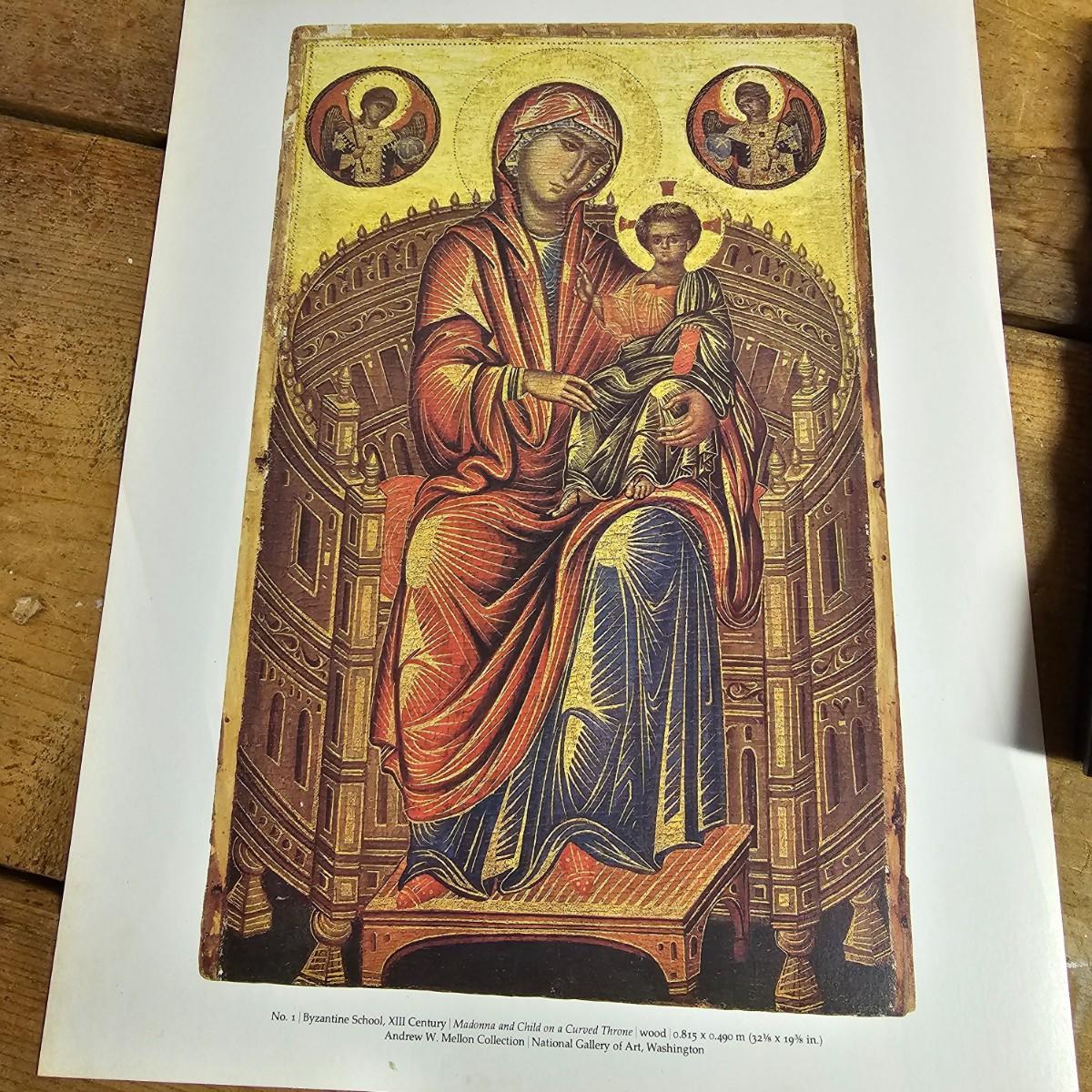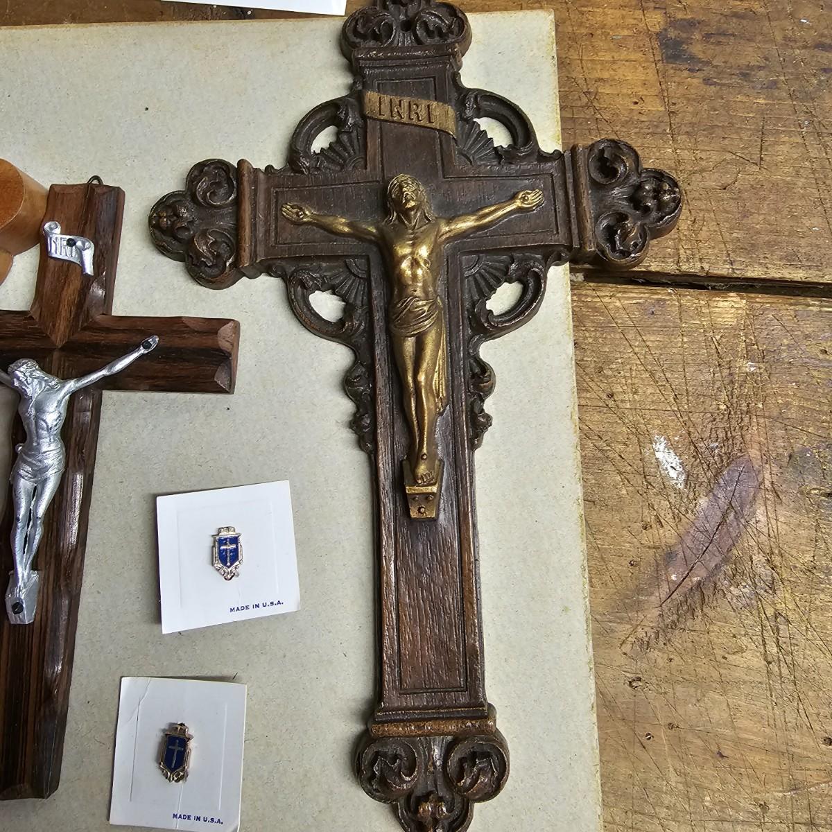 Several images of religious importance. Madonna and child, saints and symbols. Largest prints are 11" x 14", large wooden cross is 8" x 11"H. See photos for details. Shipping available.