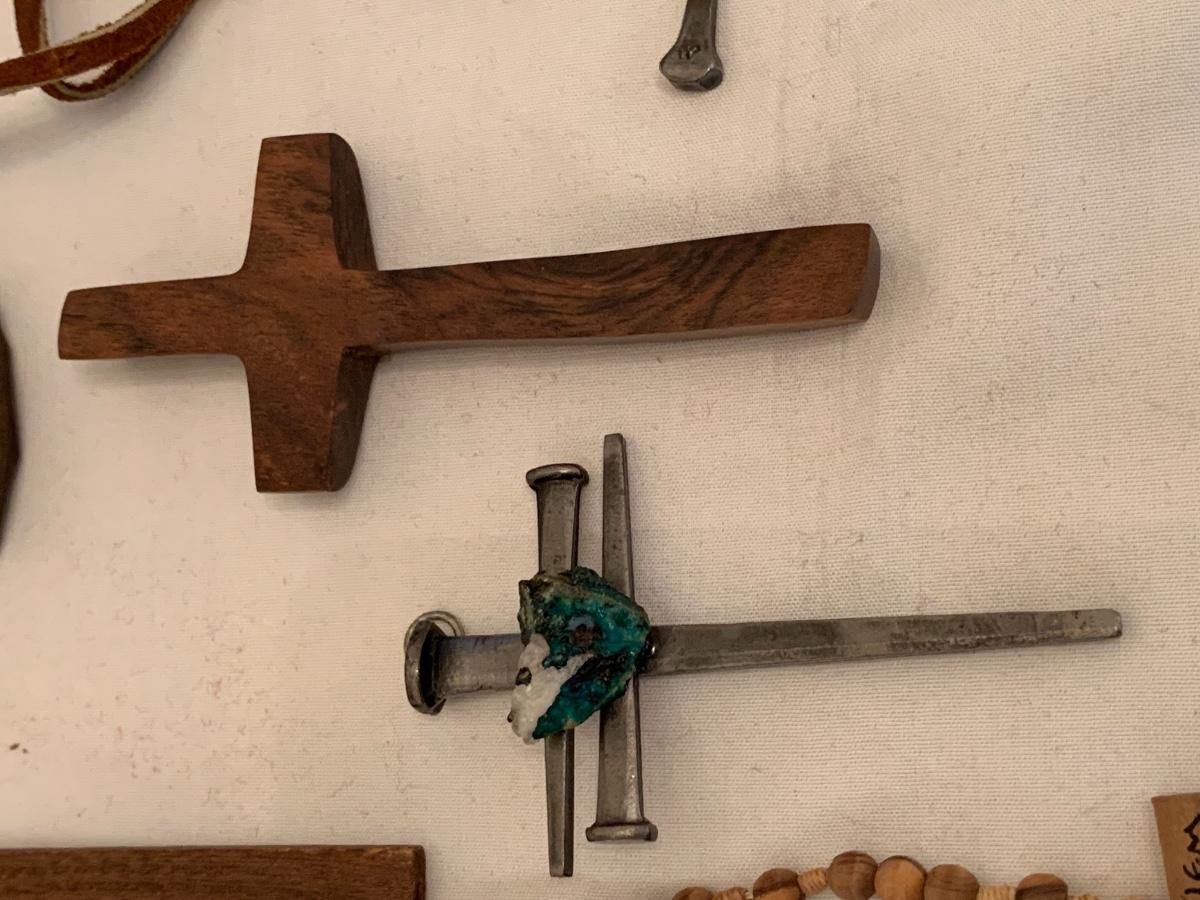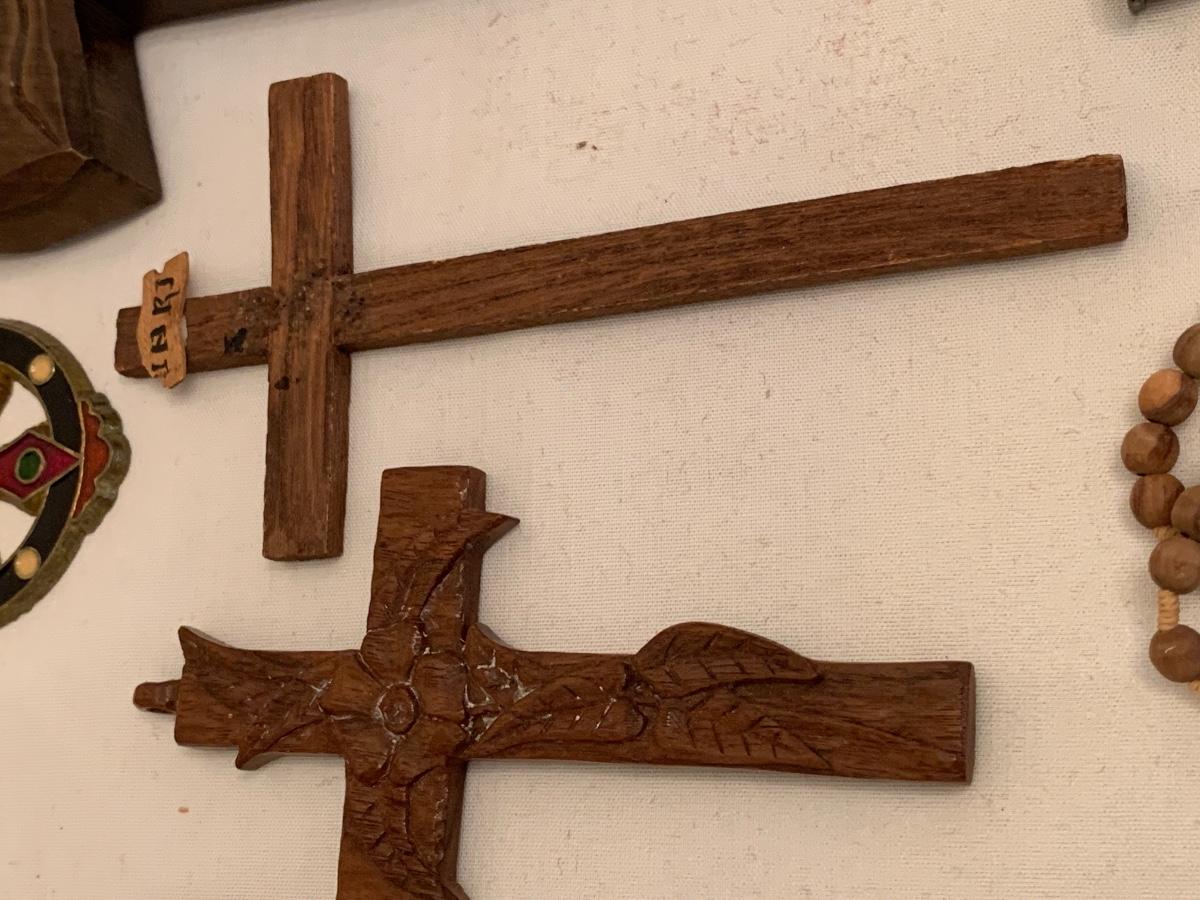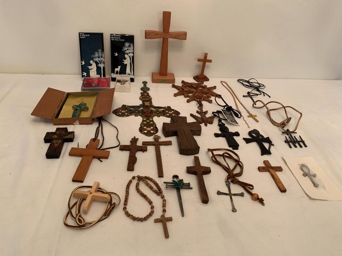 Large collection of religious items included crosses and crucifix made from wood and metal.