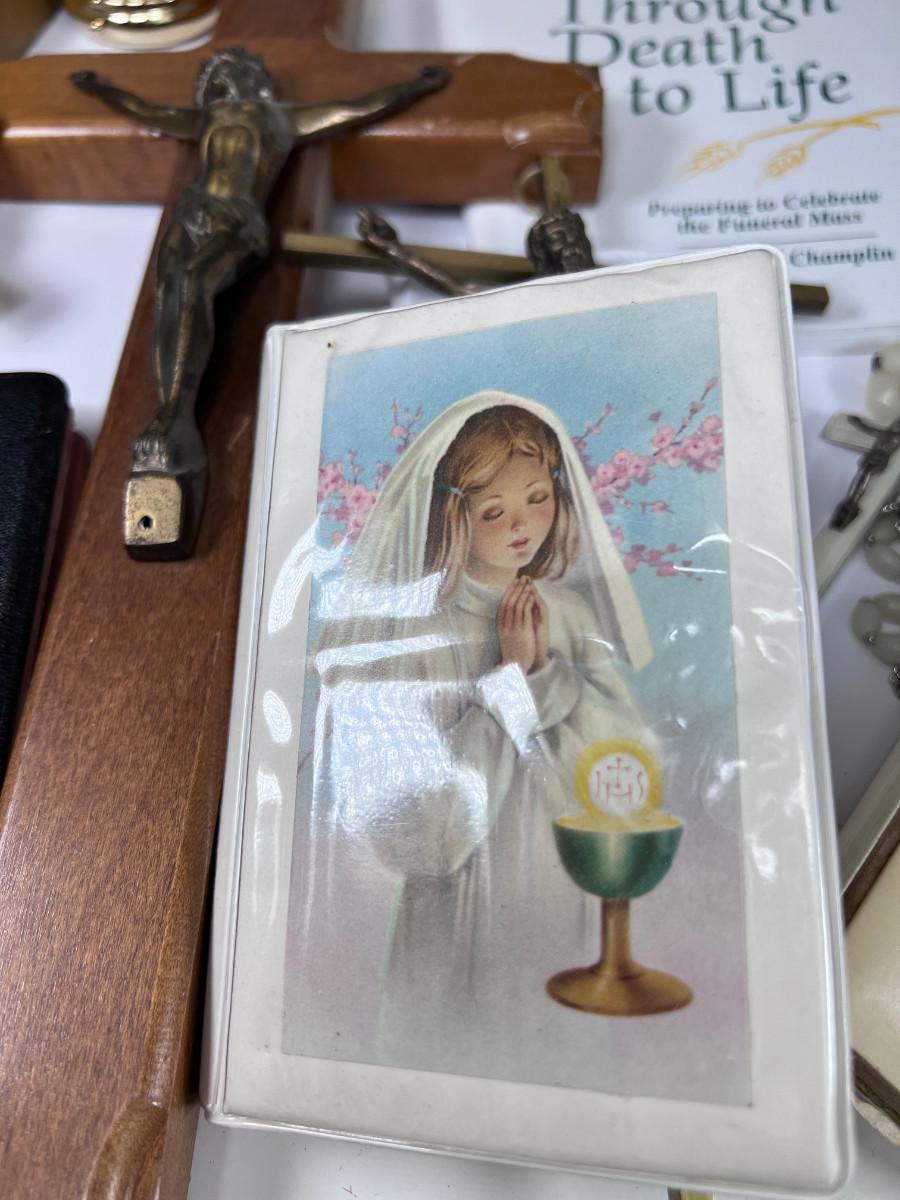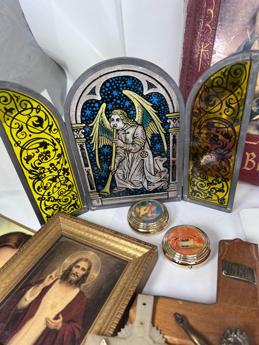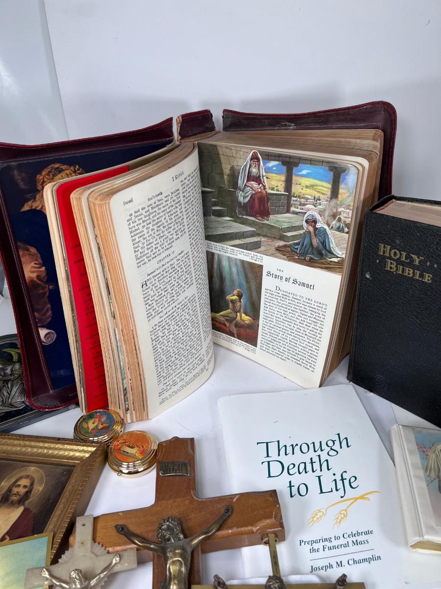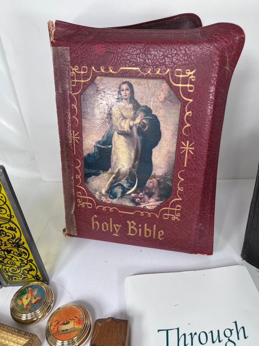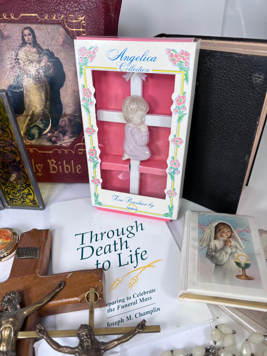 Large Bible with color pictures, wear to cover, religious pictures, Crucifixes Rosaries, books, first Communion books. Wood resin wall hanging, faux stained glass panel, Angelica Collection vintage porcelain cross with praying child.