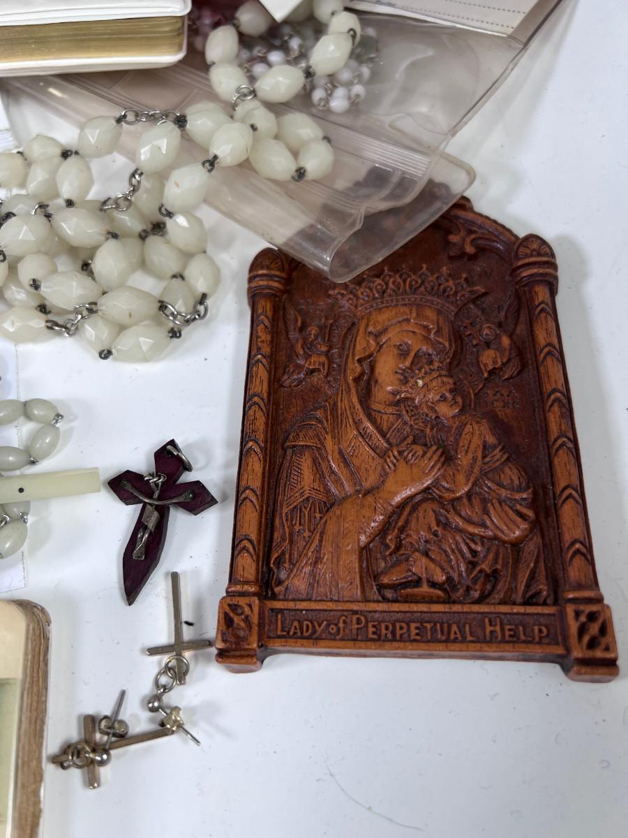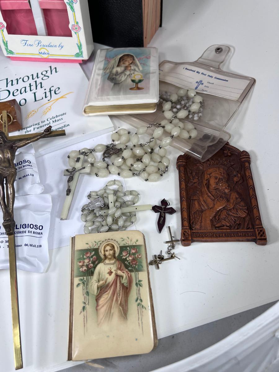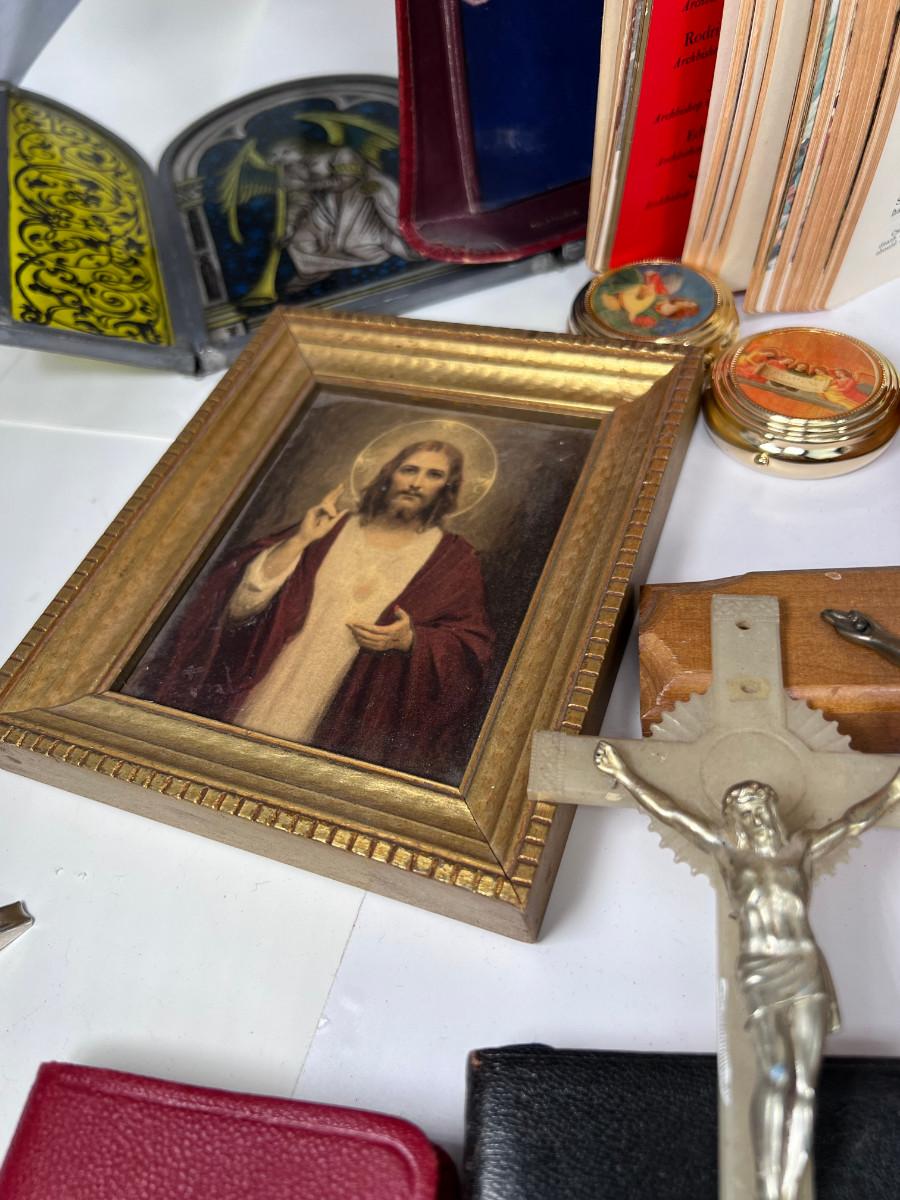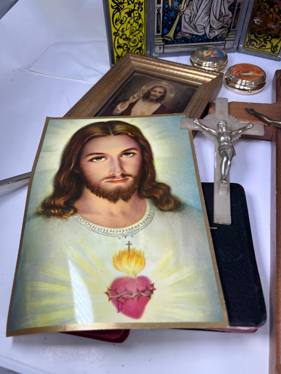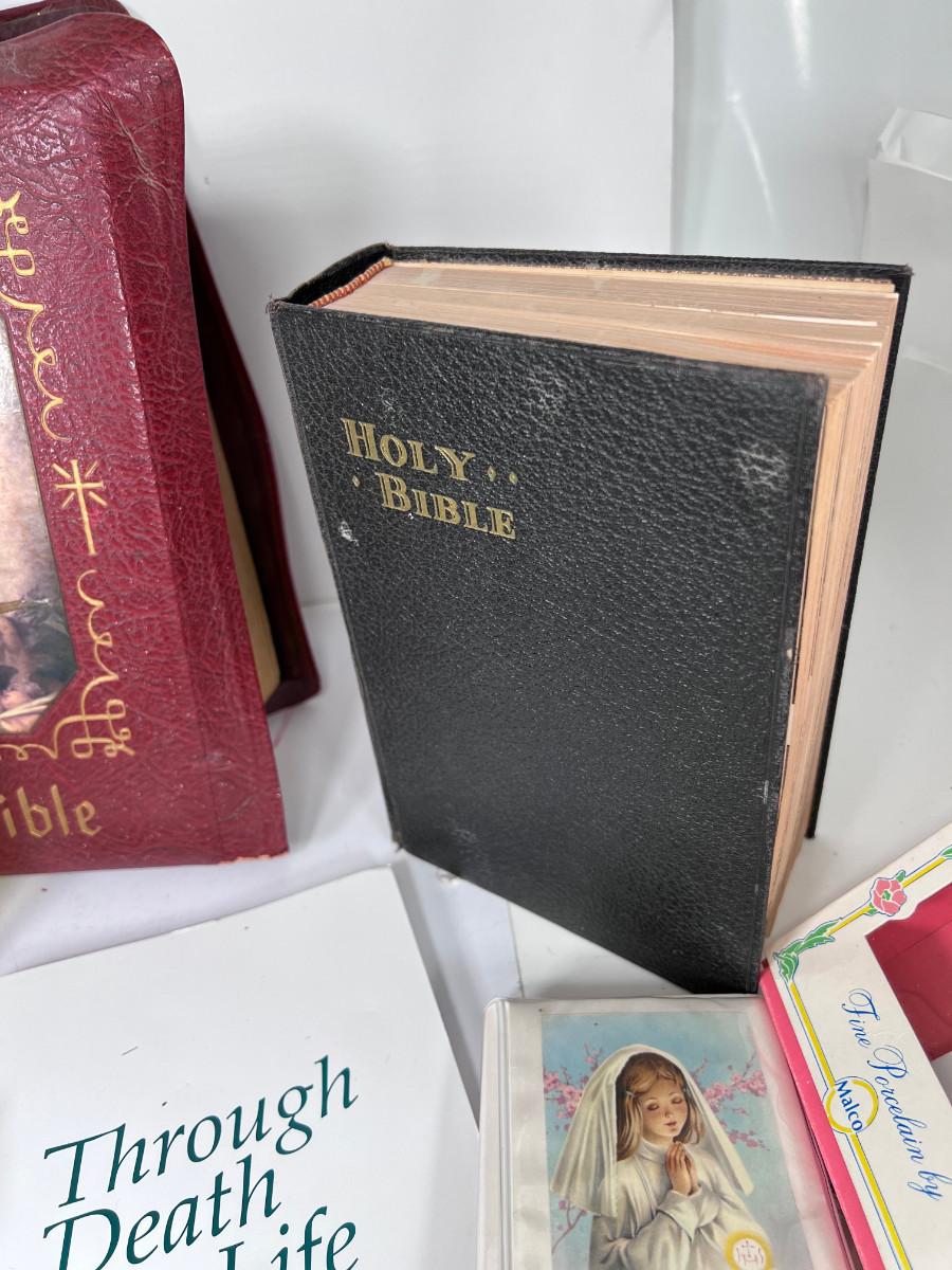 Large Bible with color pictures, wear to cover, religious pictures, Crucifixes Rosaries, books, first Communion books. Wood resin wall hanging, faux stained glass panel, Angelica Collection vintage porcelain cross with praying child.
