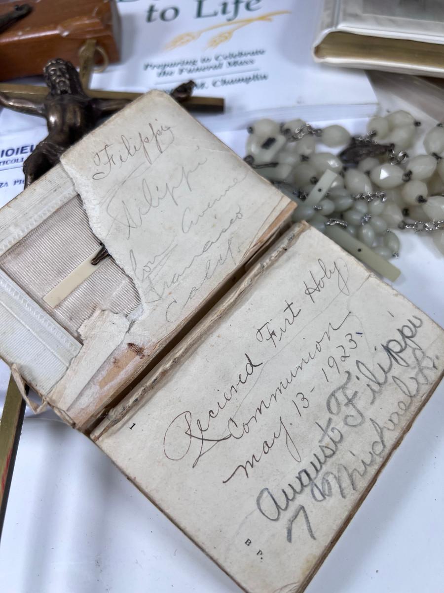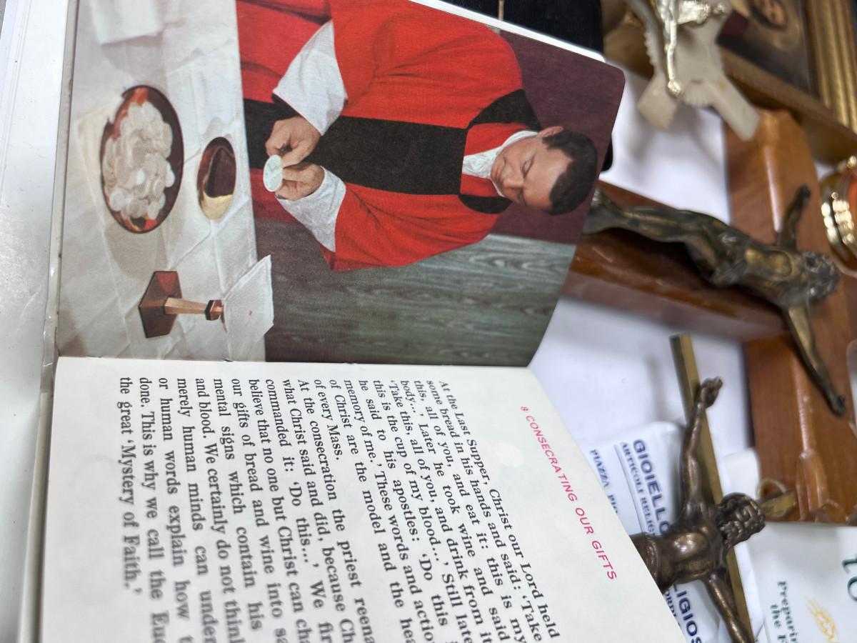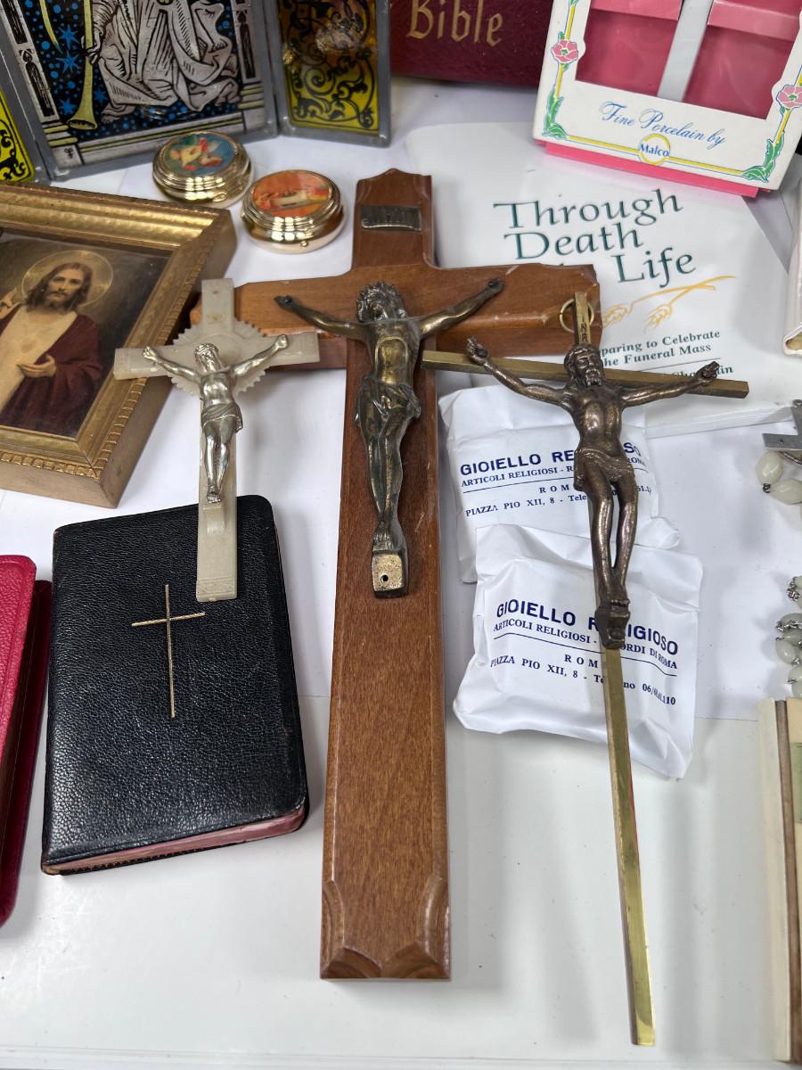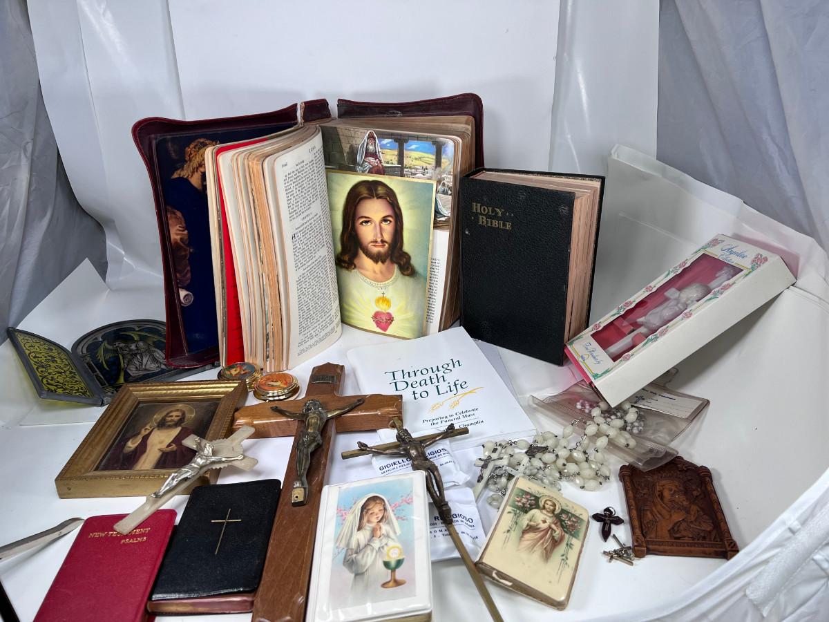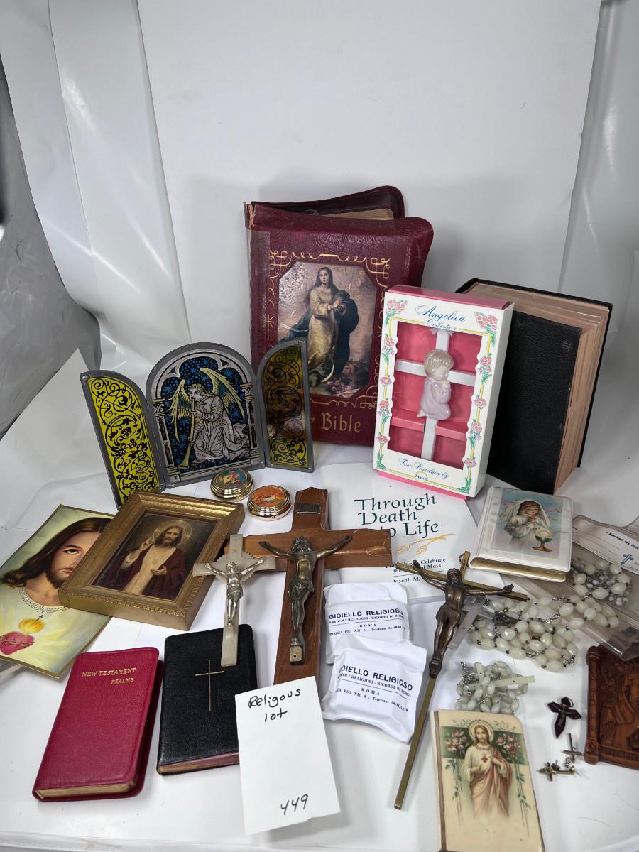 Large Bible with color pictures, wear to cover, religious pictures, Crucifixes Rosaries, books, first Communion books. Wood resin wall hanging, faux stained glass panel, Angelica Collection vintage porcelain cross with praying child.