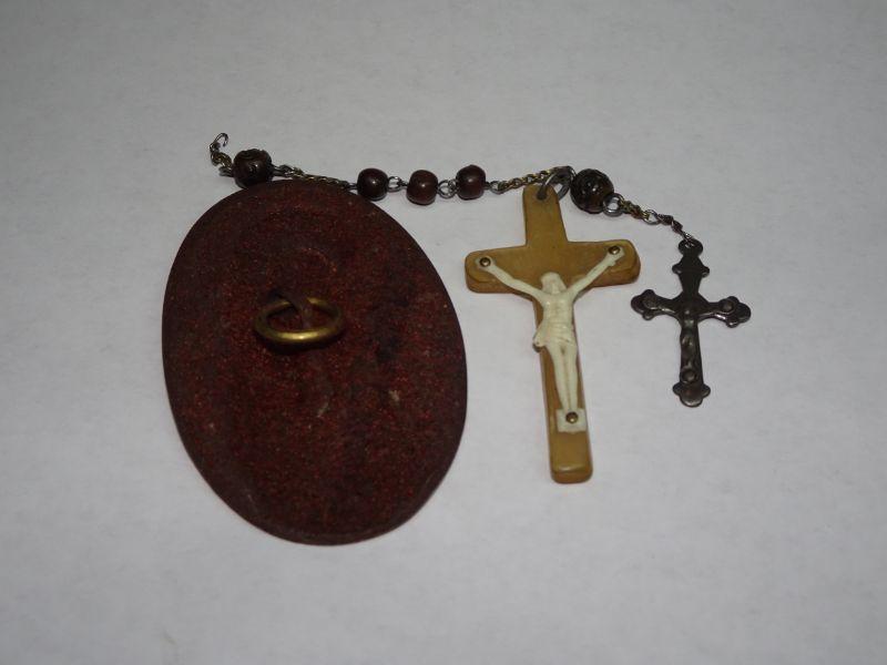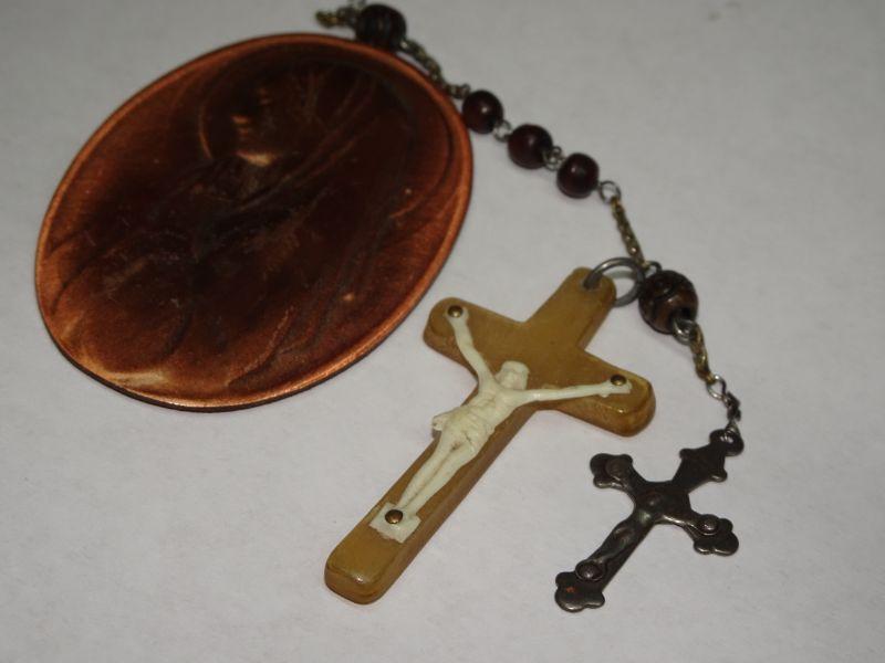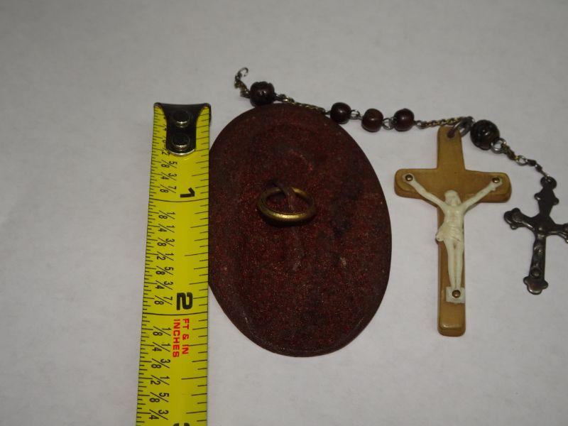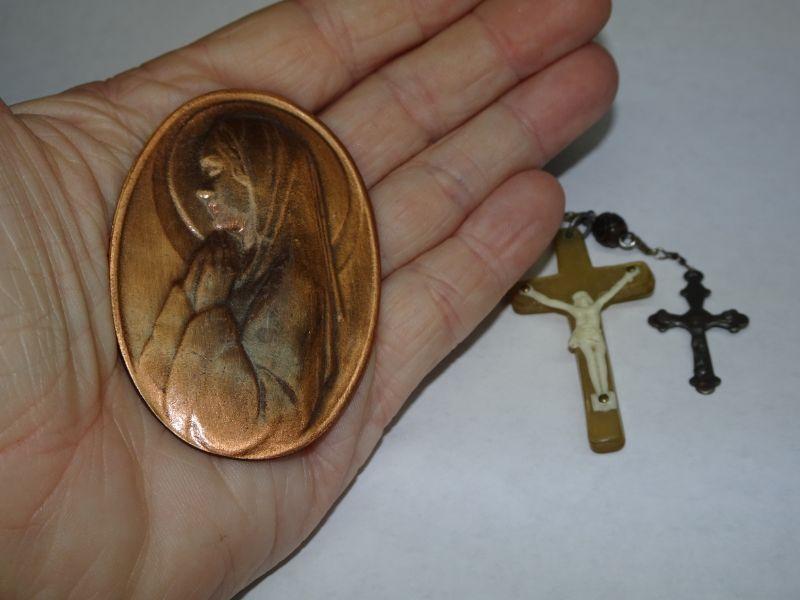 Religious Relic Craft Lot, Crucifix, Rosary, Copper Virgin Mary Trivet