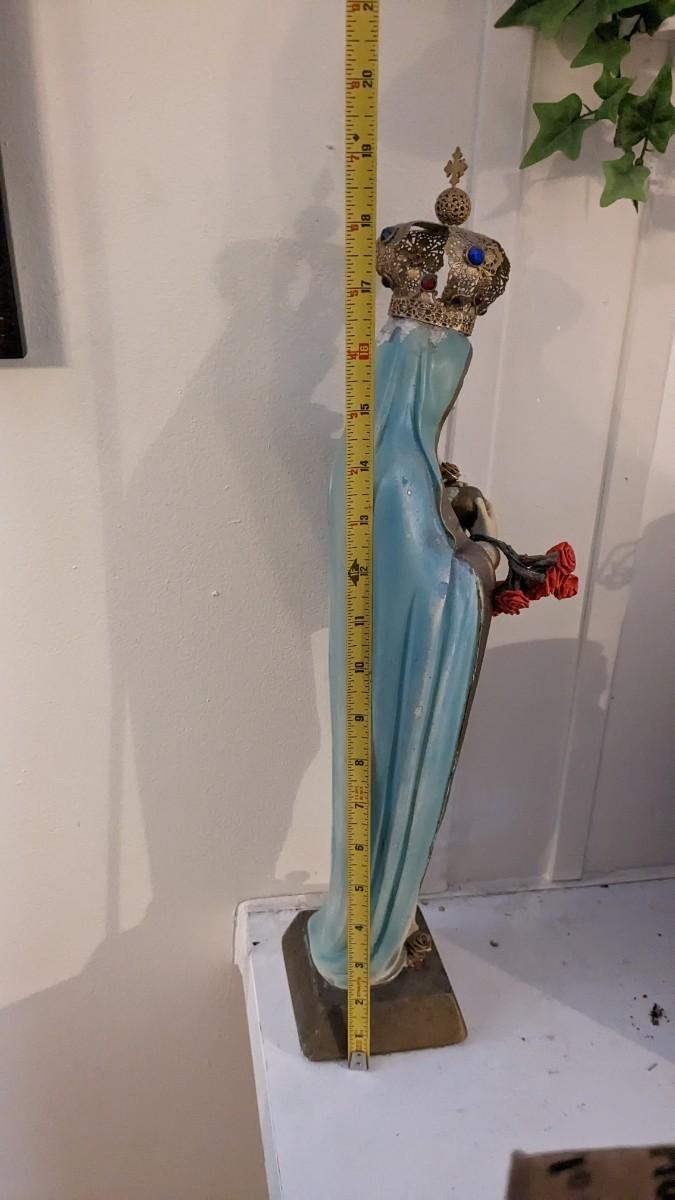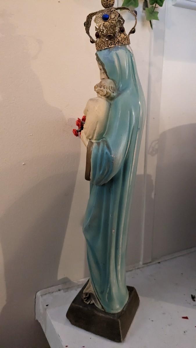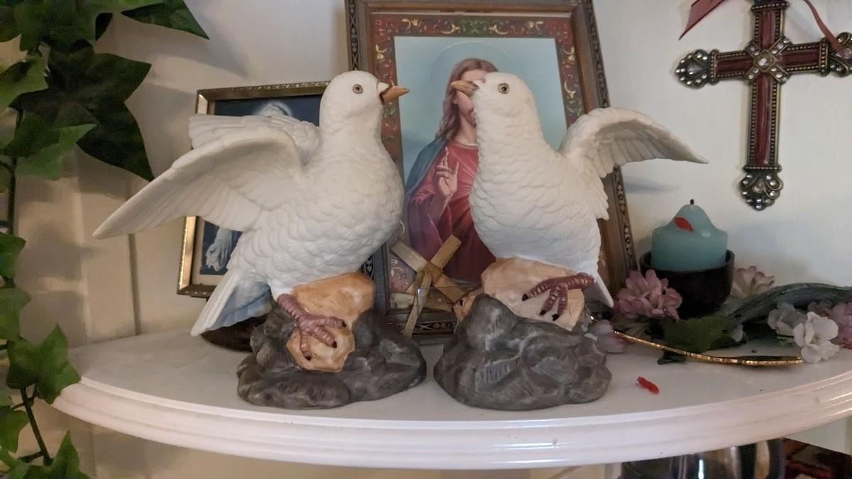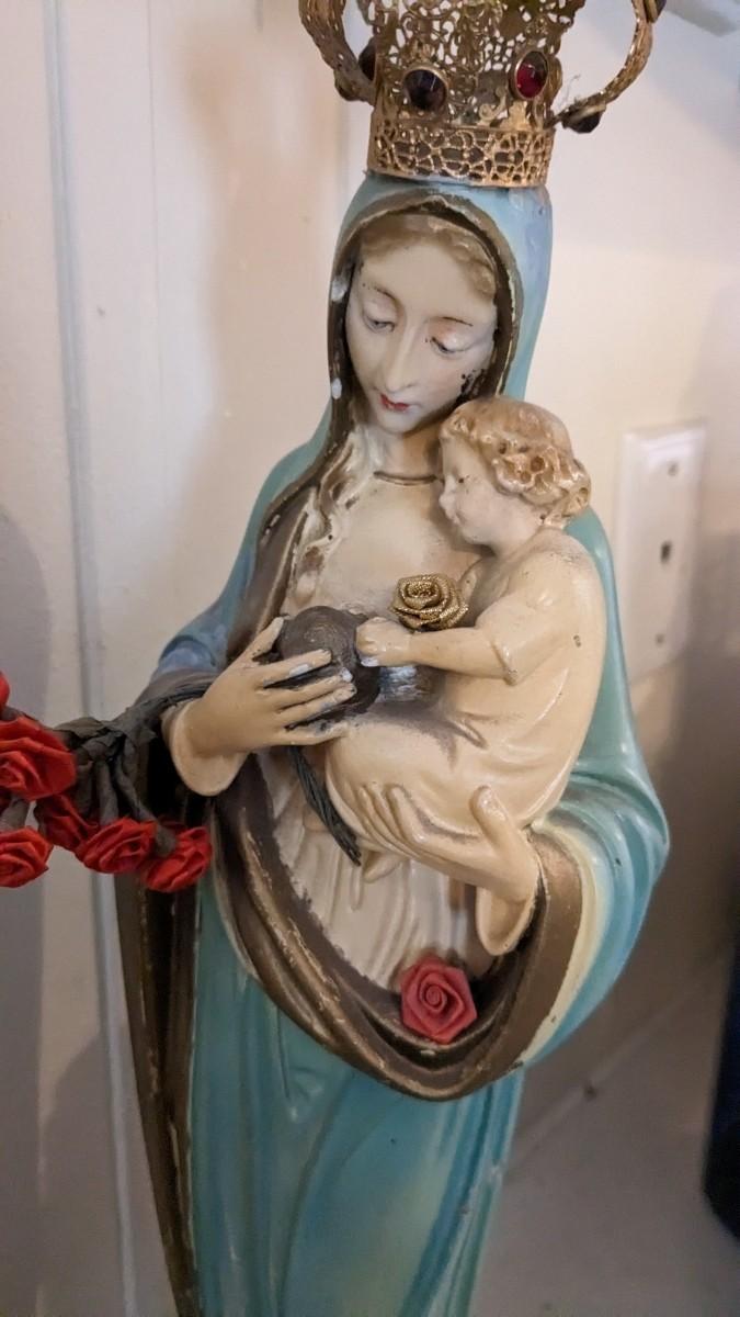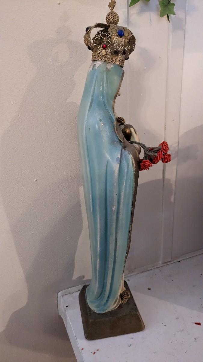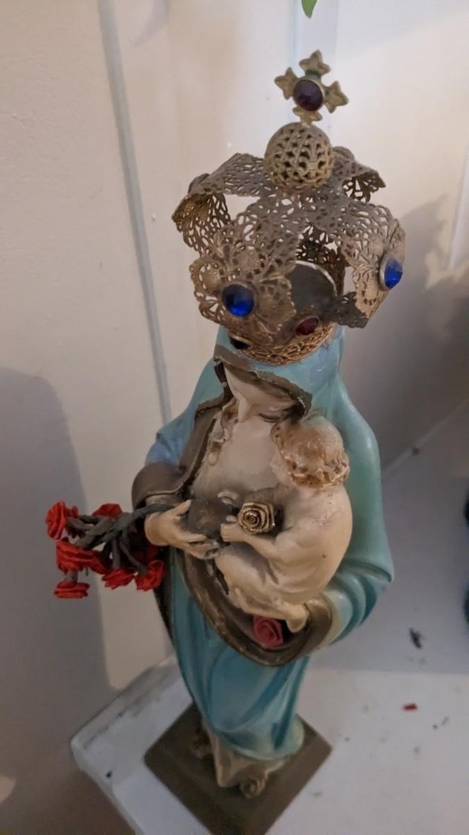 includes 1940 chalkware Sacred Mary in good condition for age with embellishments added, please note in photos. 2 other saints, 2 doves, framed Popes, framed Jesus', faux florals, and more! No shipping. Livingroomcorner