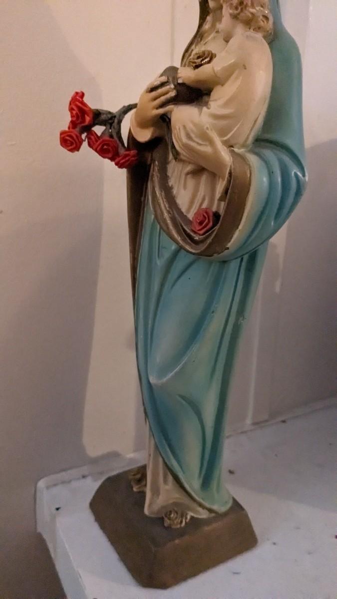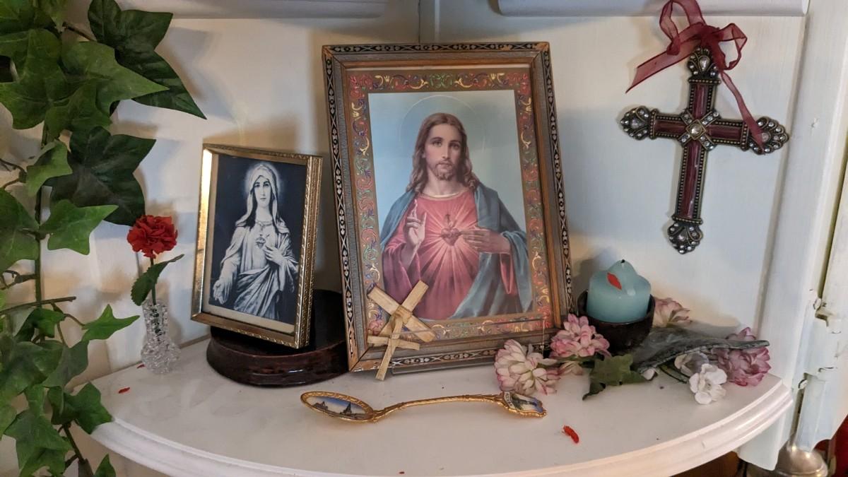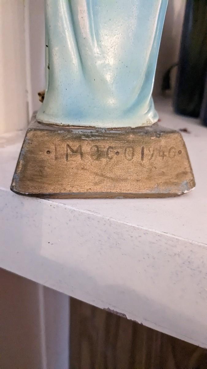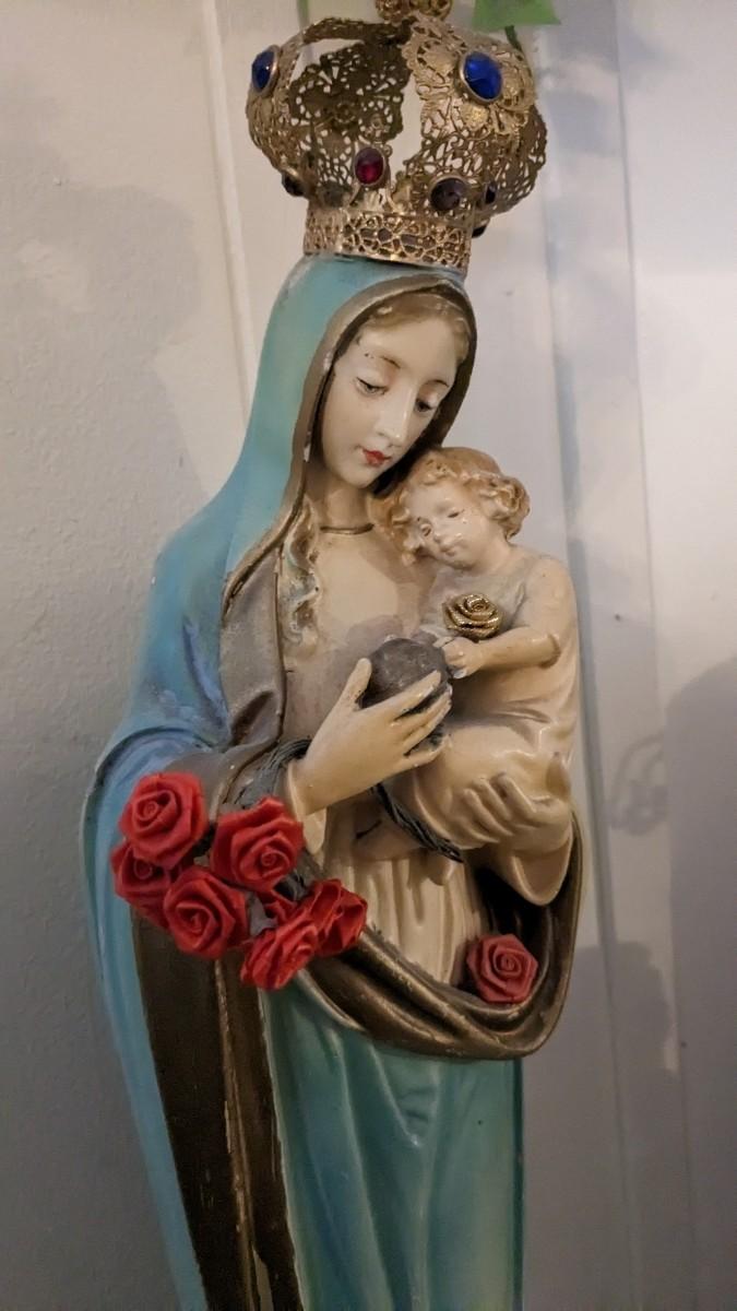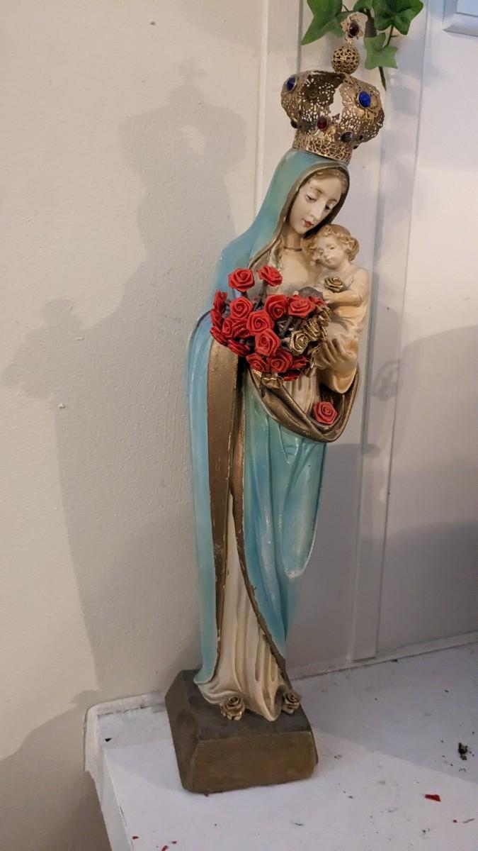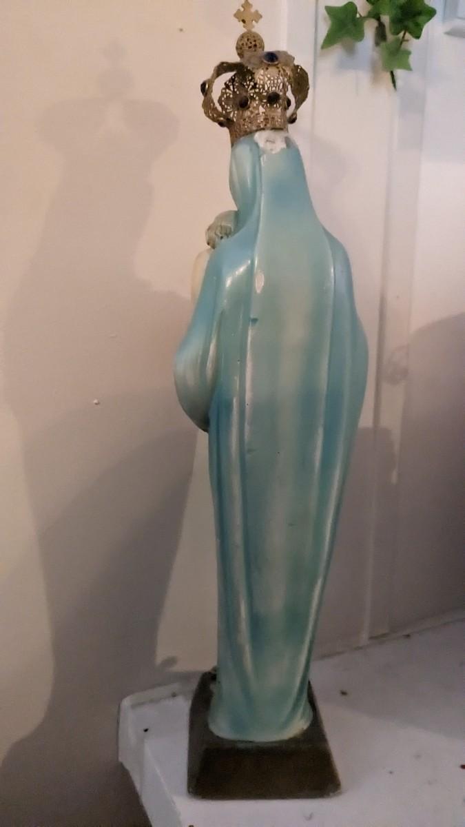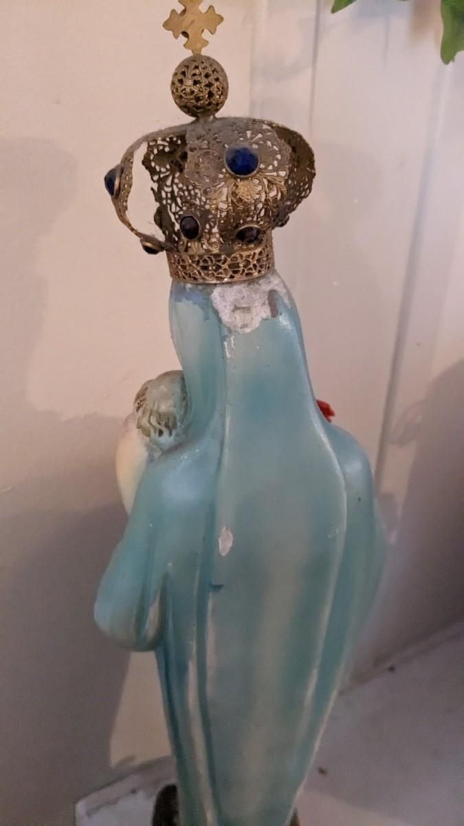 includes 1940 chalkware Sacred Mary in good condition for age with embellishments added, please note in photos. 2 other saints, 2 doves, framed Popes, framed Jesus', faux florals, and more! No shipping. Livingroomcorner