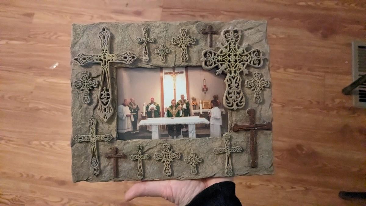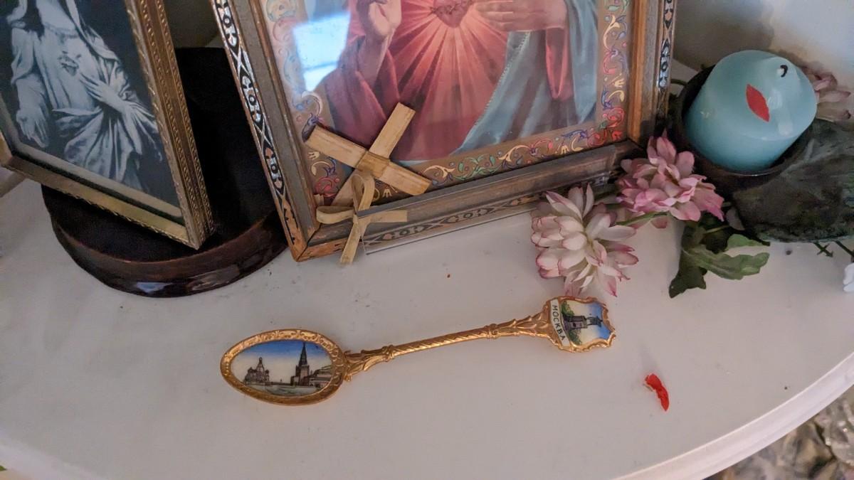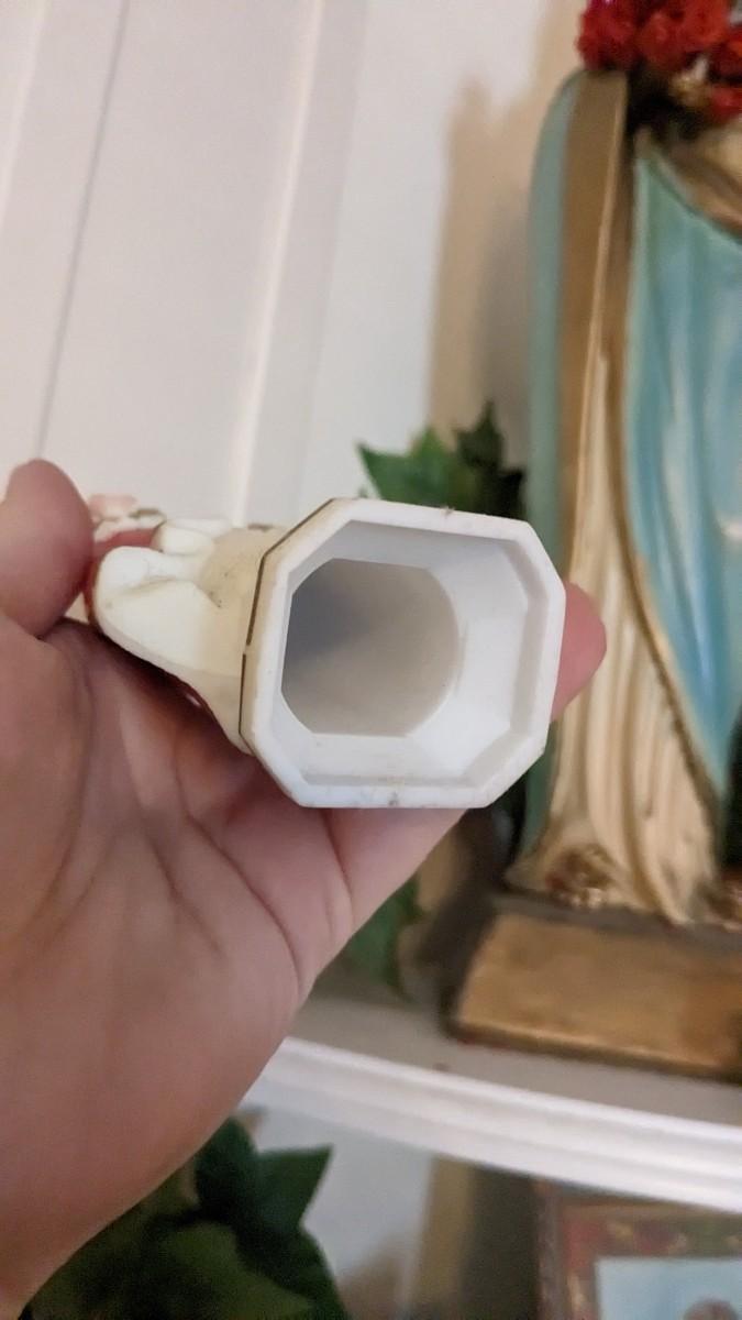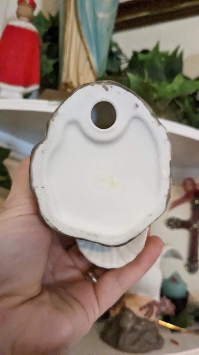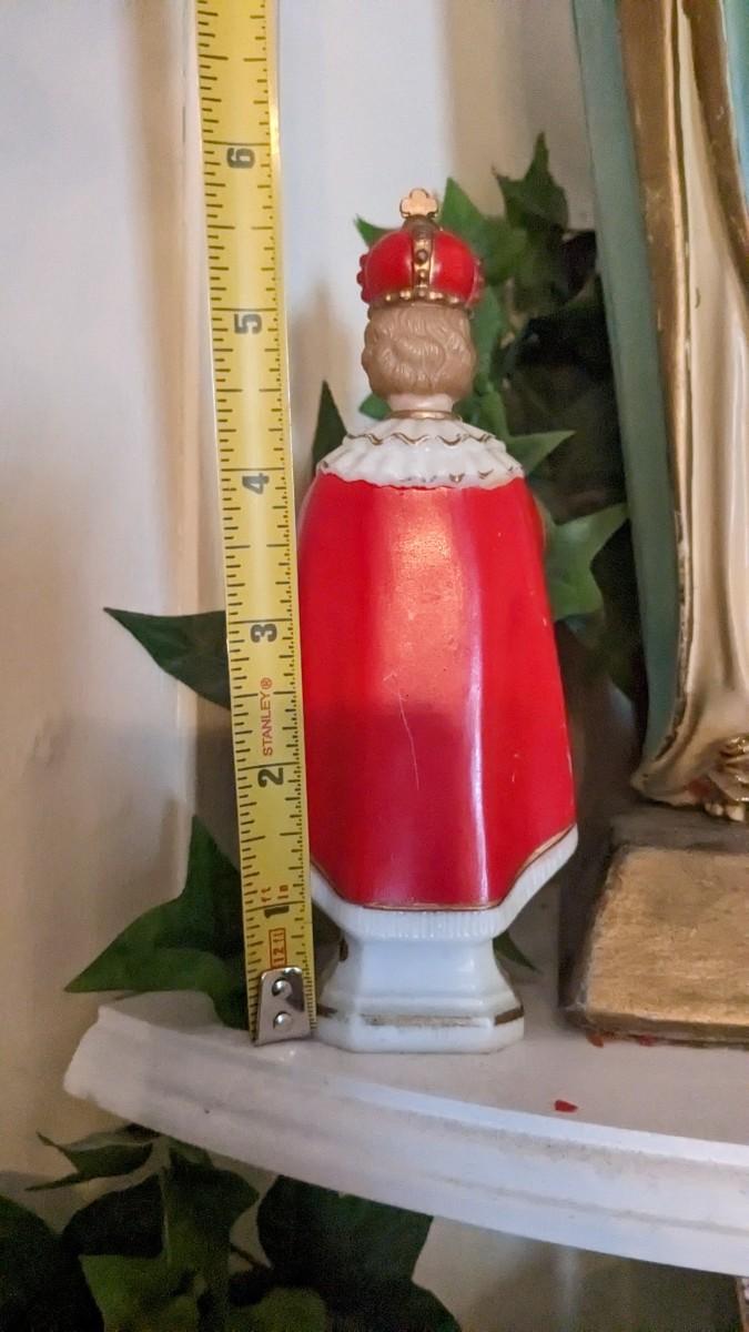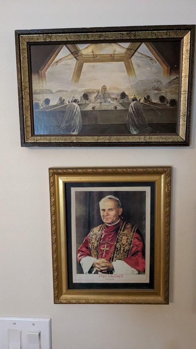 includes 1940 chalkware Sacred Mary in good condition for age with embellishments added, please note in photos. 2 other saints, 2 doves, framed Popes, framed Jesus', faux florals, and more! No shipping. Livingroomcorner