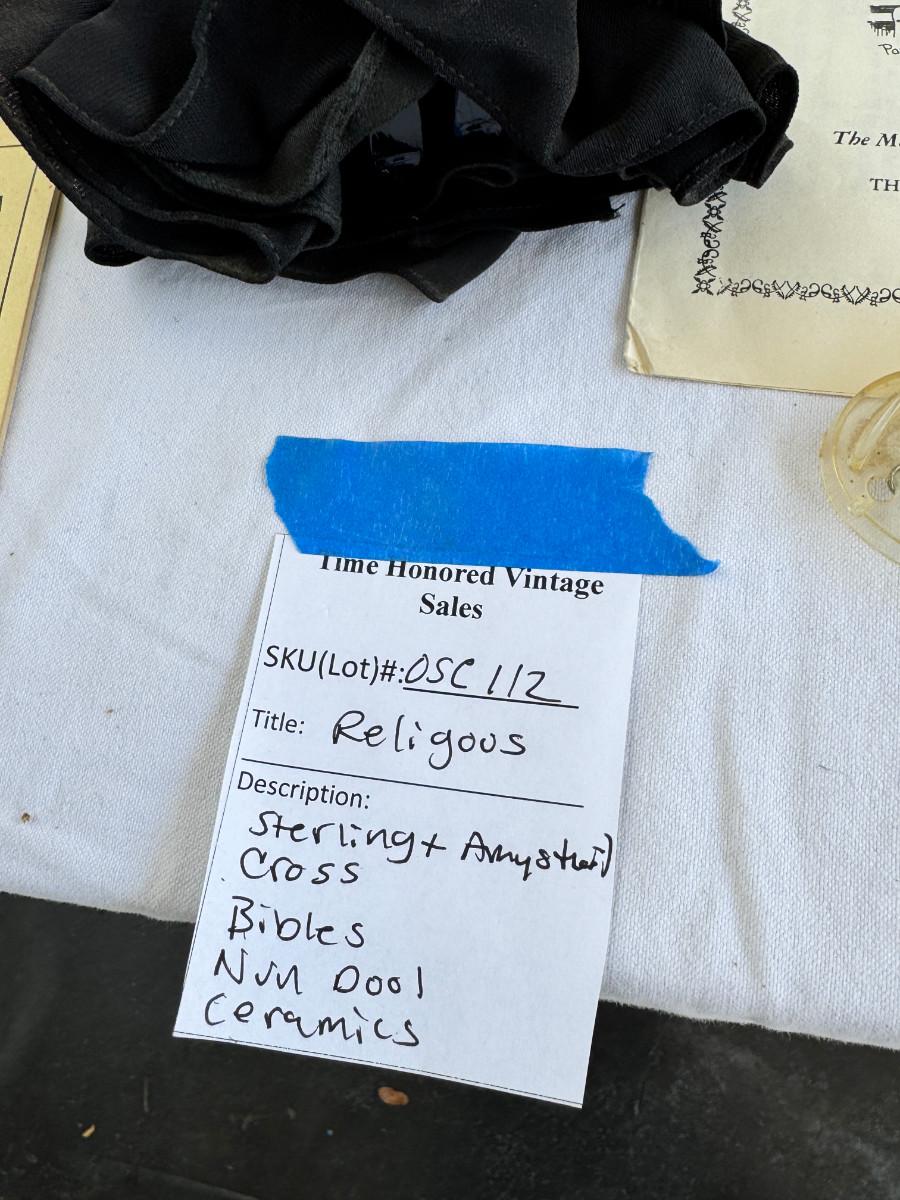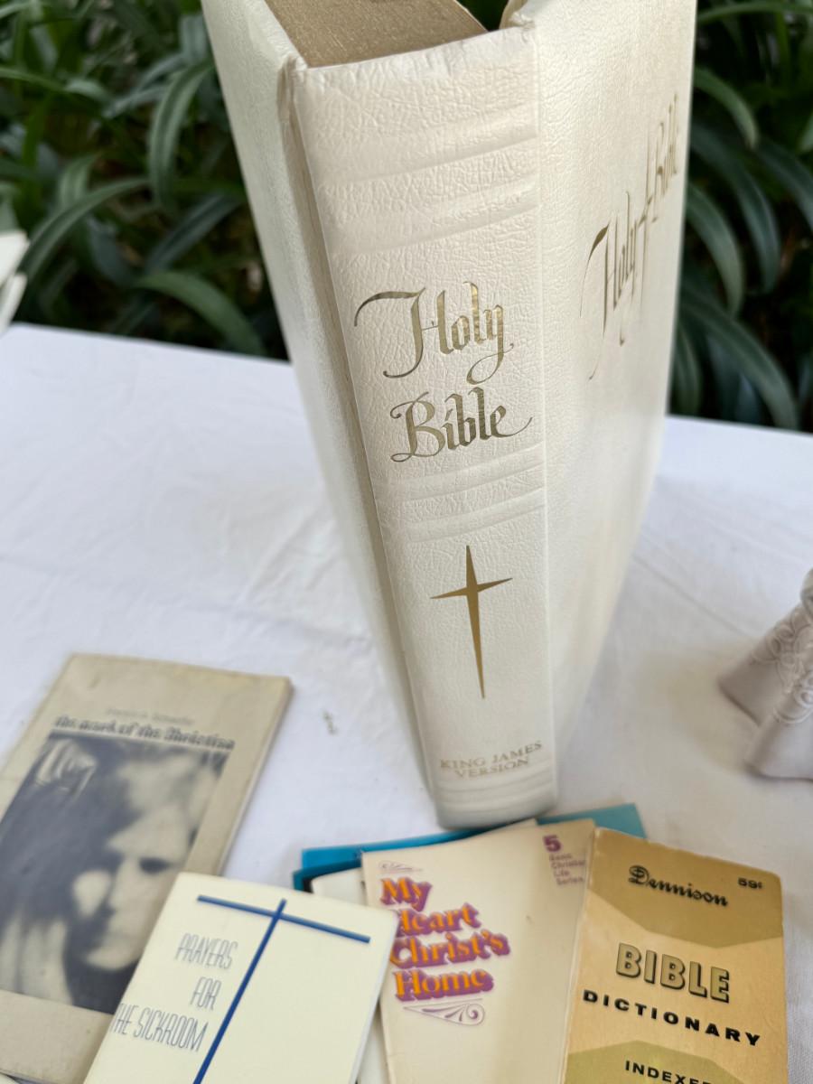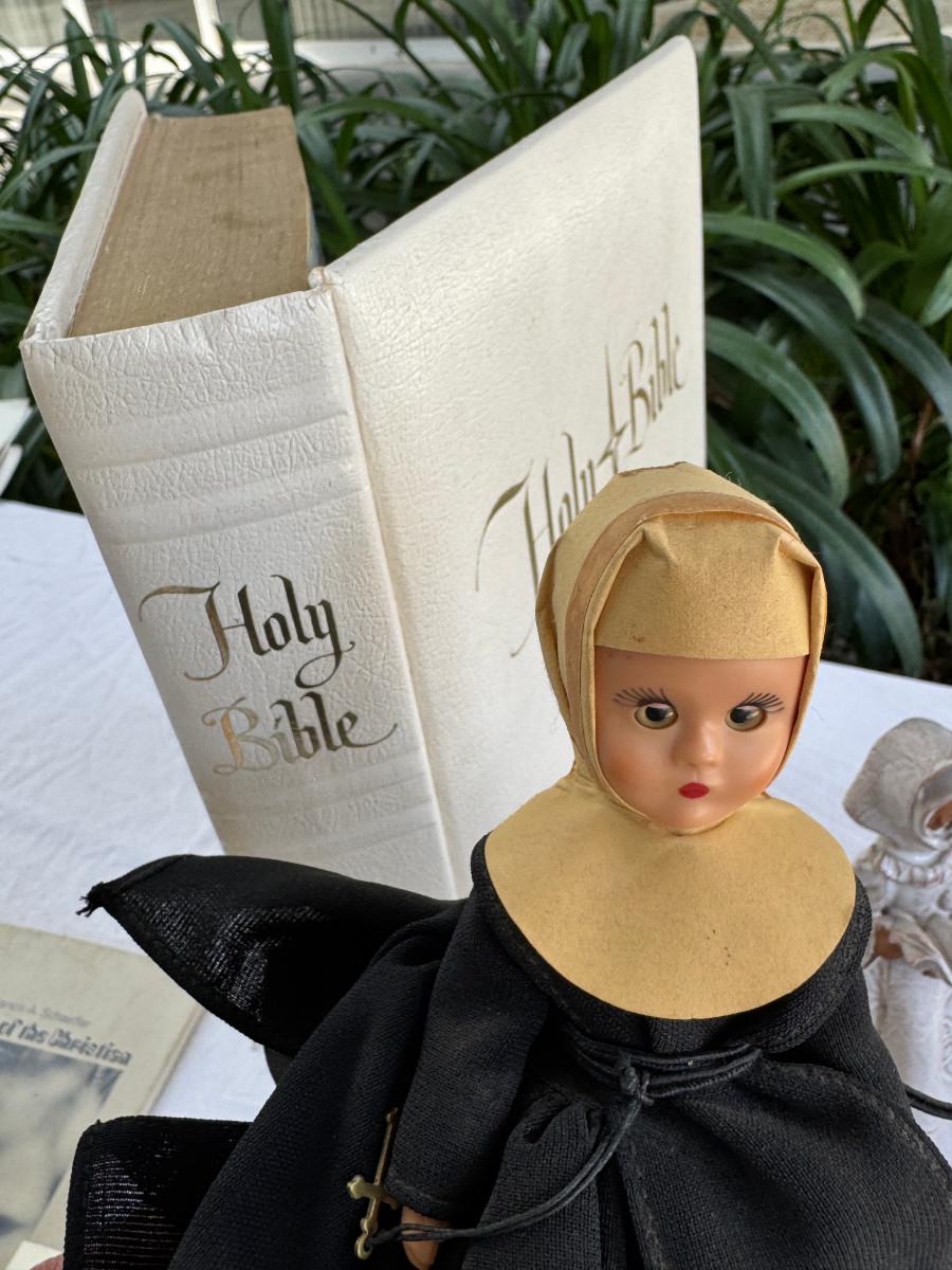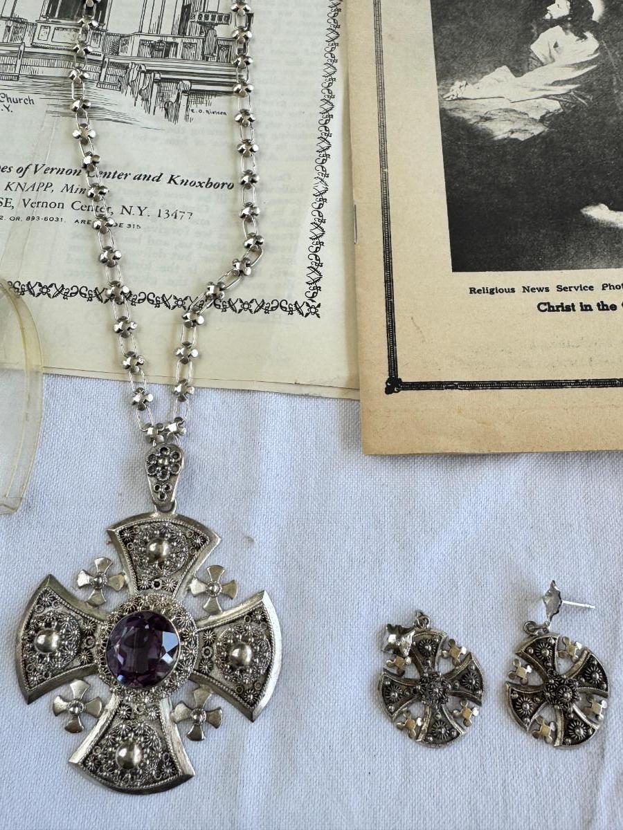 Religious sterling silver Jerusalem cross with Amethyst stone, Bibles Religious sterling silver Jerusalem cross Pendant with chain with Amethyst stone, Bibles ceramic nun reading Bible, Nun doll, praying hands, MCM religious texts 5 Bibles. Some writing and a top stain noted.