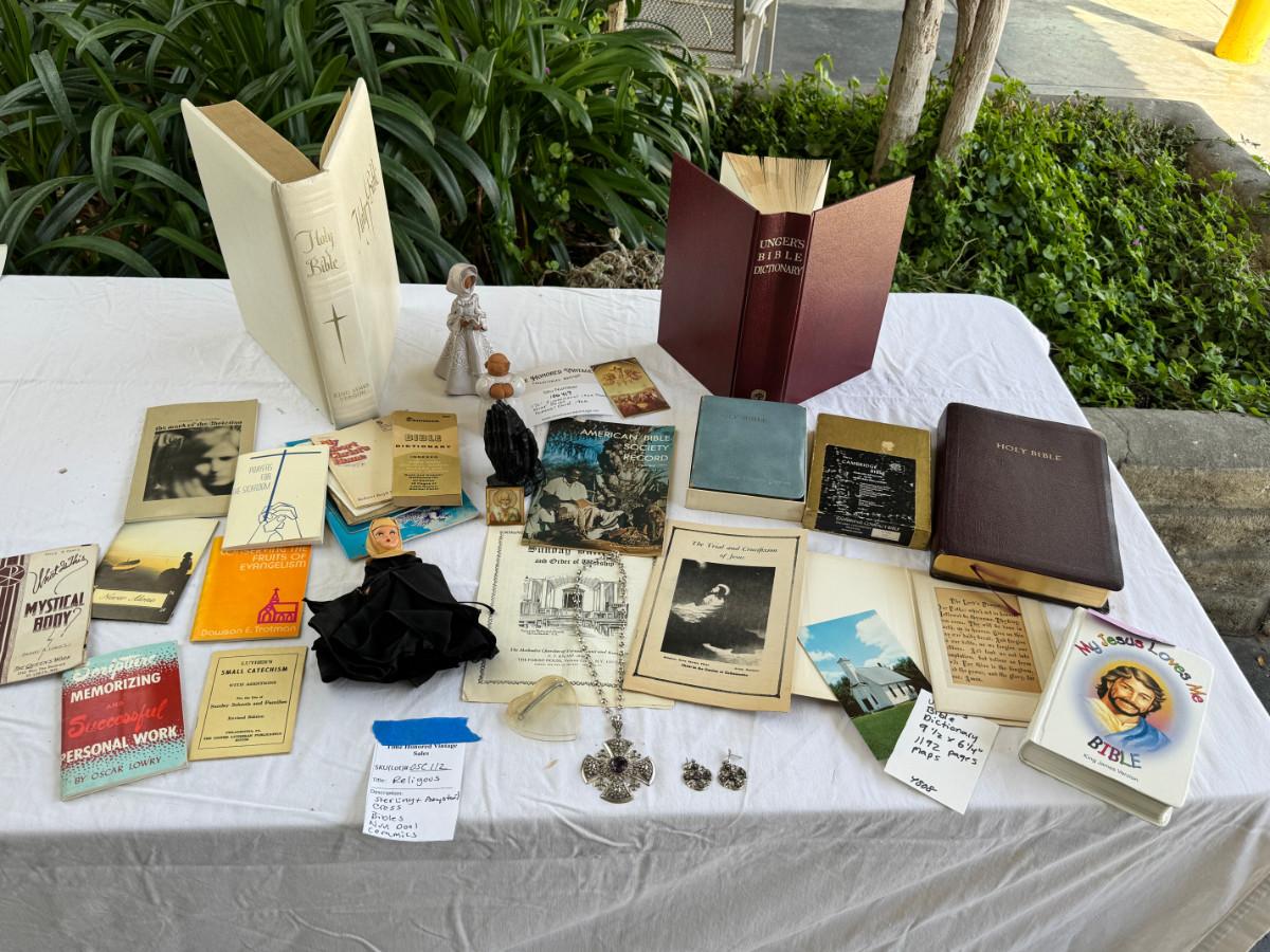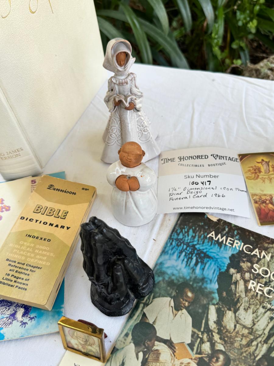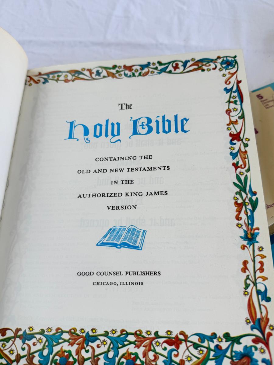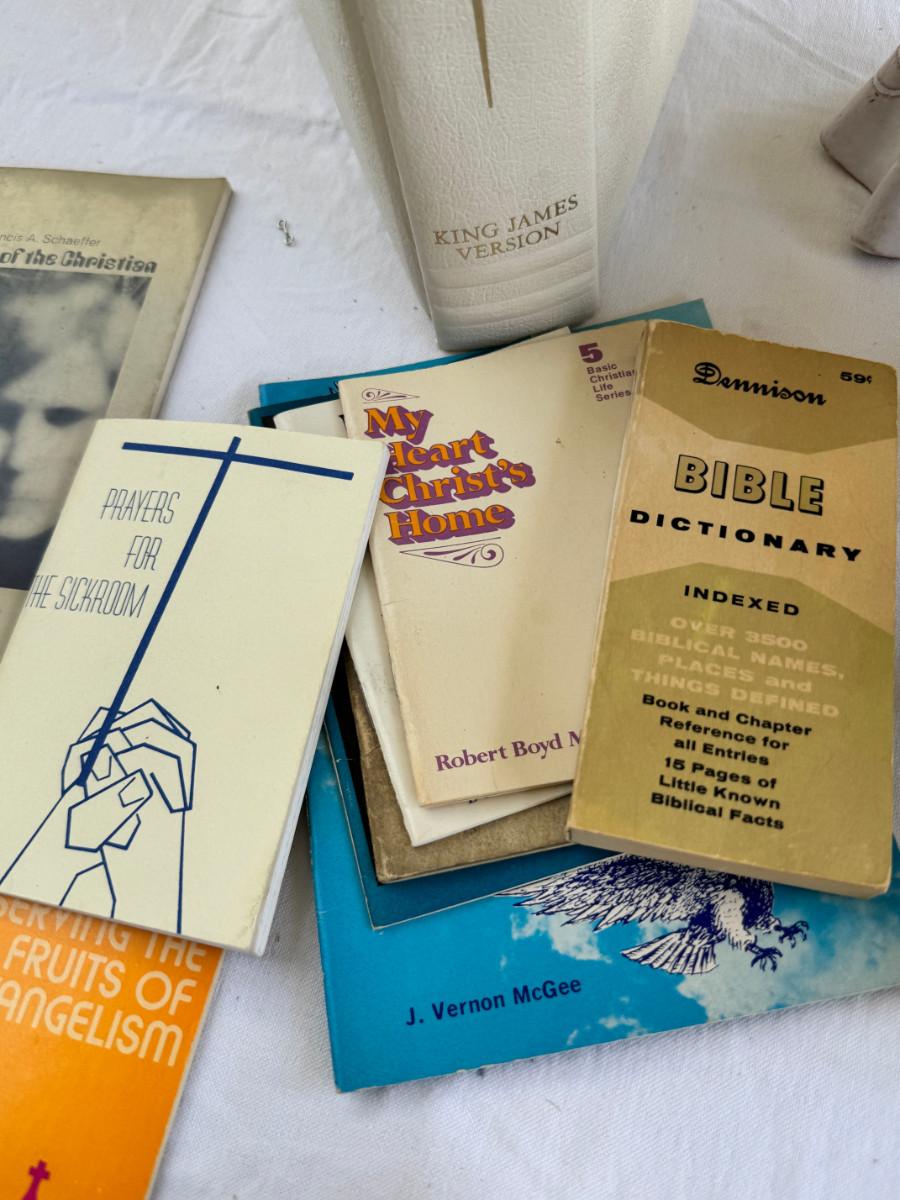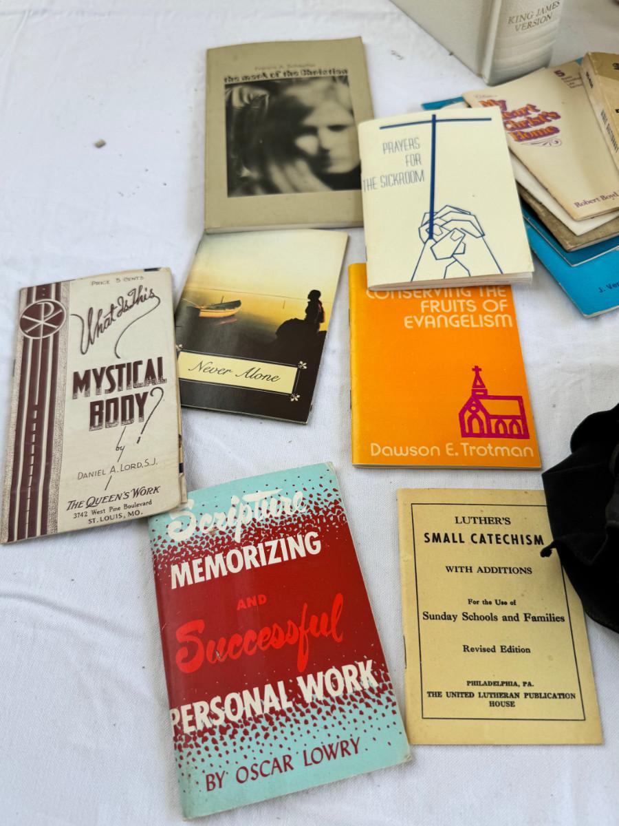 Religious sterling silver Jerusalem cross with Amethyst stone, Bibles Religious sterling silver Jerusalem cross Pendant with chain with Amethyst stone, Bibles ceramic nun reading Bible, Nun doll, praying hands, MCM religious texts 5 Bibles. Some writing and a top stain noted.