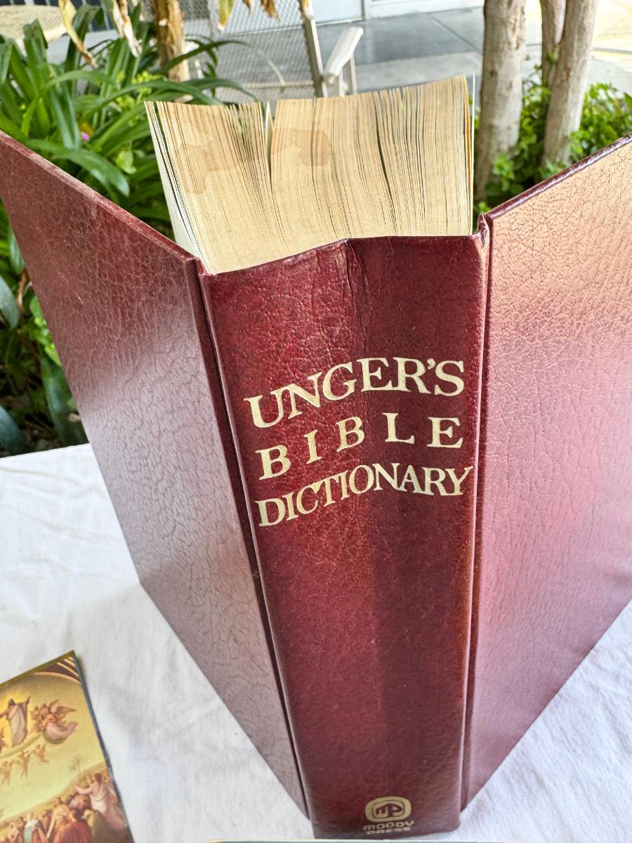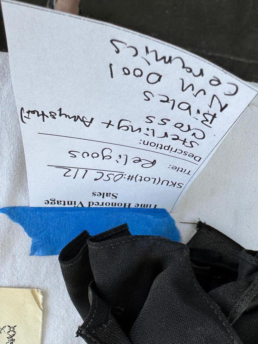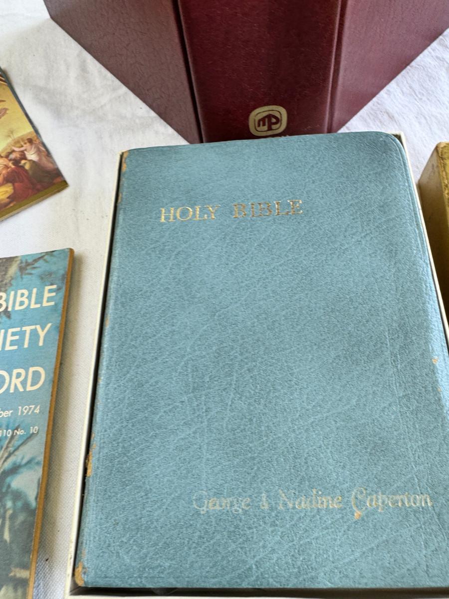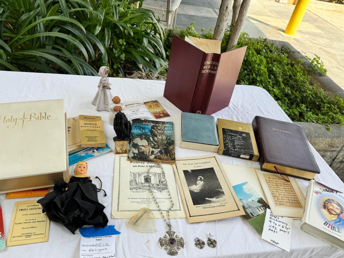 Religious sterling silver Jerusalem cross with Amethyst stone, Bibles Religious sterling silver Jerusalem cross Pendant with chain with Amethyst stone, Bibles ceramic nun reading Bible, Nun doll, praying hands, MCM religious texts 5 Bibles. Some writing and a top stain noted.