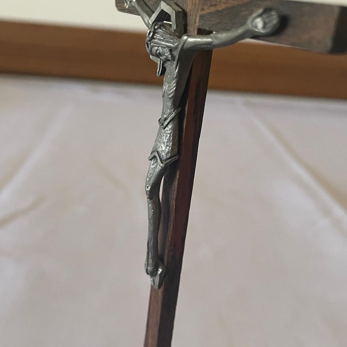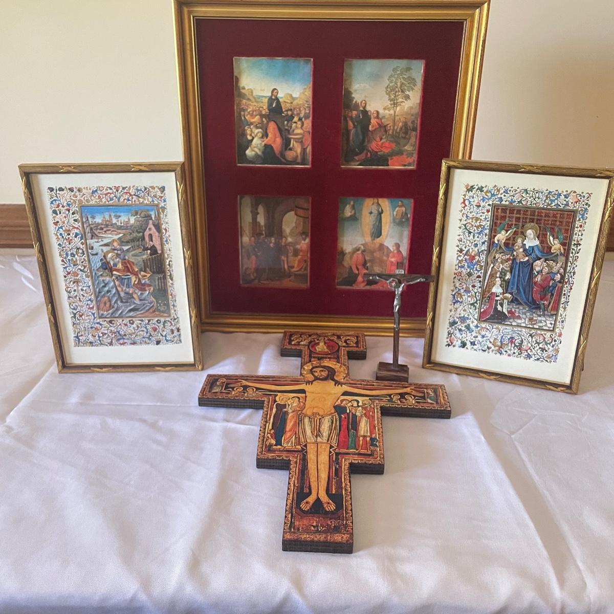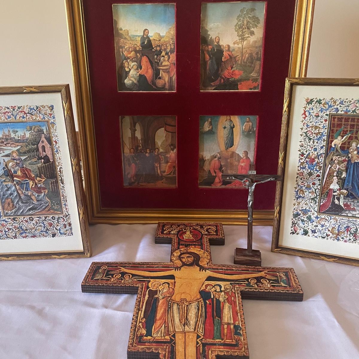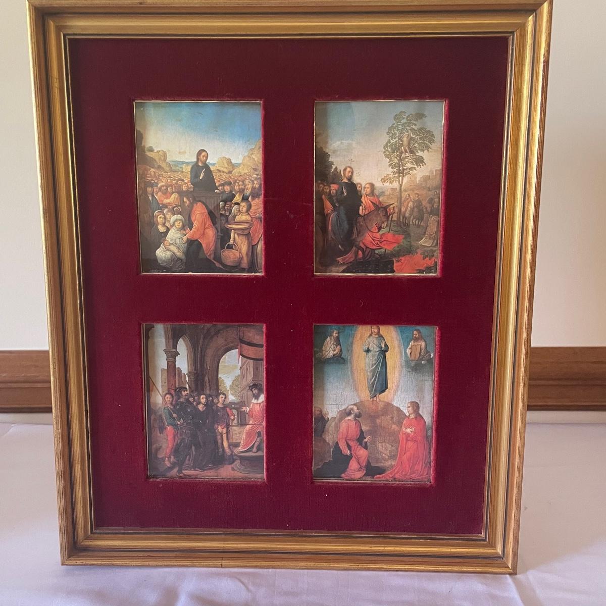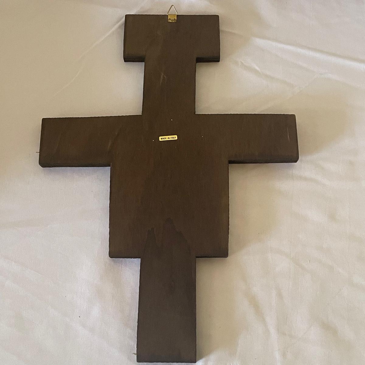 The smallest piece which is the crucifix was Made in Italy and is wood and pewter. Also Italian made is the larger wood cross piece which measures 15” x 11” x 0.5”. Lot also includes four prints in a gilded frame with a red velvet like matting and two more prints in matching gilded frames. An additional wood piece with a religious scene that measures 5” x 8” x 0.5” is included in lot.