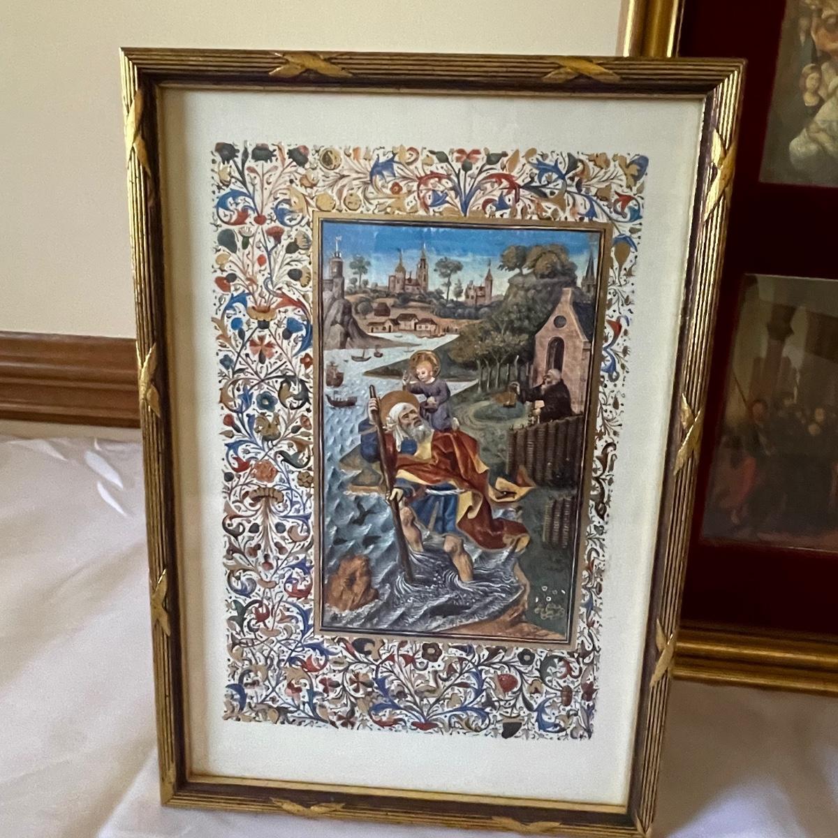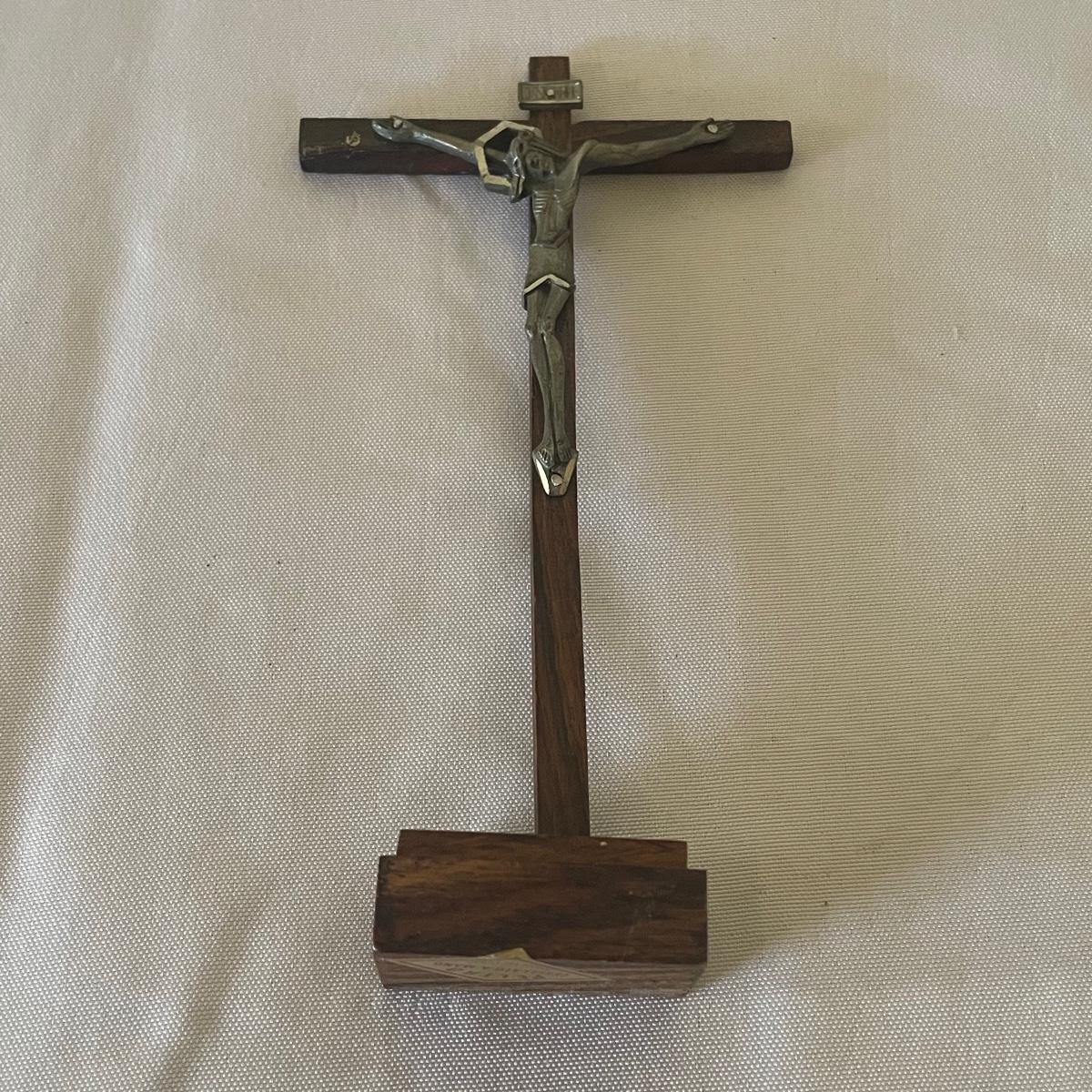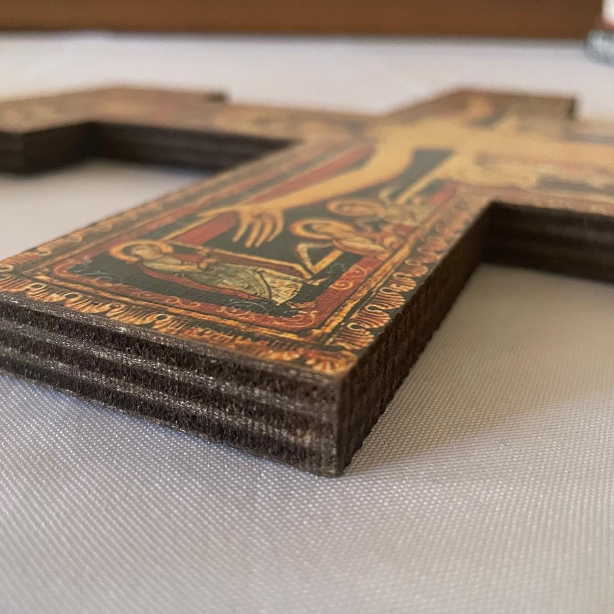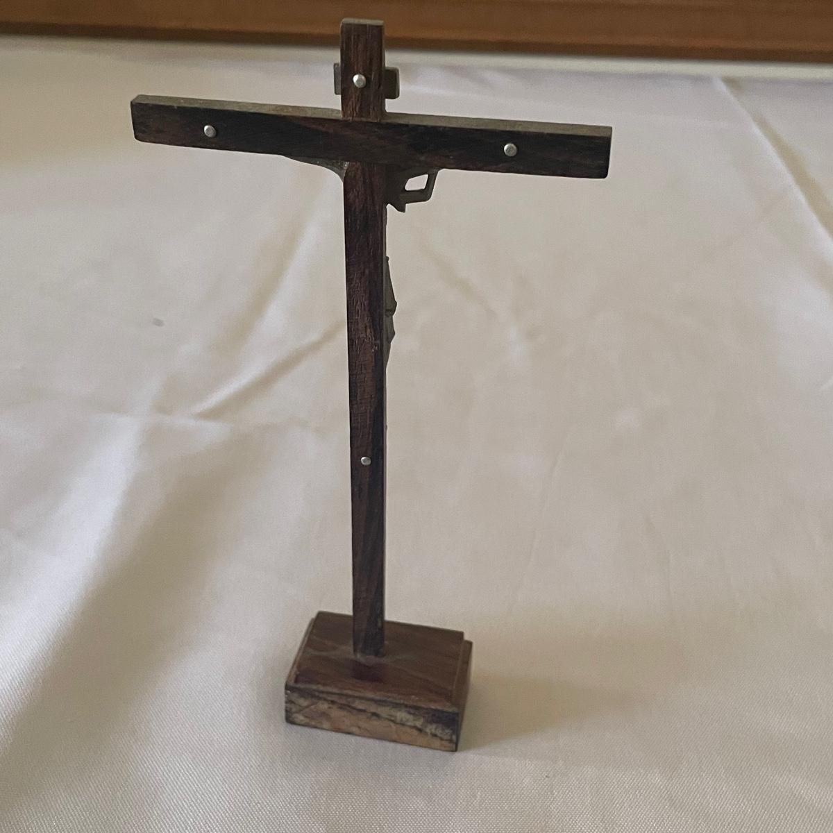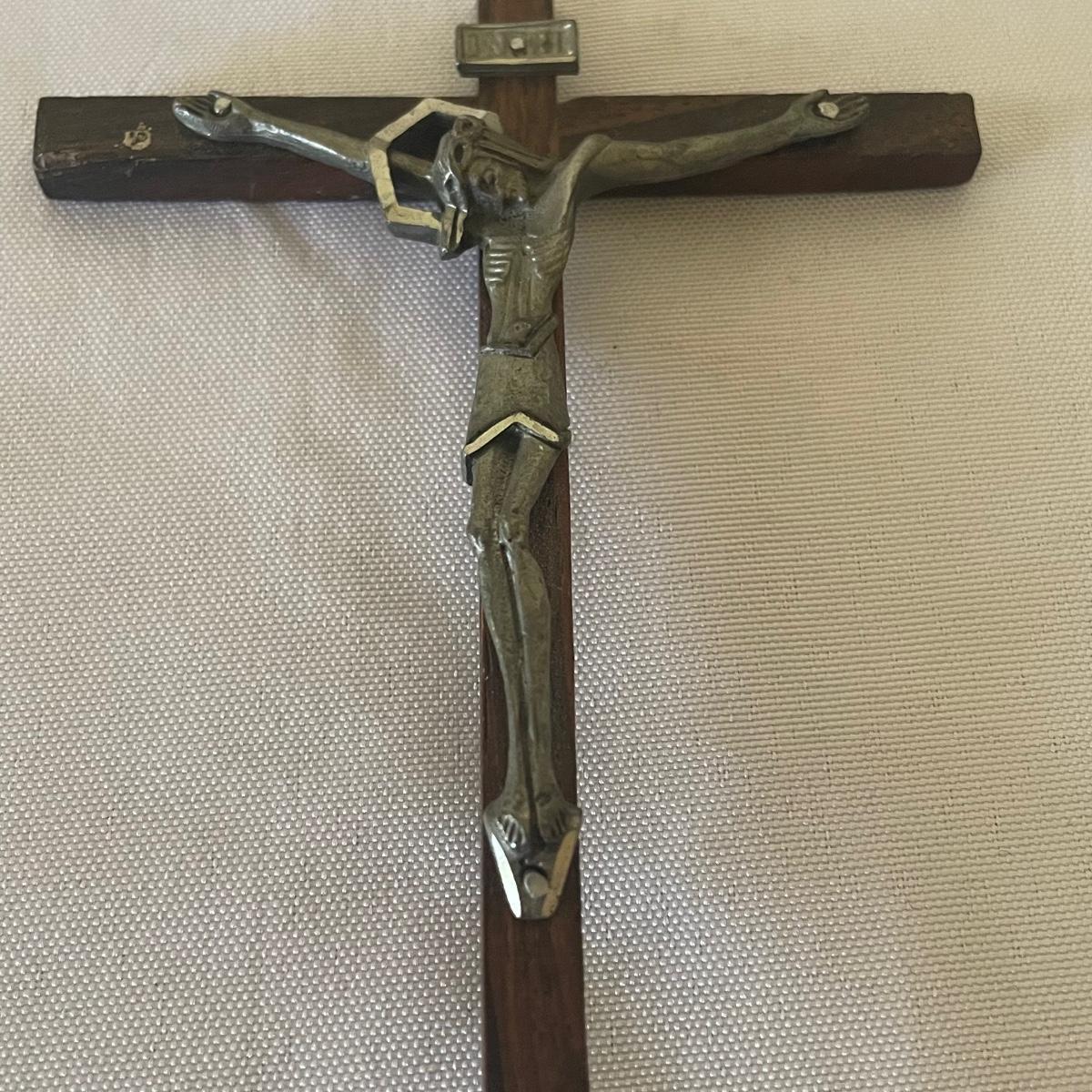 The smallest piece which is the crucifix was Made in Italy and is wood and pewter. Also Italian made is the larger wood cross piece which measures 15” x 11” x 0.5”. Lot also includes four prints in a gilded frame with a red velvet like matting and two more prints in matching gilded frames. An additional wood piece with a religious scene that measures 5” x 8” x 0.5” is included in lot.