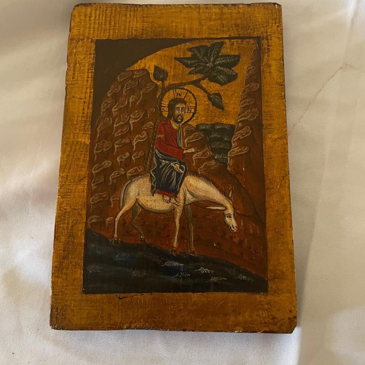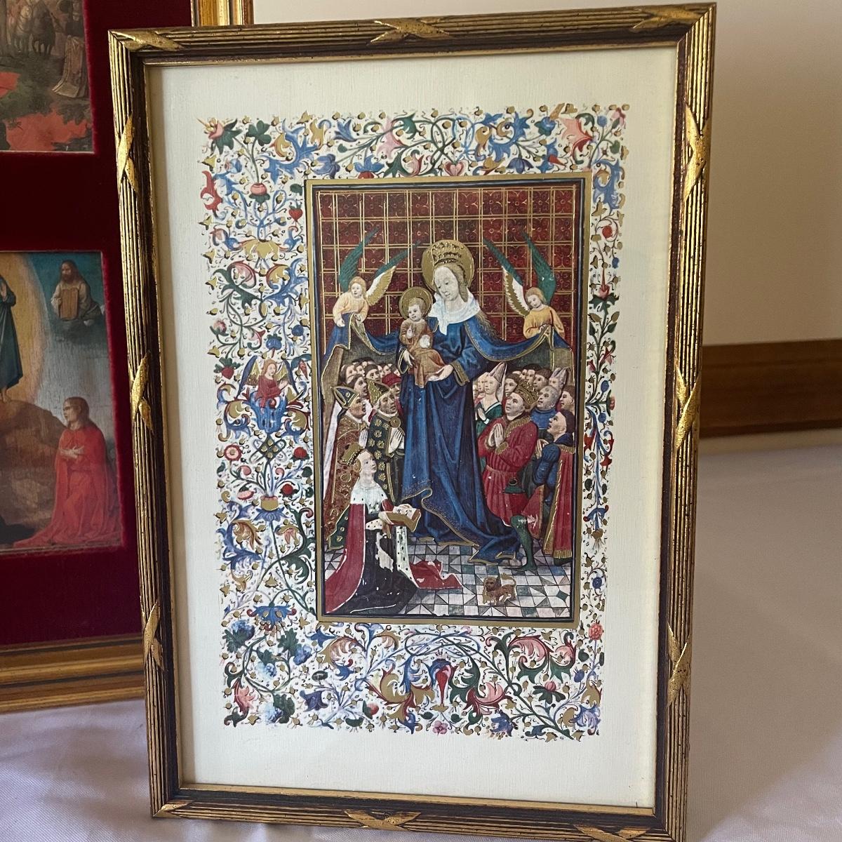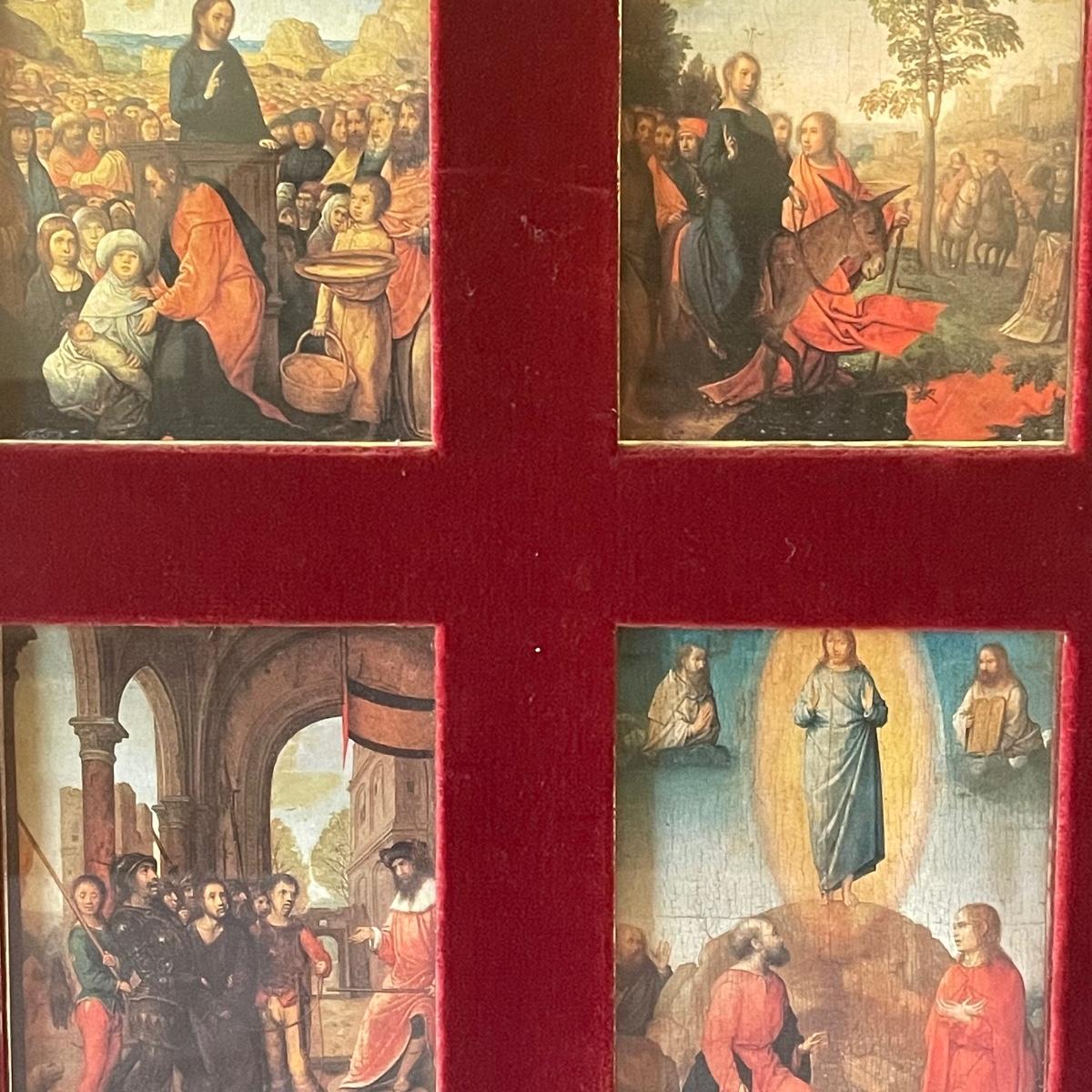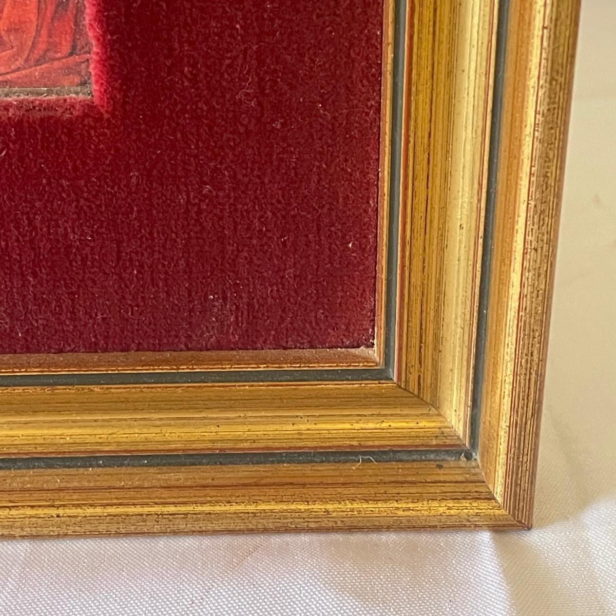 The smallest piece which is the crucifix was Made in Italy and is wood and pewter. Also Italian made is the larger wood cross piece which measures 15” x 11” x 0.5”. Lot also includes four prints in a gilded frame with a red velvet like matting and two more prints in matching gilded frames. An additional wood piece with a religious scene that measures 5” x 8” x 0.5” is included in lot.