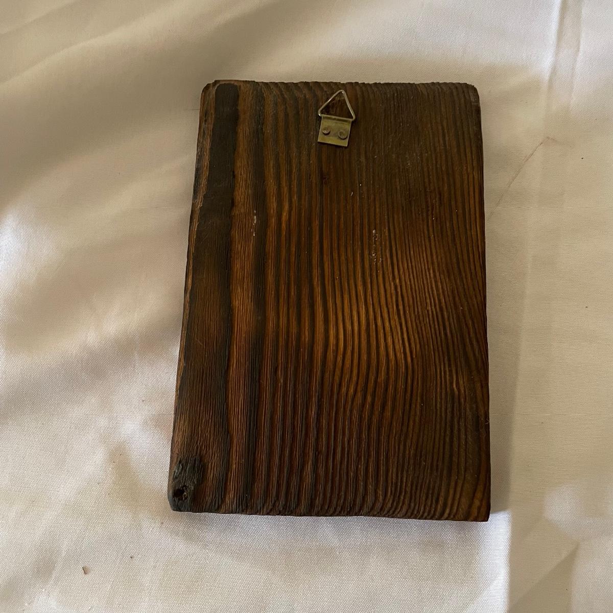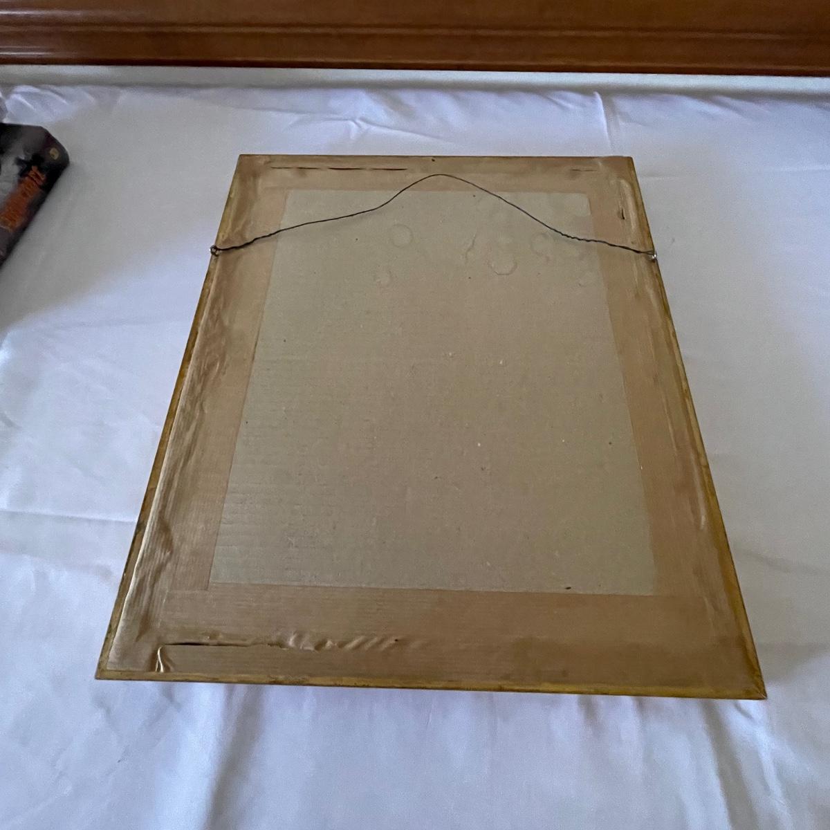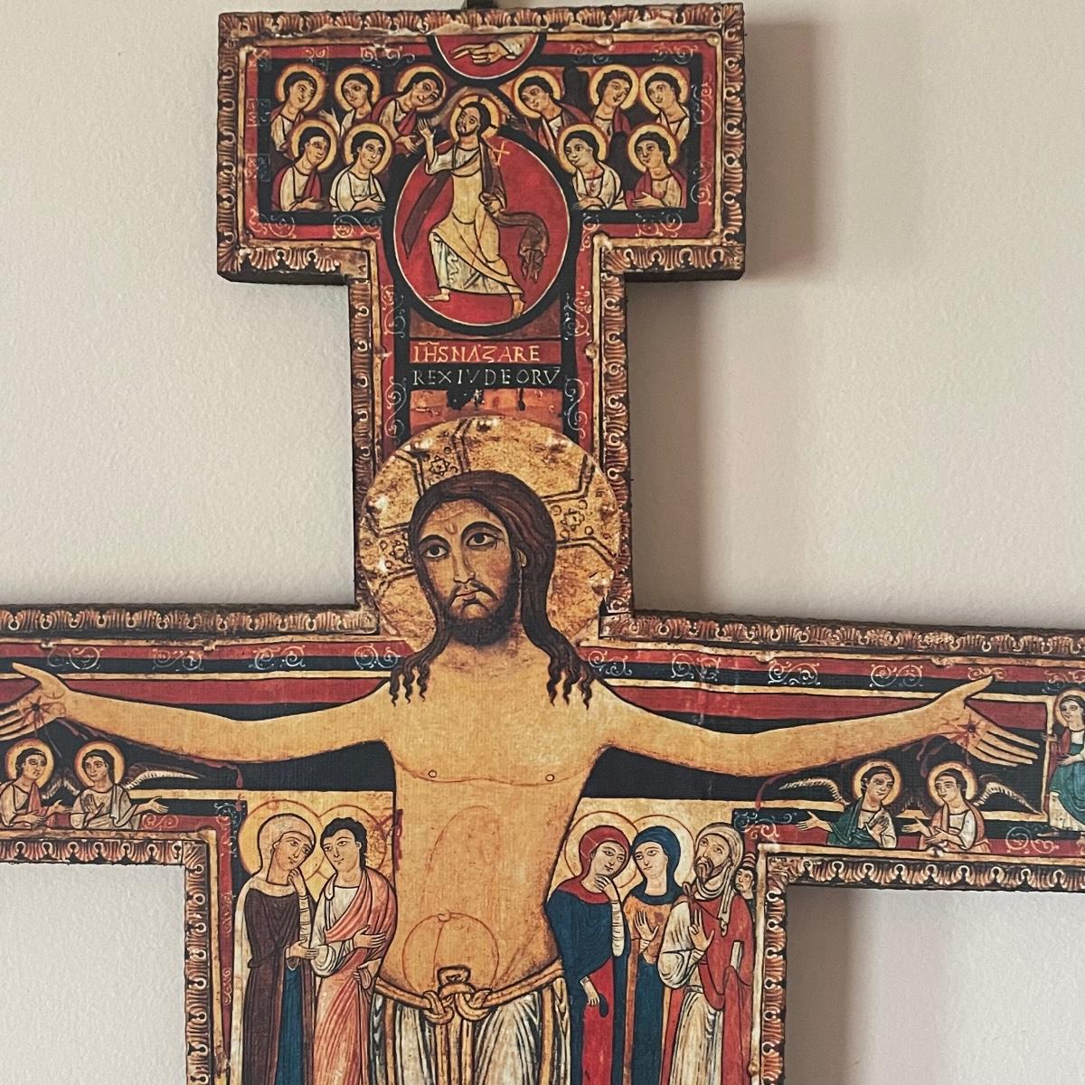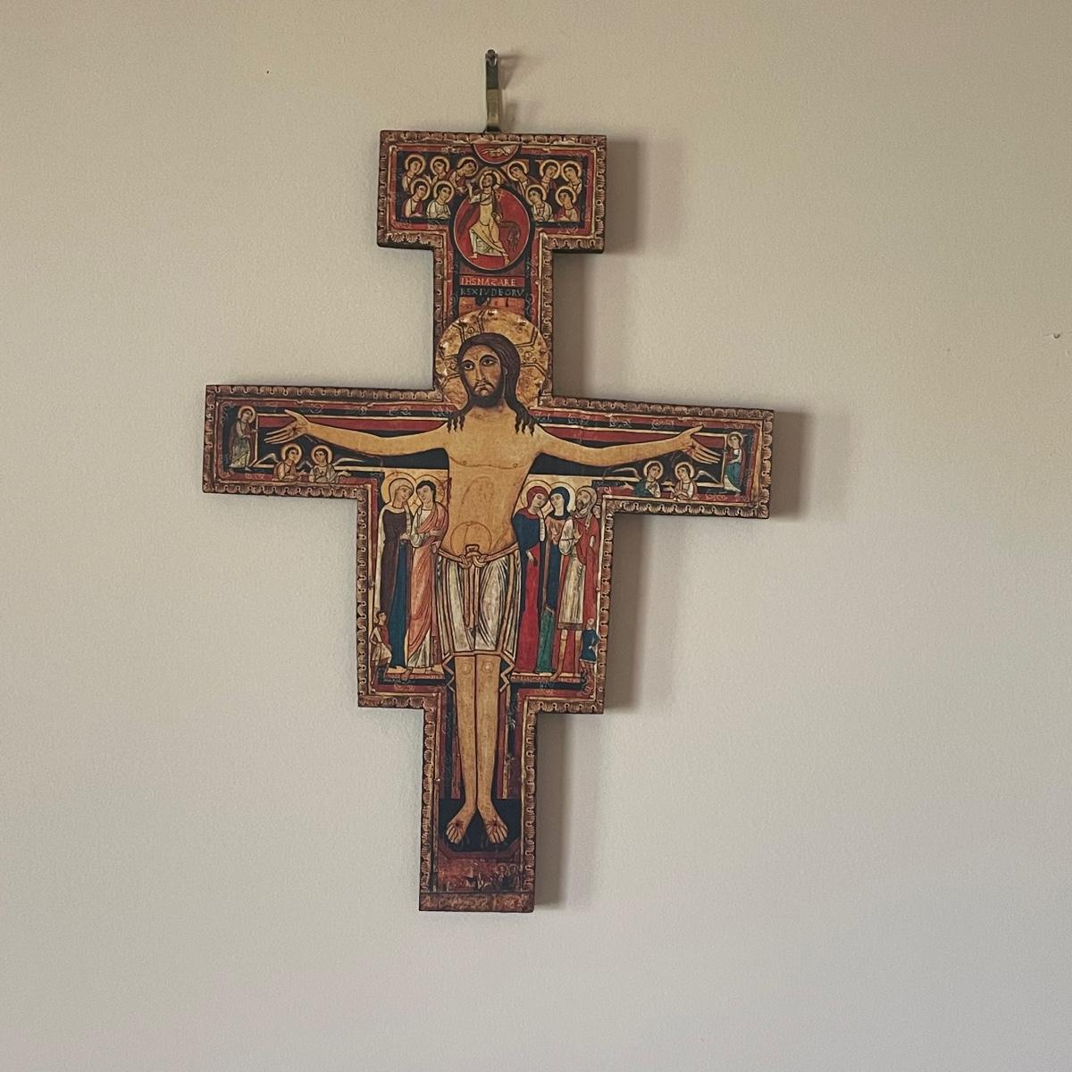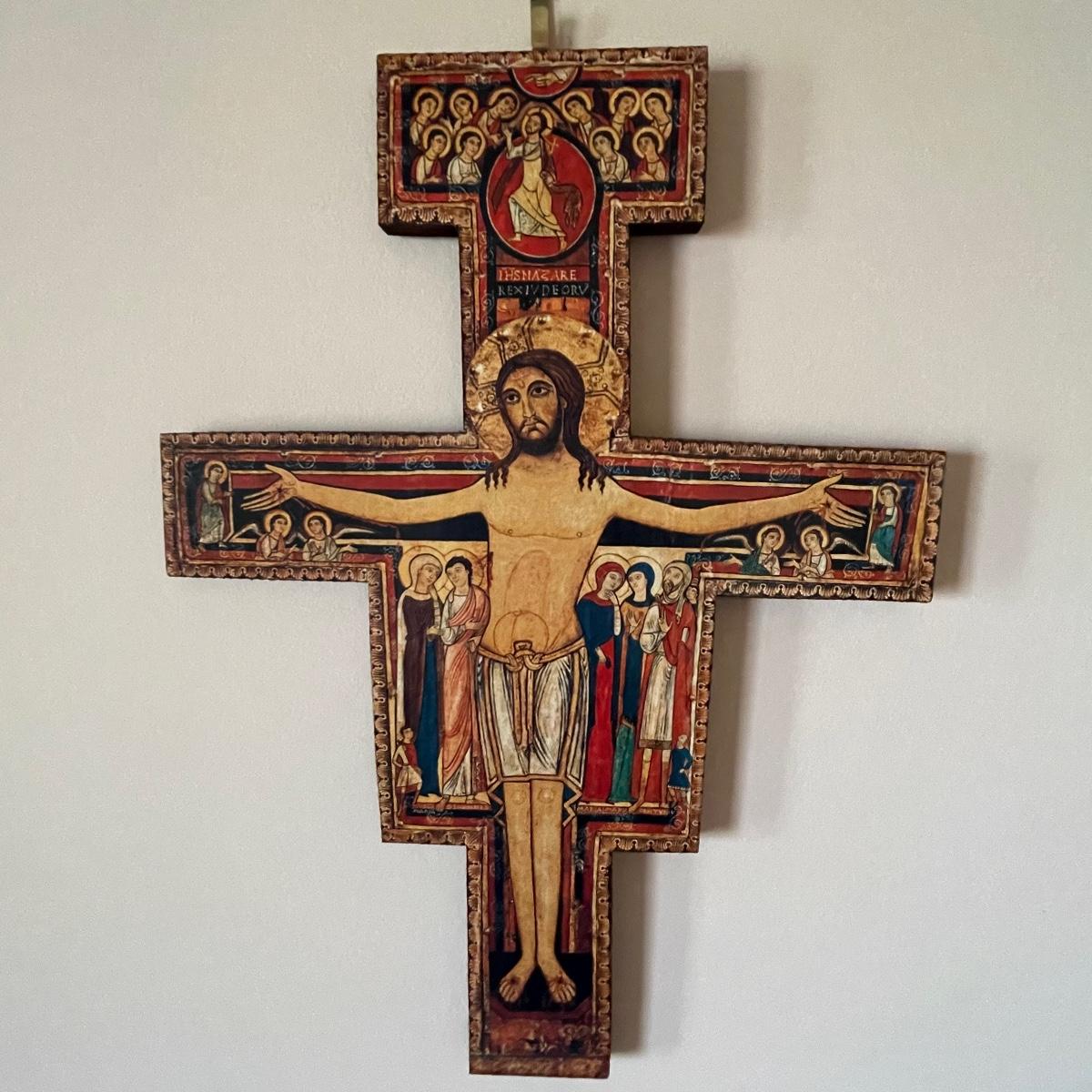 The smallest piece which is the crucifix was Made in Italy and is wood and pewter. Also Italian made is the larger wood cross piece which measures 15” x 11” x 0.5”. Lot also includes four prints in a gilded frame with a red velvet like matting and two more prints in matching gilded frames. An additional wood piece with a religious scene that measures 5” x 8” x 0.5” is included in lot.