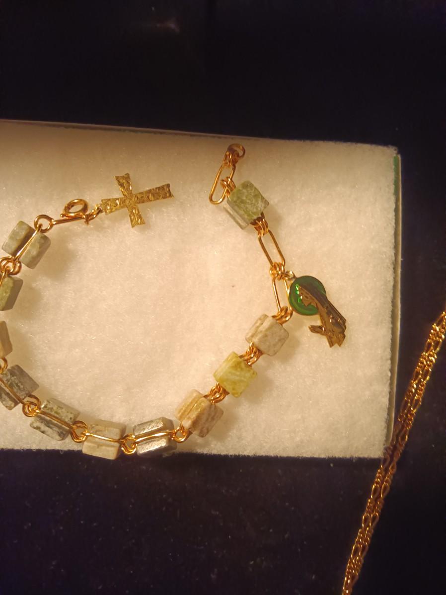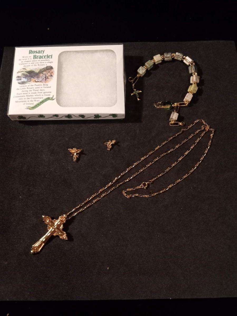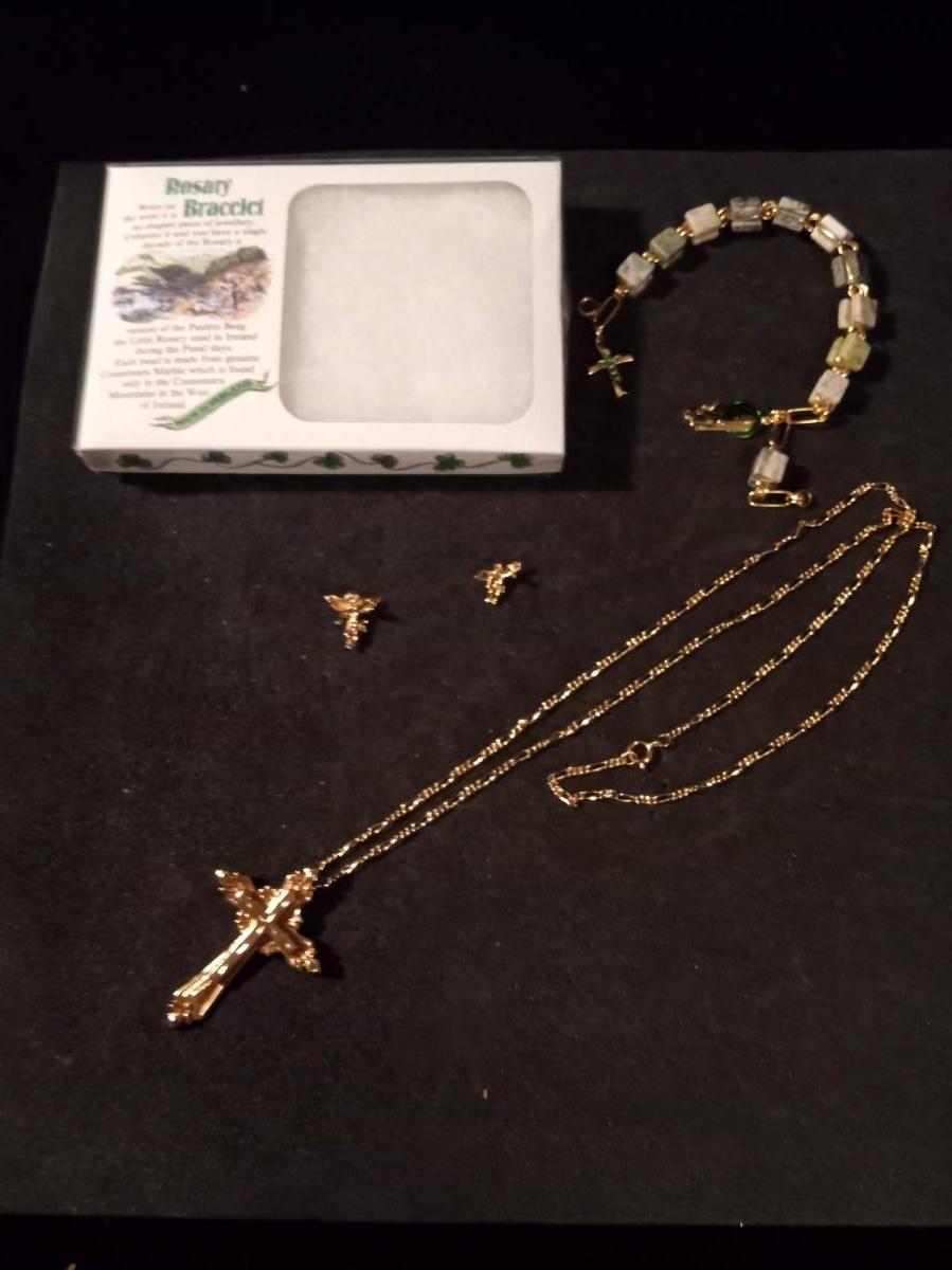 ROSARY BRACELET, CROSS PENDANT NECKLACE AND ANGEL PINS