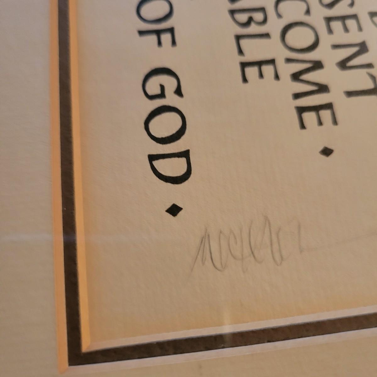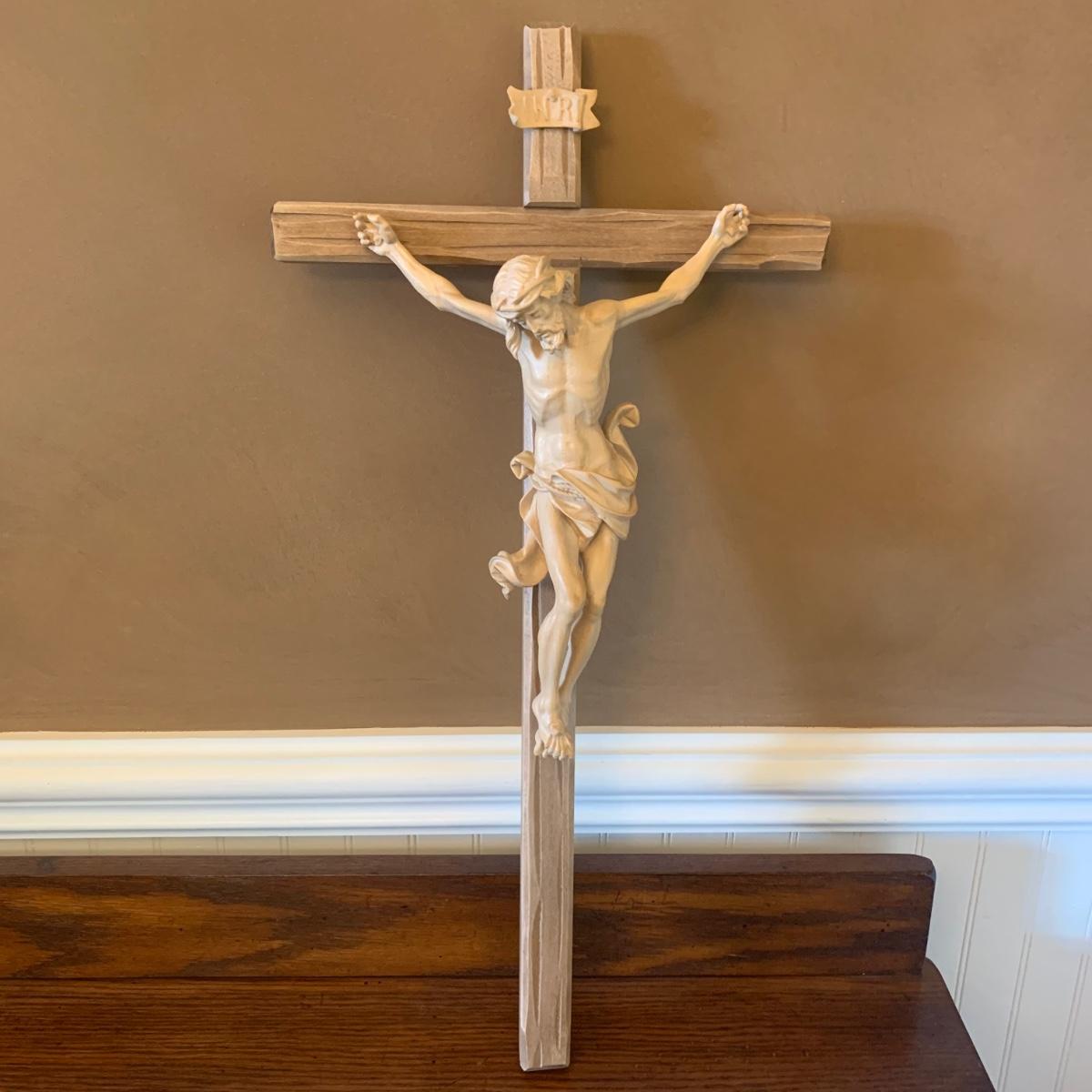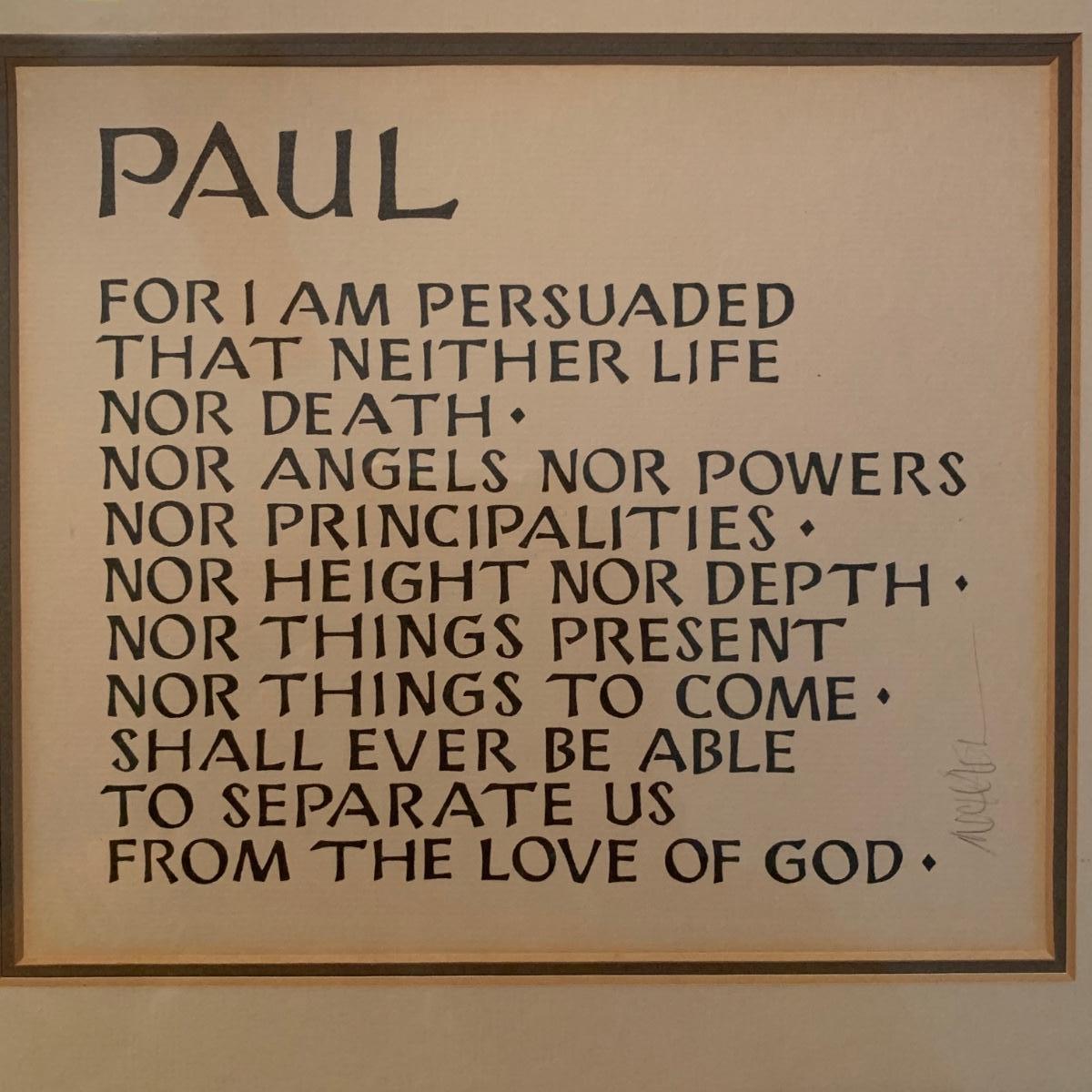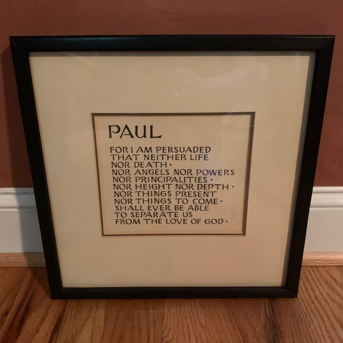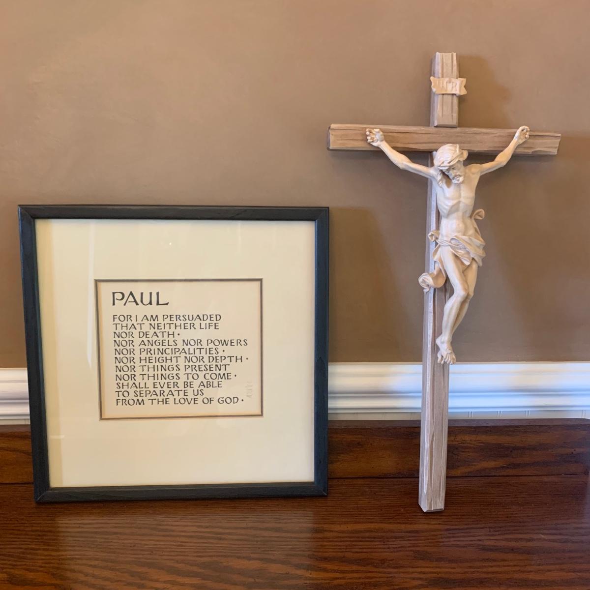 Framed Paul artwork behind glass with woodcarving of Jesus on cross. Woodcarving of Jesus was handcrafted in Italy. Framed “Paul” artwork is in black painted wood frame with hanging wire. It is pencil signed with the name Michael. Frame measures approximately 14” x 14”.