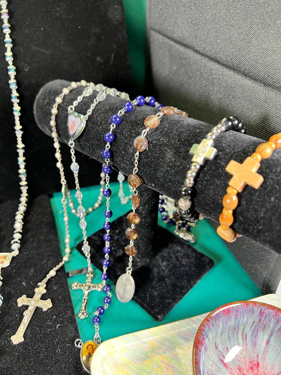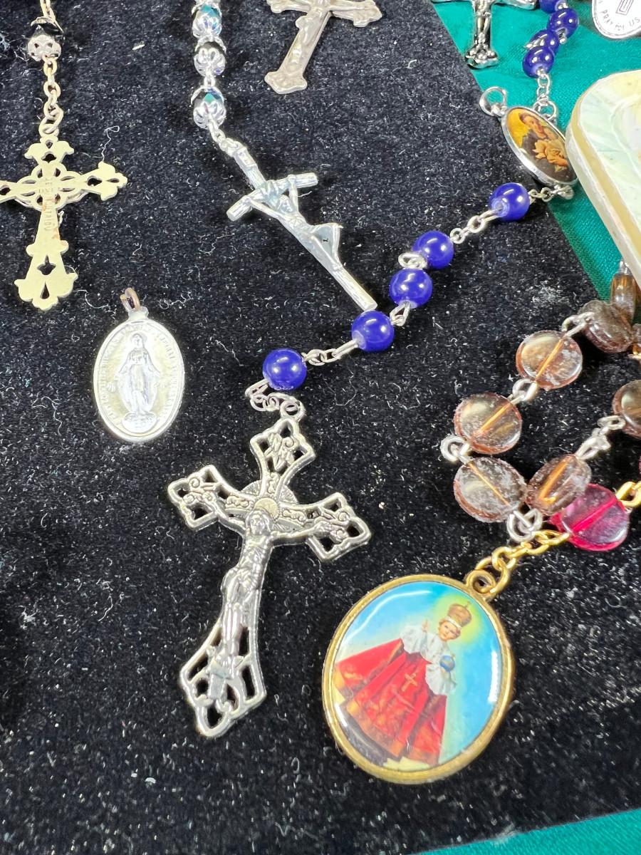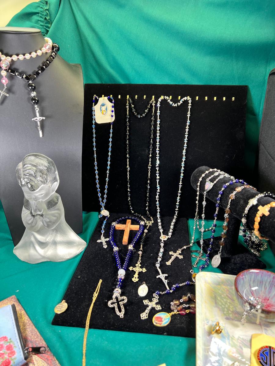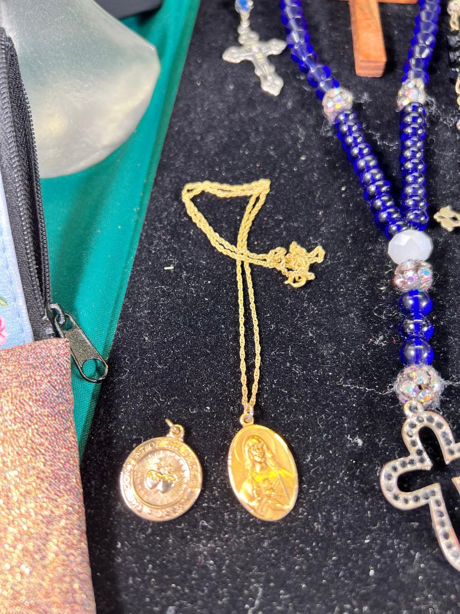2 14K medallions 1 with chain also 14K, Rosary s, Crosses, bracelets with crosses, Jesus, Mary pouches, Viking Glass Company, Praying child glass statue, offering trays (2) small ceramic bowl.