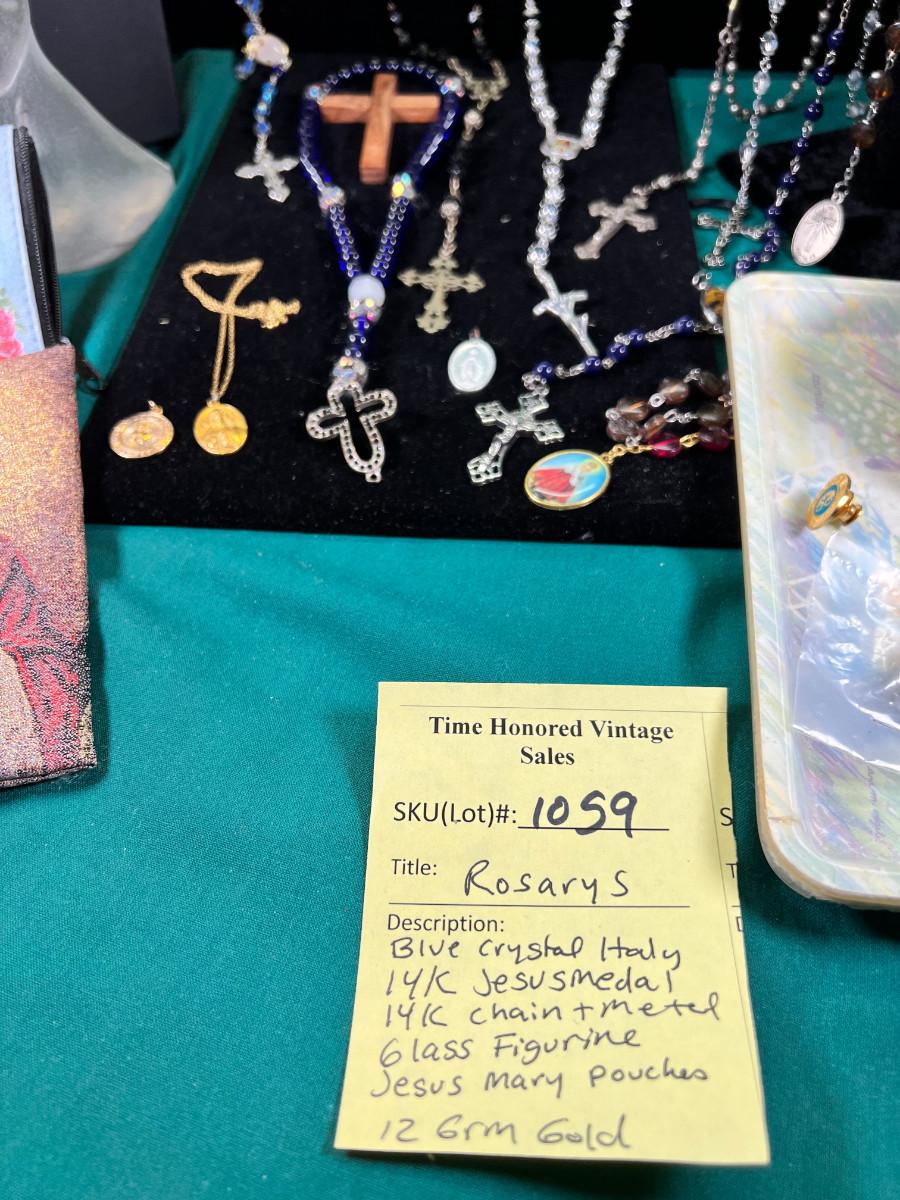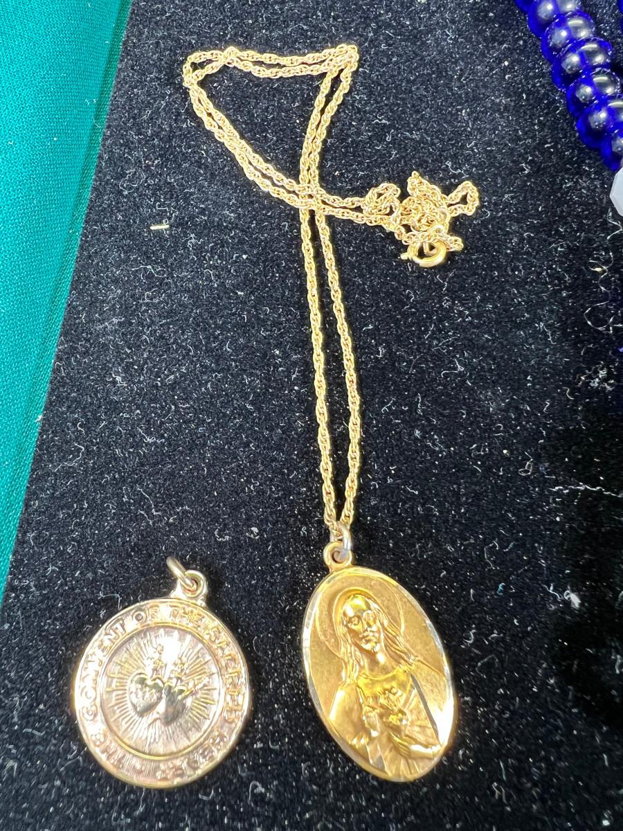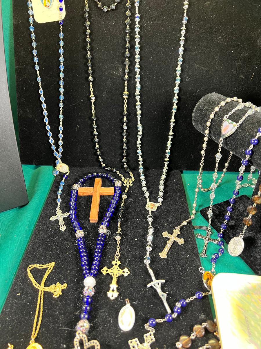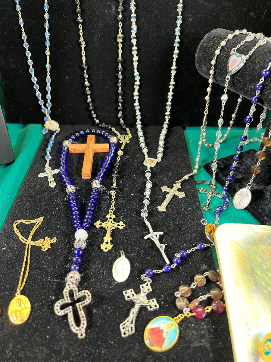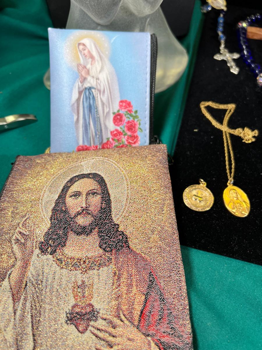 2 14K medallions 1 with chain also 14K, Rosary s, Crosses, bracelets with crosses, Jesus, Mary pouches, Viking Glass Company, Praying child glass statue, offering trays (2) small ceramic bowl.
