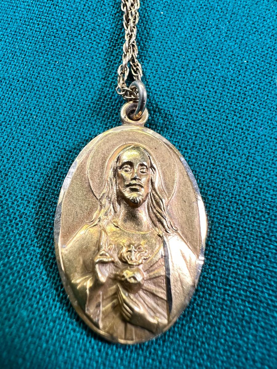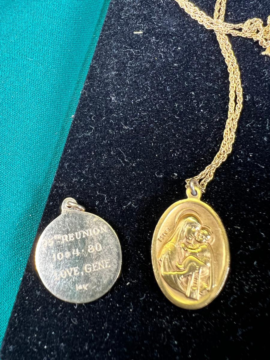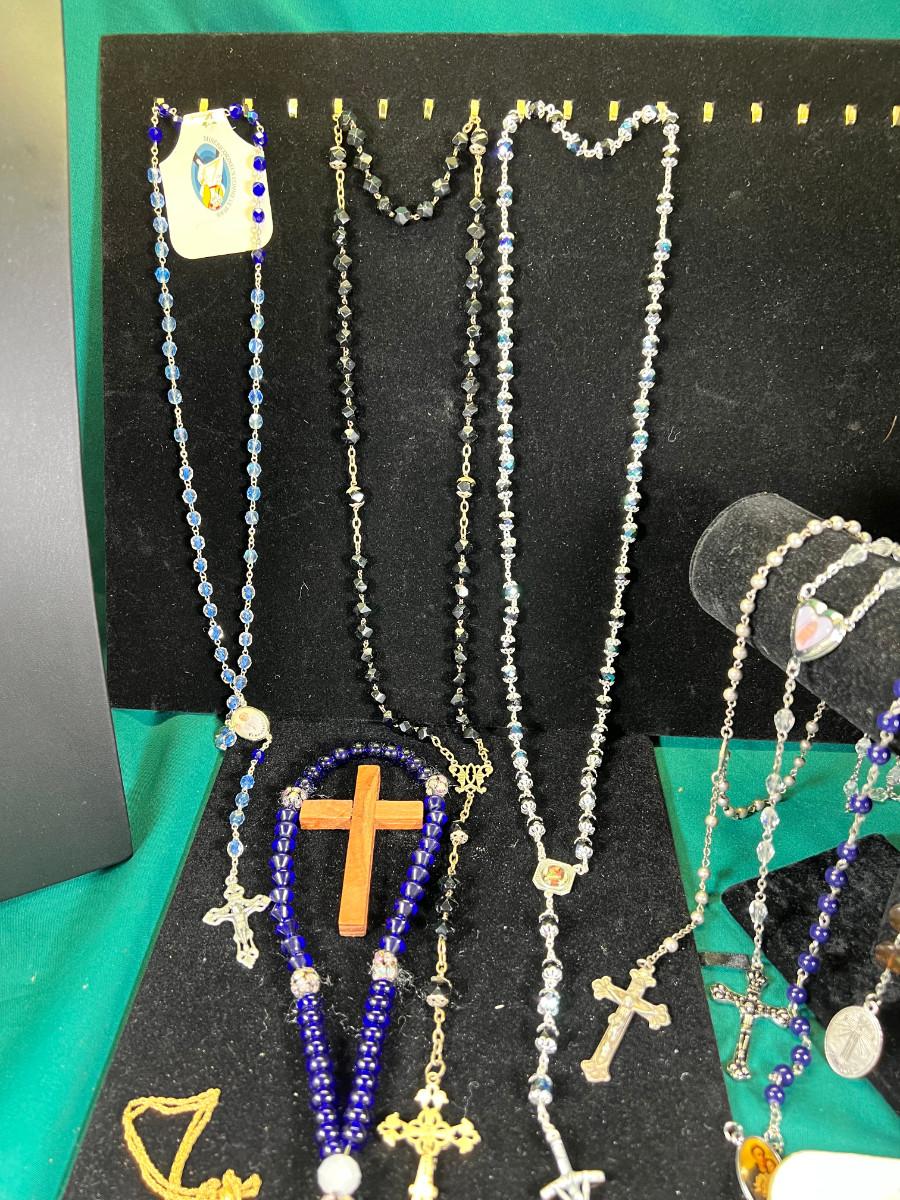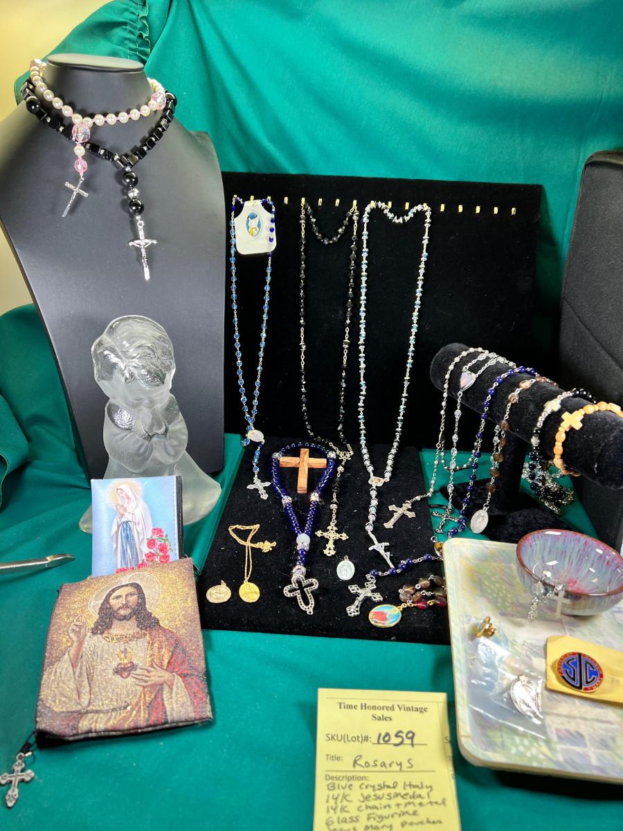 2 14K medallions 1 with chain also 14K, Rosary s, Crosses, bracelets with crosses, Jesus, Mary pouches, Viking Glass Company, Praying child glass statue, offering trays (2) small ceramic bowl.