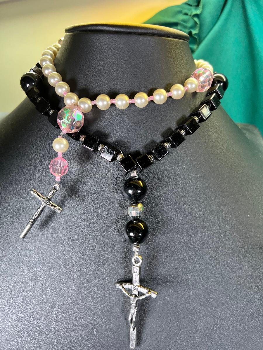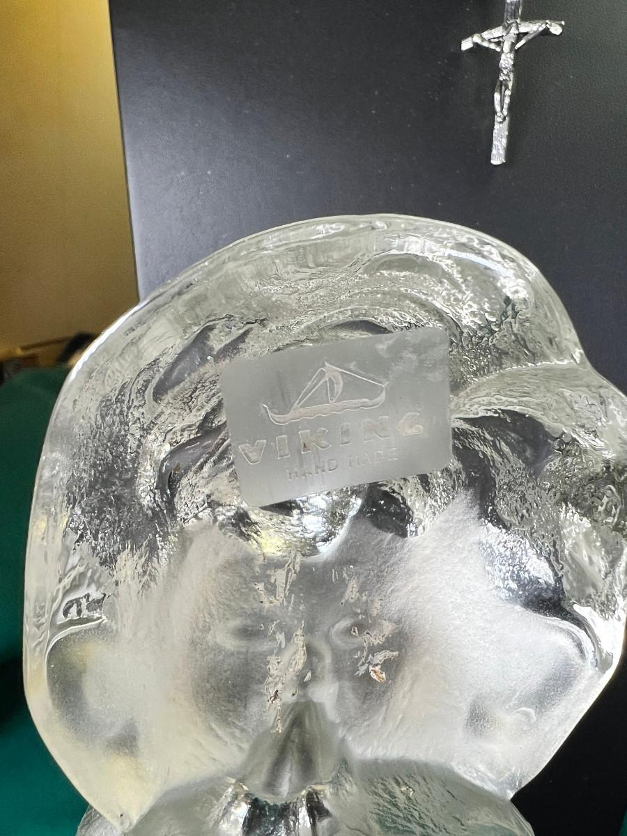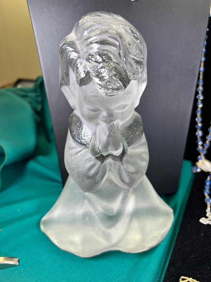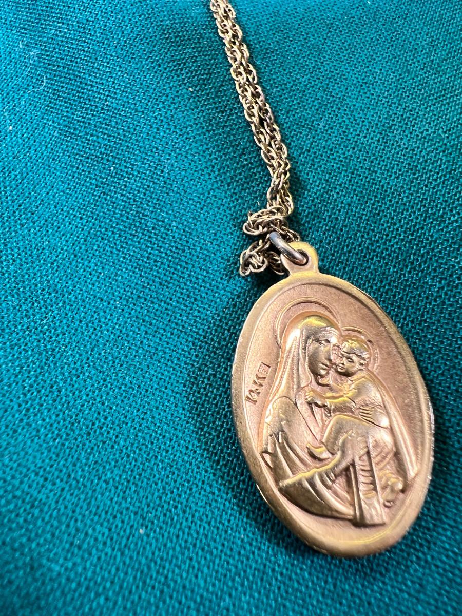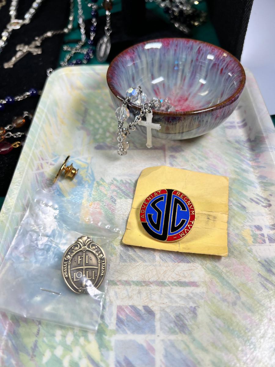 2 14K medallions 1 with chain also 14K, Rosary s, Crosses, bracelets with crosses, Jesus, Mary pouches, Viking Glass Company, Praying child glass statue, offering trays (2) small ceramic bowl.
