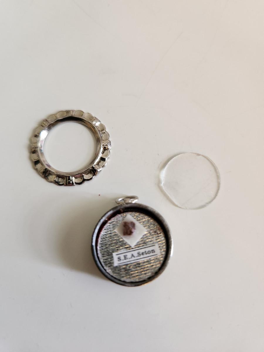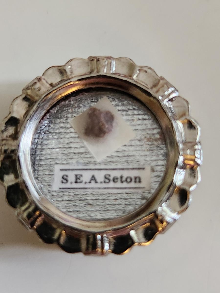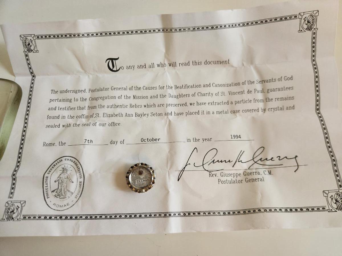 This auction lot is for a Reliquary Case of St. Elizabeth Ann Seton. This case contains a "relic" of St. Elizabeth Ann Seton - and as is the accepted tradition and custom the "relic" is not being sold, only the case that holds it. The "relic" is a gift. This item has the red sealed wax of the Ecclesiastica and comes with papers as such. Elizabeth Ann Seton is the first native-born saint from the Americas. This is a sacred and devotional relic of the Catholic Church. NOTE: When we opened the box in which this theca was held we found that the metal case had separated - the relic itself is in tact. We repositioned the case glass and metal ring securing it with tape. A jeweler can possibly spot weld the case together. These religious items are from the estate of Sister Shaun Marie, OSU.