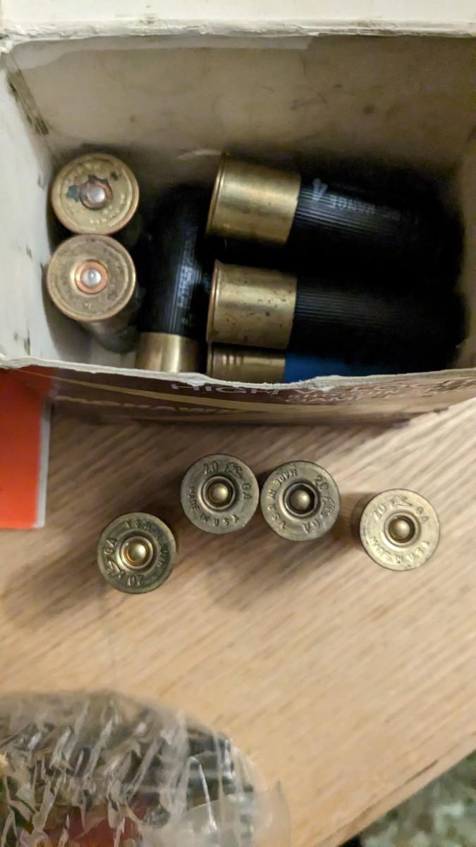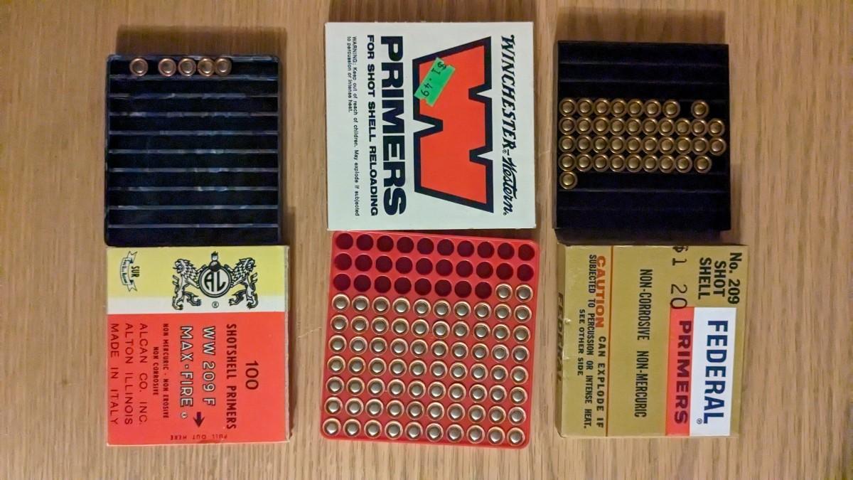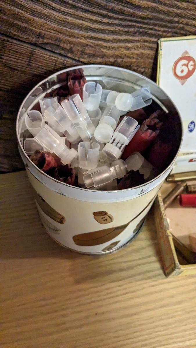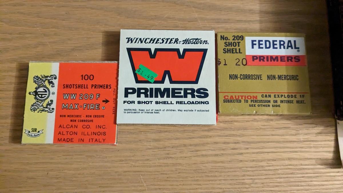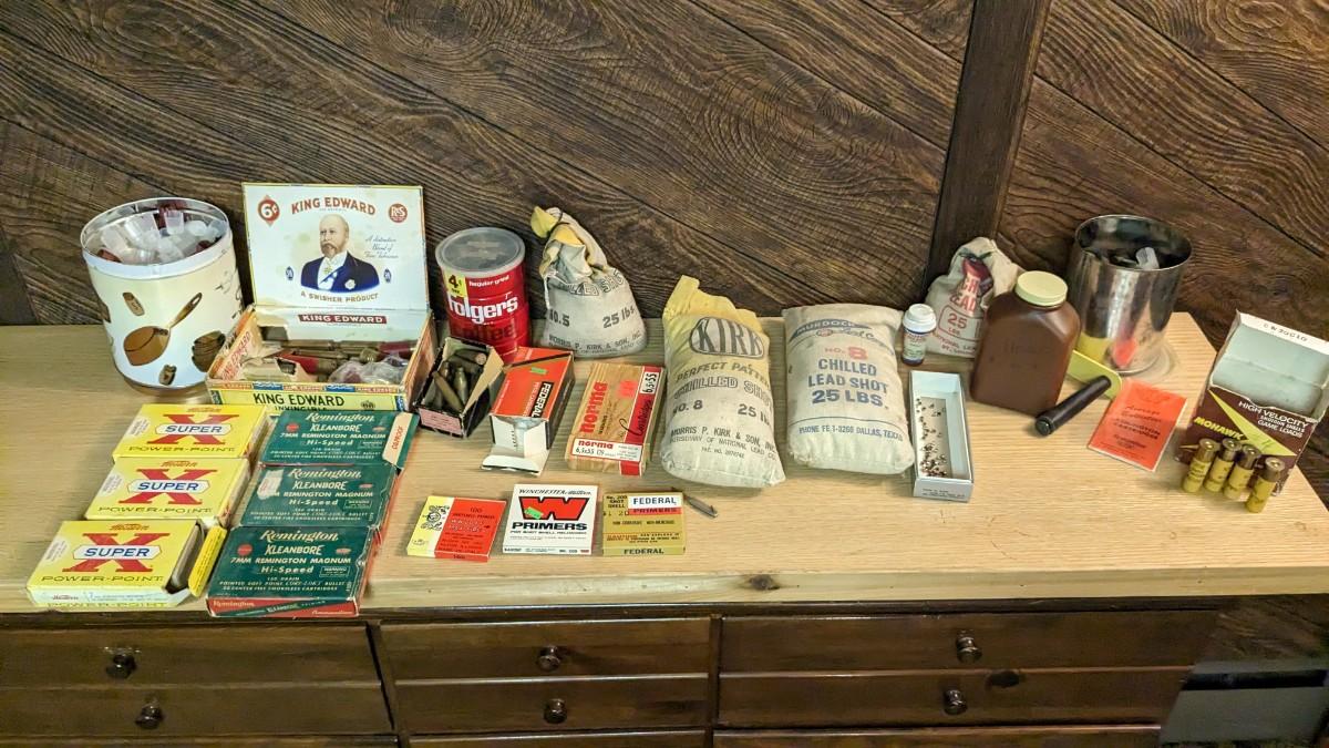 a stacked assortment of chilled shot, primers, shells, wad, and a small Herco container of gun powder. Also includes a partial box of shotgun shells. Please note sizes of shells and primers in photos. YOU MUST BE 18 TO BID AND PICKUP-CO SALES ONLY- NO SHIPPING. Basement
