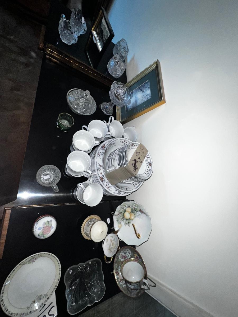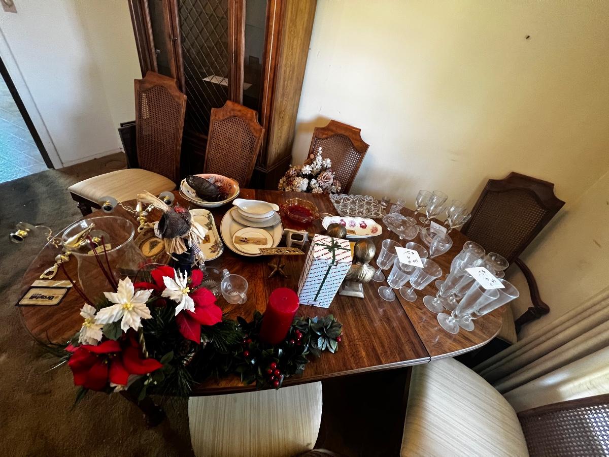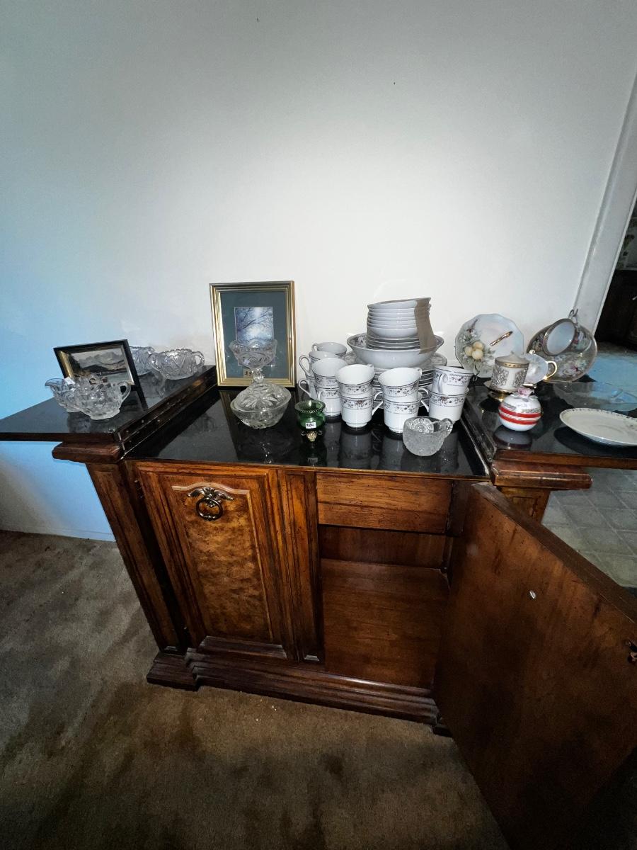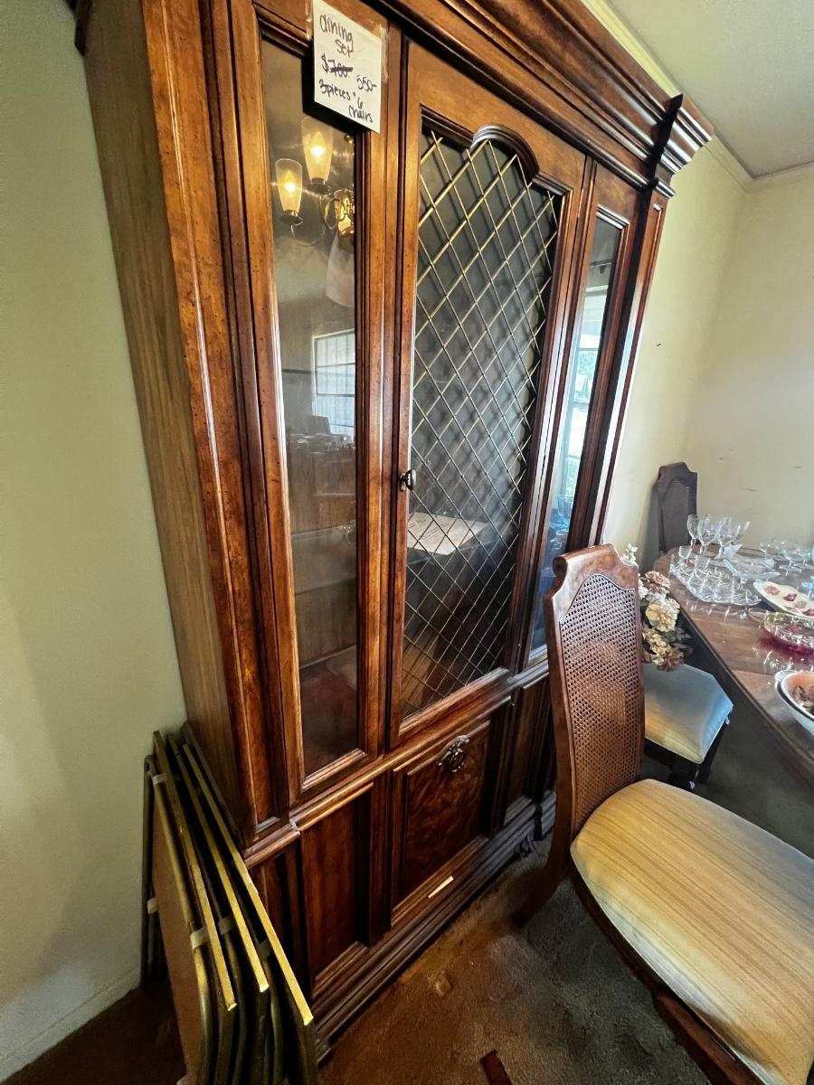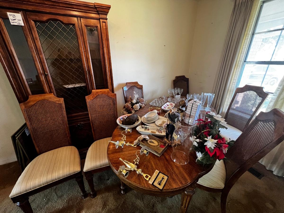 This lot includes: China cabinet, Buffet Bar, Dining room table, Chairs, and all contents on pictures furniture.