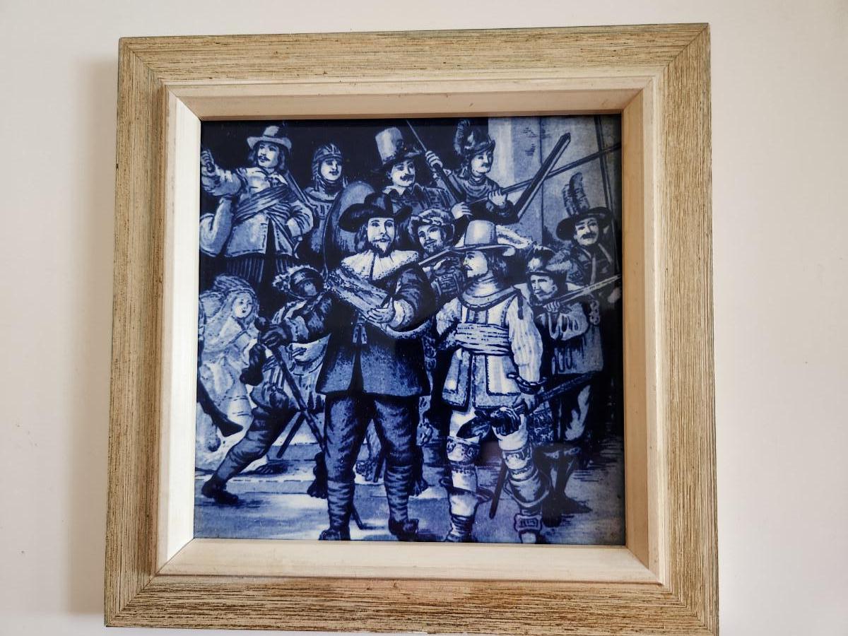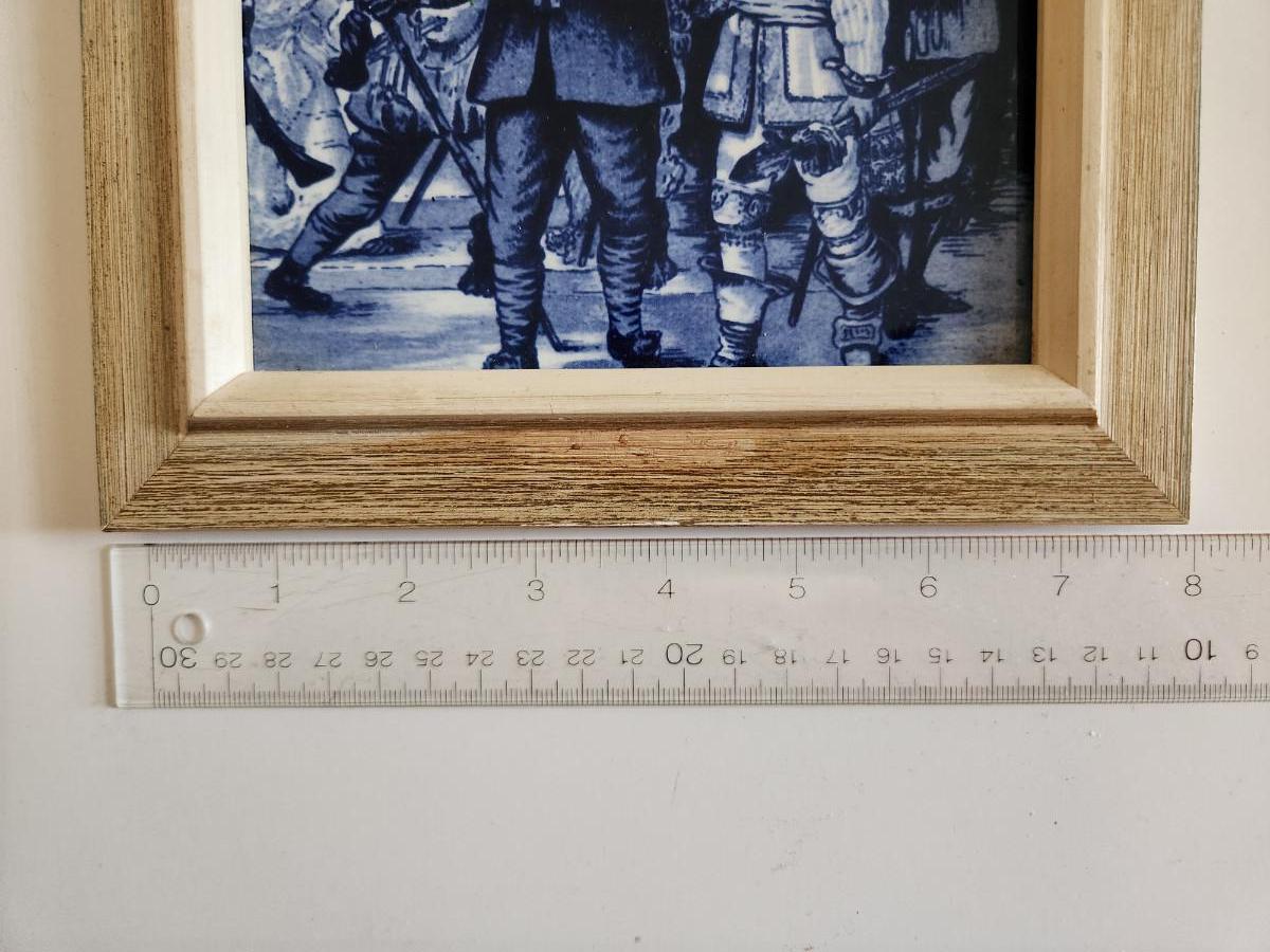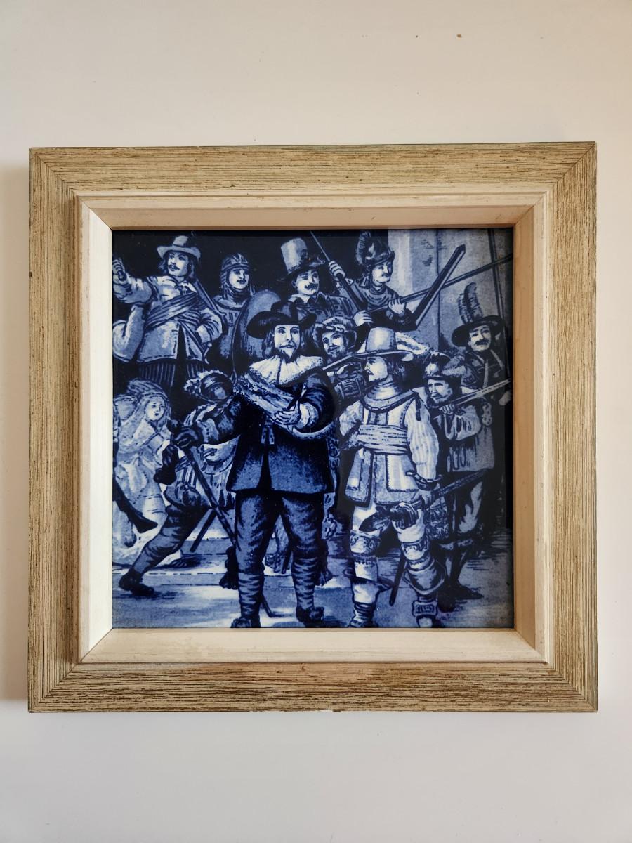 This lot is for a Rembrandt on Delft Blue Tile. This tile displays a reproduction of Rembrandt van Rijn's famous painting, The Night Watch. Nicley framed from the 1950s. The original painting is in Amsterdam but you can have this nifty reproduction if you bid high and bid last. See photos for measurements.