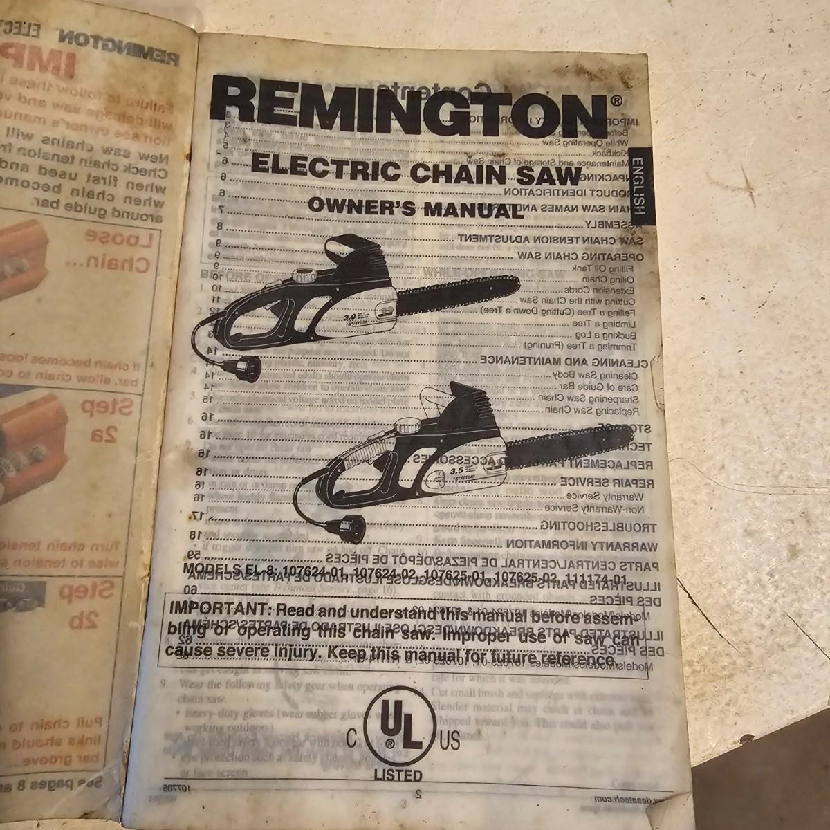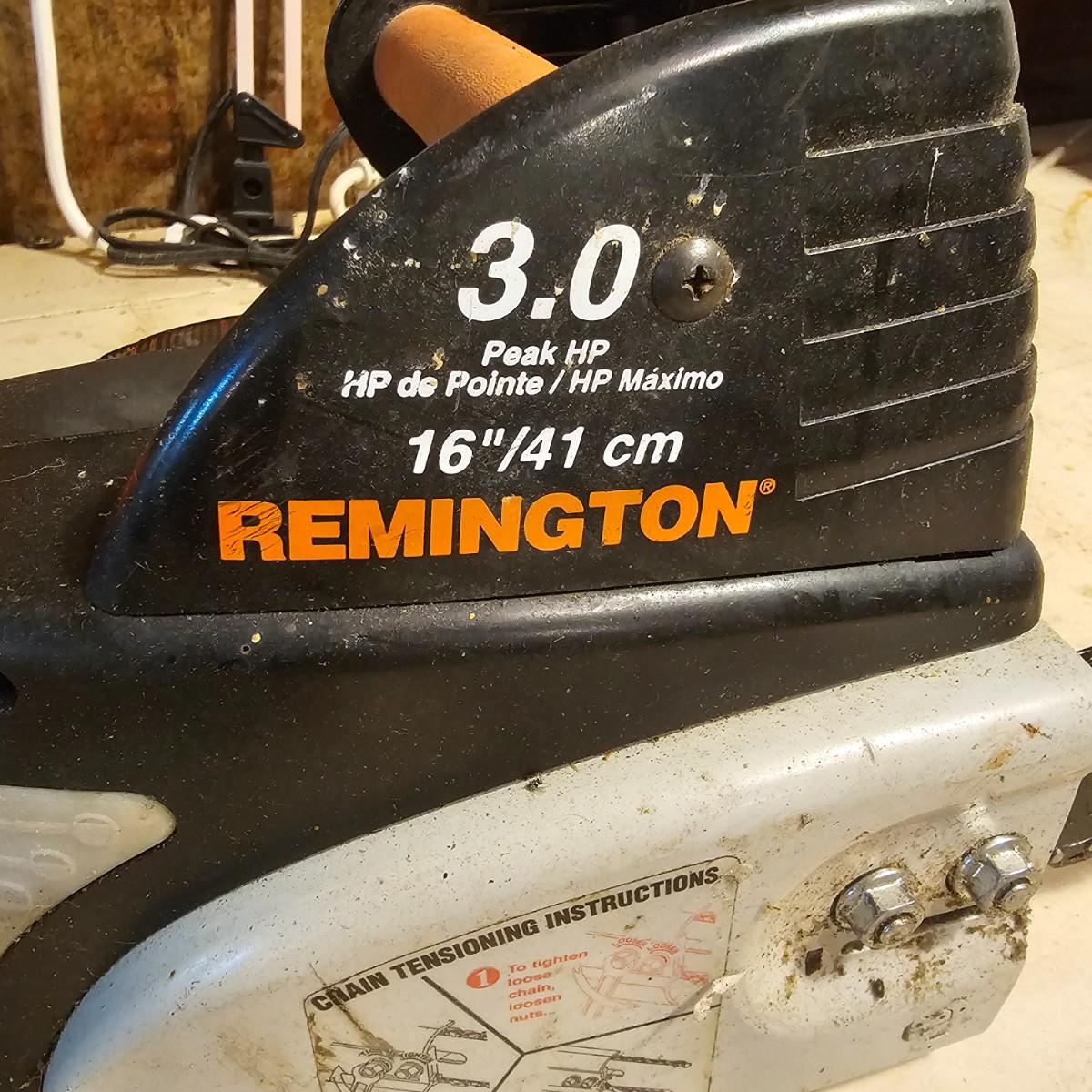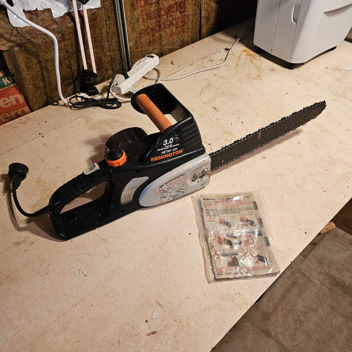 One used Remington brand electric chainsaw with 16" bar/chain. Handle guard, instruction book. Measures 31" x 9.5" x 9"H. Unit powered on when plugged in. See photos for details. Local pickup only.