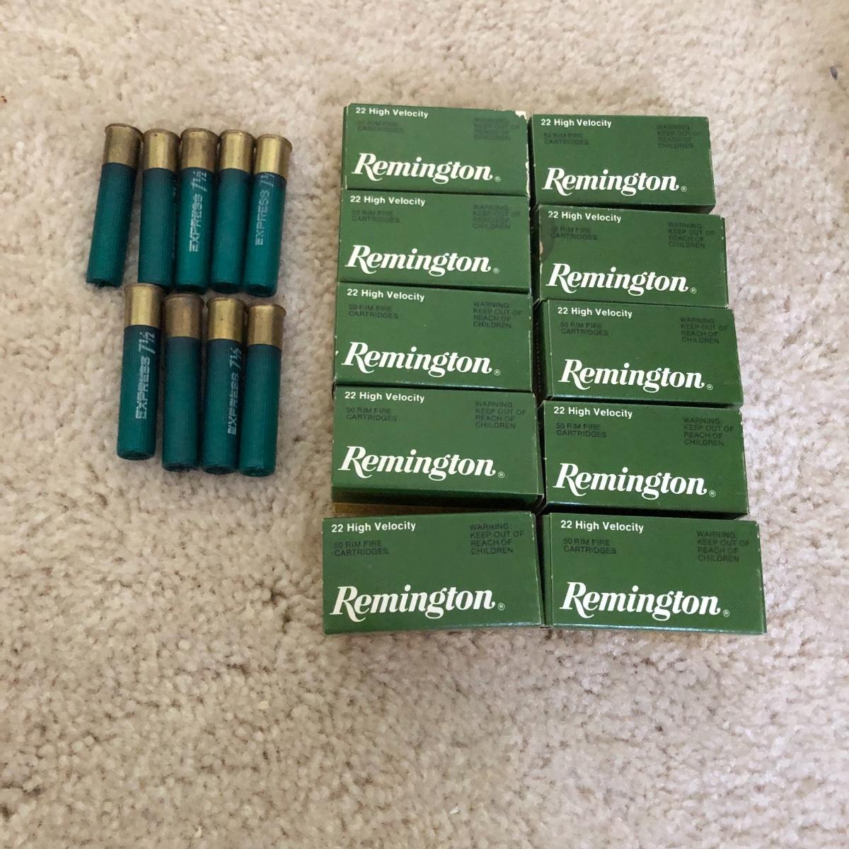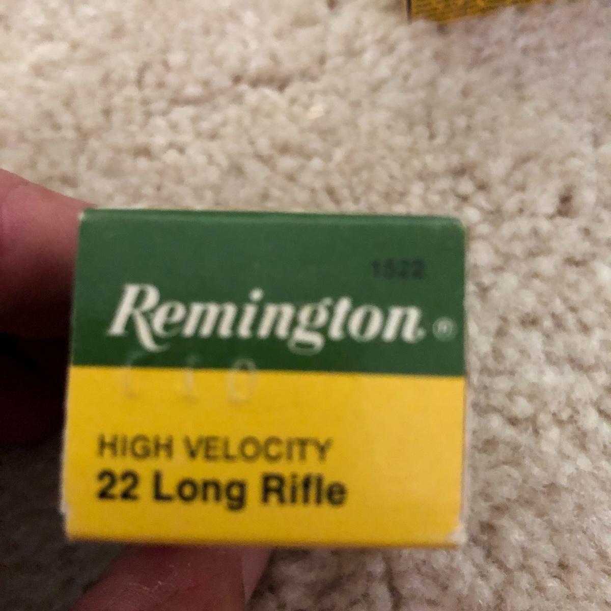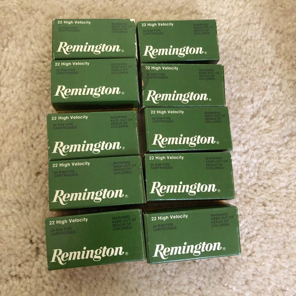 Lot includes ten boxes of Remington high velocity 22 long rifle ammunition and nine Remington small shotgun shells.
