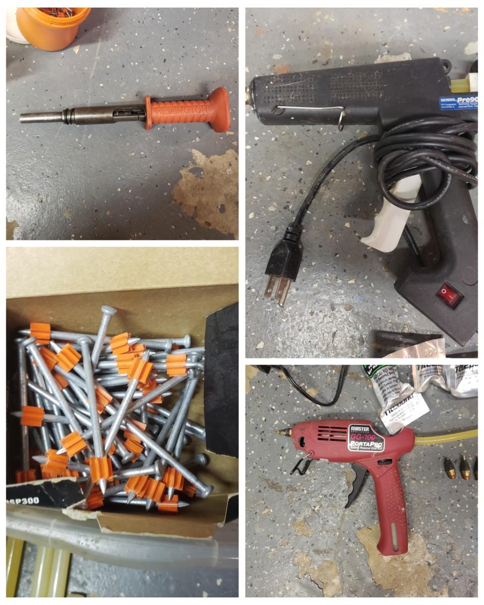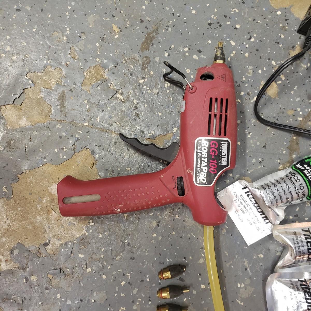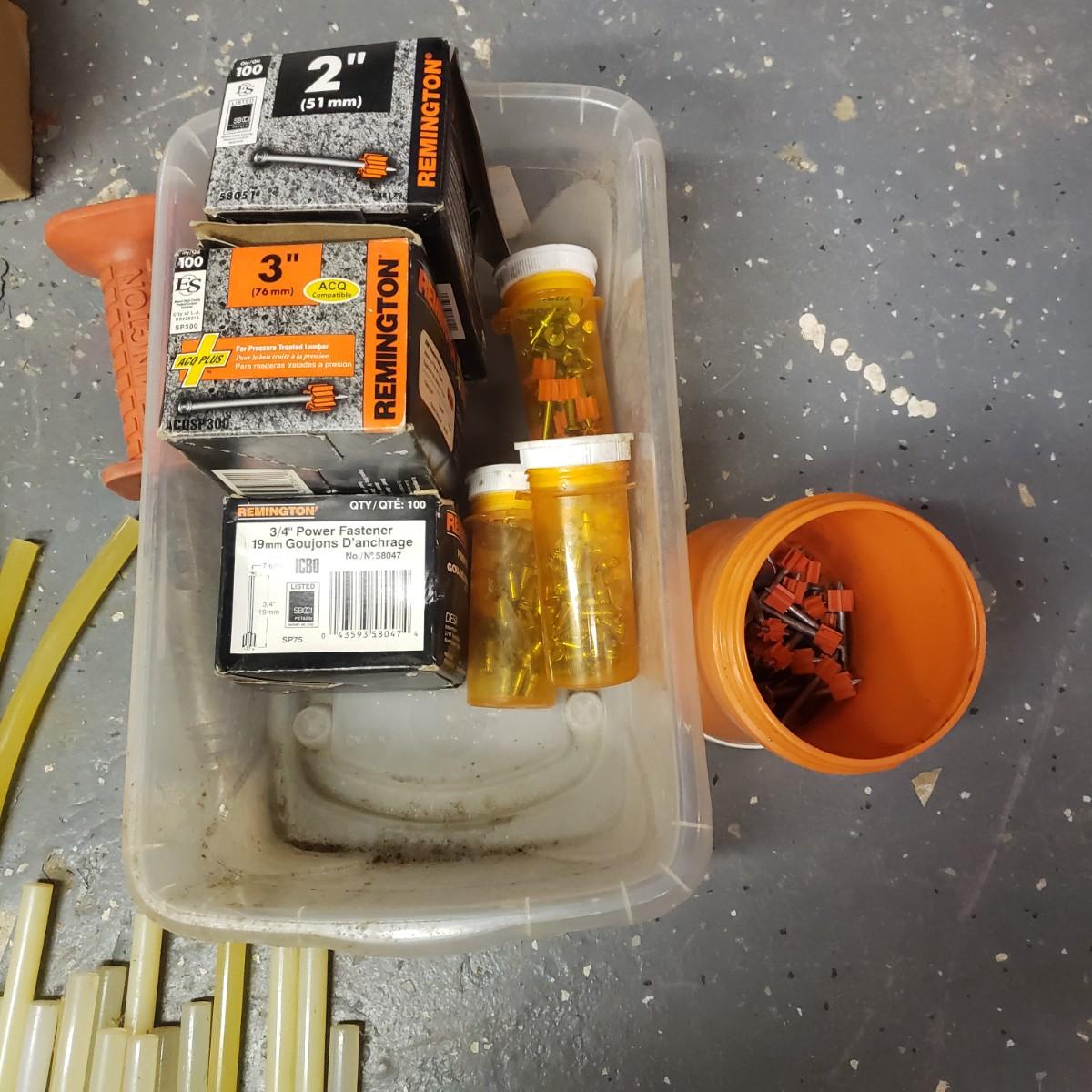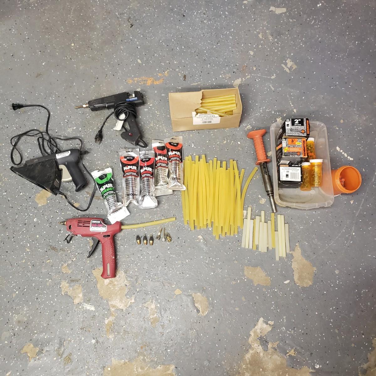 This lot contains a Remington Depress hand held tool with boxes/bins of fasteners, see pictures. There are three glue guns, the Master Appliance GG-100, HiPur polyurethane Former and the Surebonder Pro9000A. There are multiple sticks of glue, see pictures.