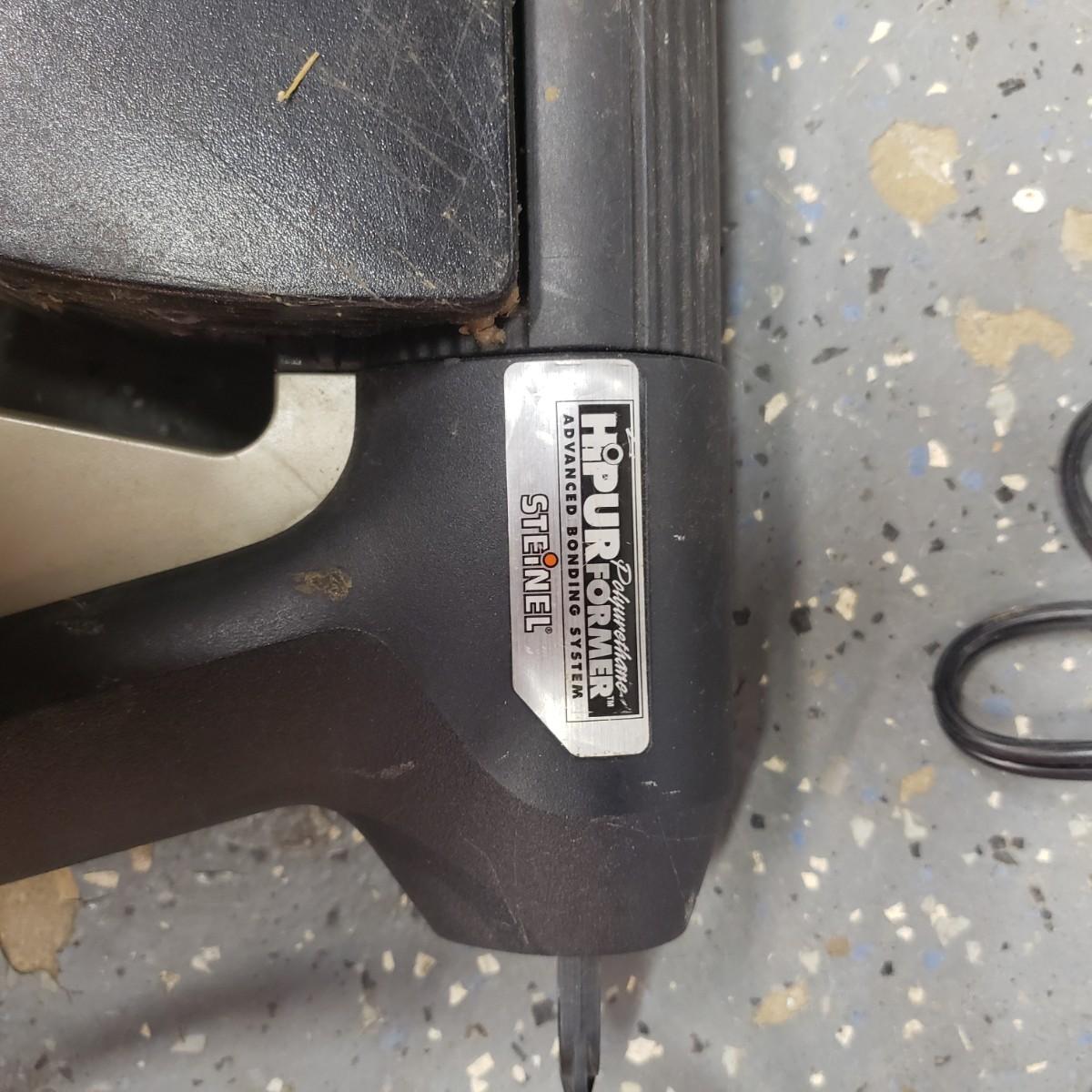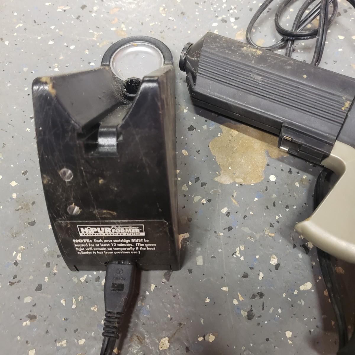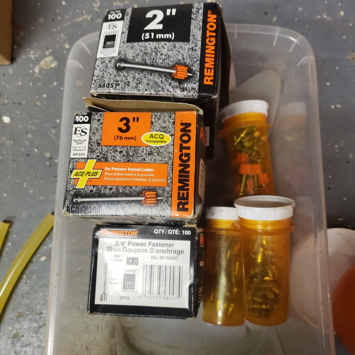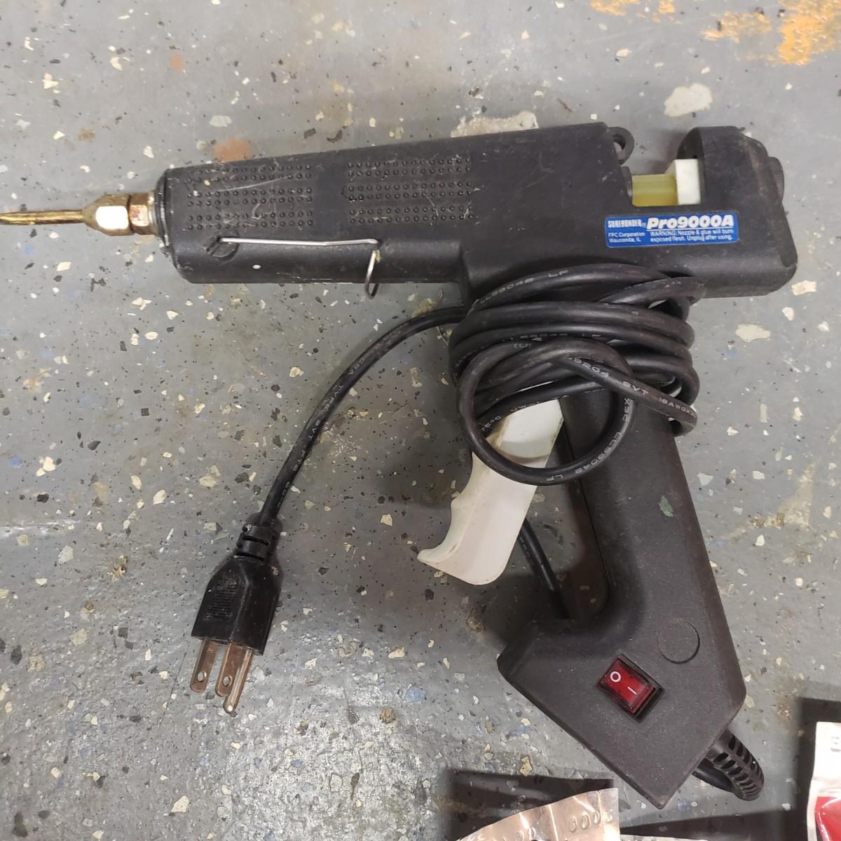 This lot contains a Remington Depress hand held tool with boxes/bins of fasteners, see pictures. There are three glue guns, the Master Appliance GG-100, HiPur polyurethane Former and the Surebonder Pro9000A. There are multiple sticks of glue, see pictures.