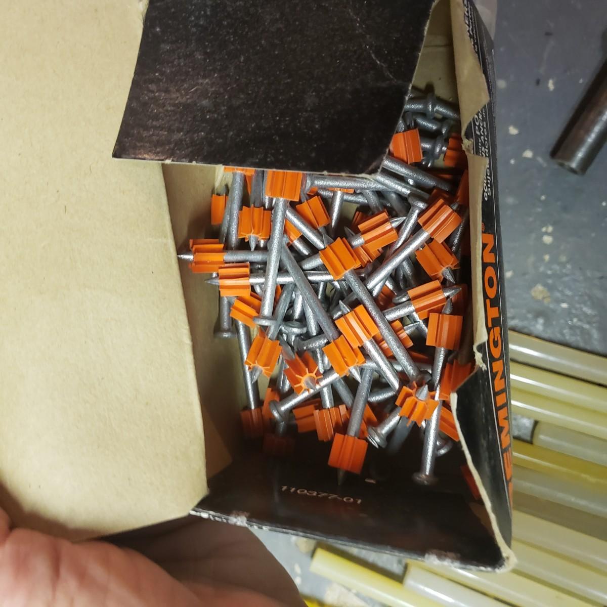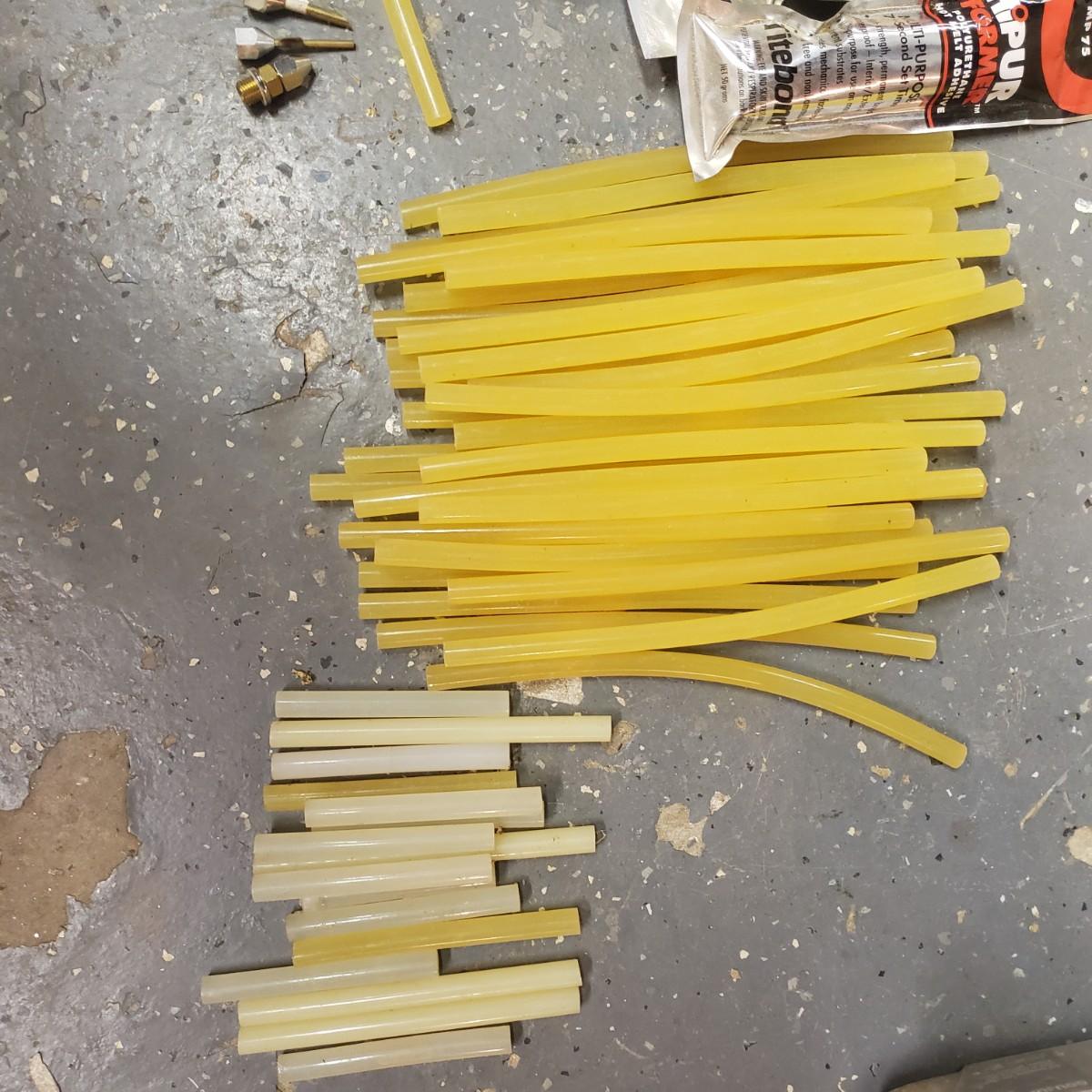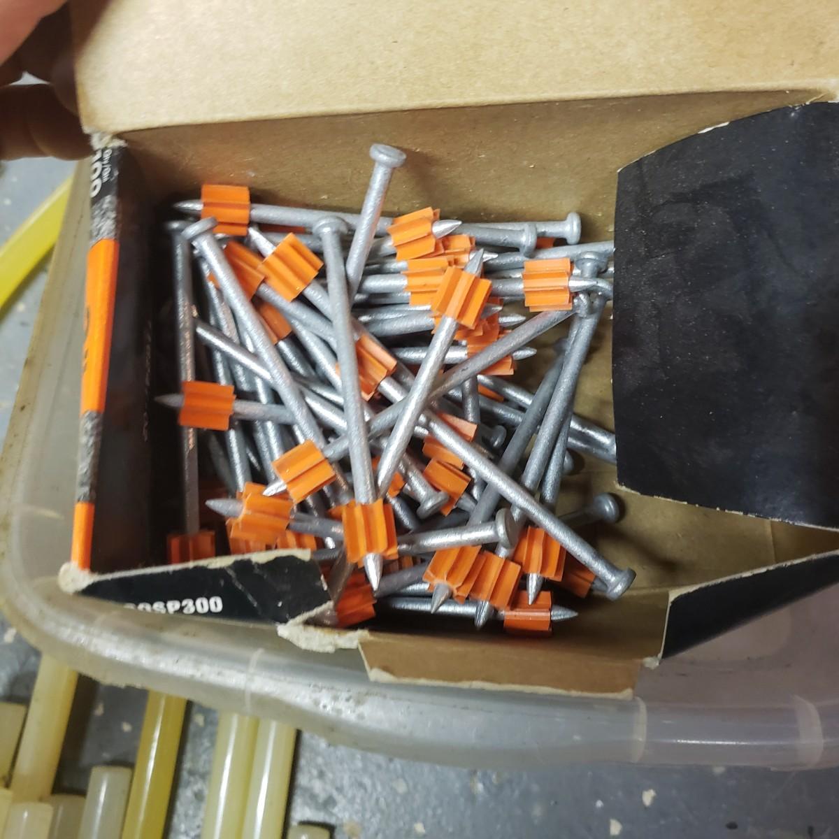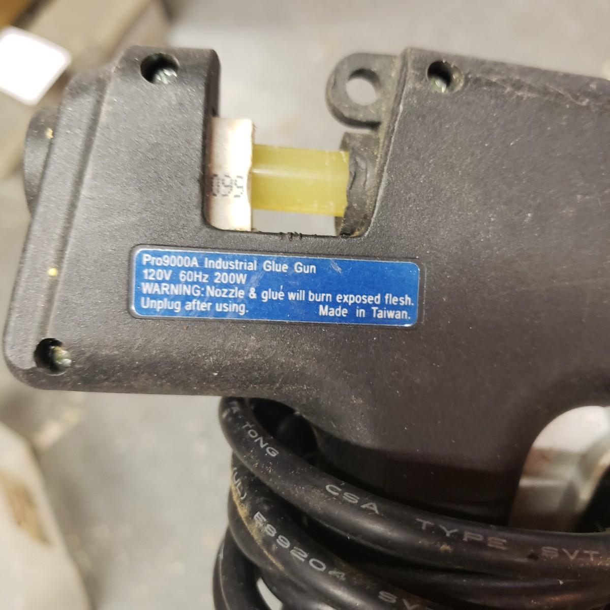 This lot contains a Remington Depress hand held tool with boxes/bins of fasteners, see pictures. There are three glue guns, the Master Appliance GG-100, HiPur polyurethane Former and the Surebonder Pro9000A. There are multiple sticks of glue, see pictures.