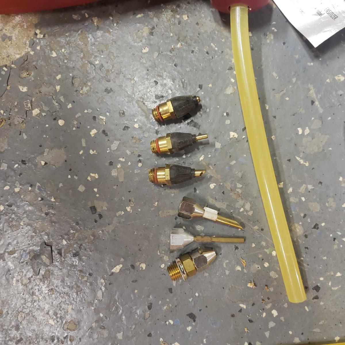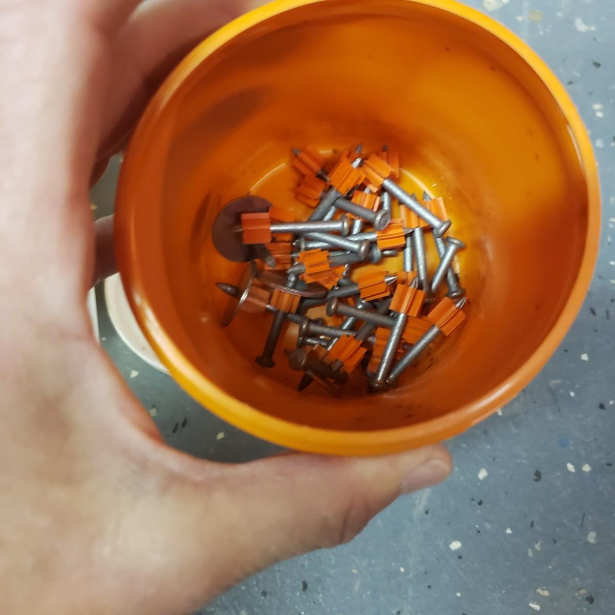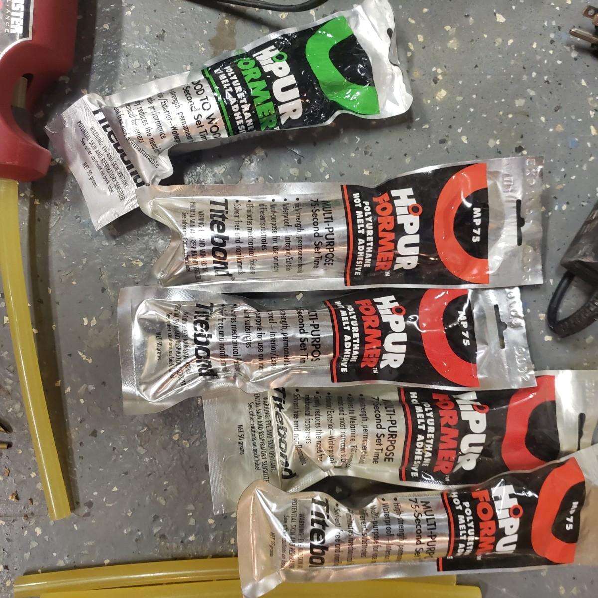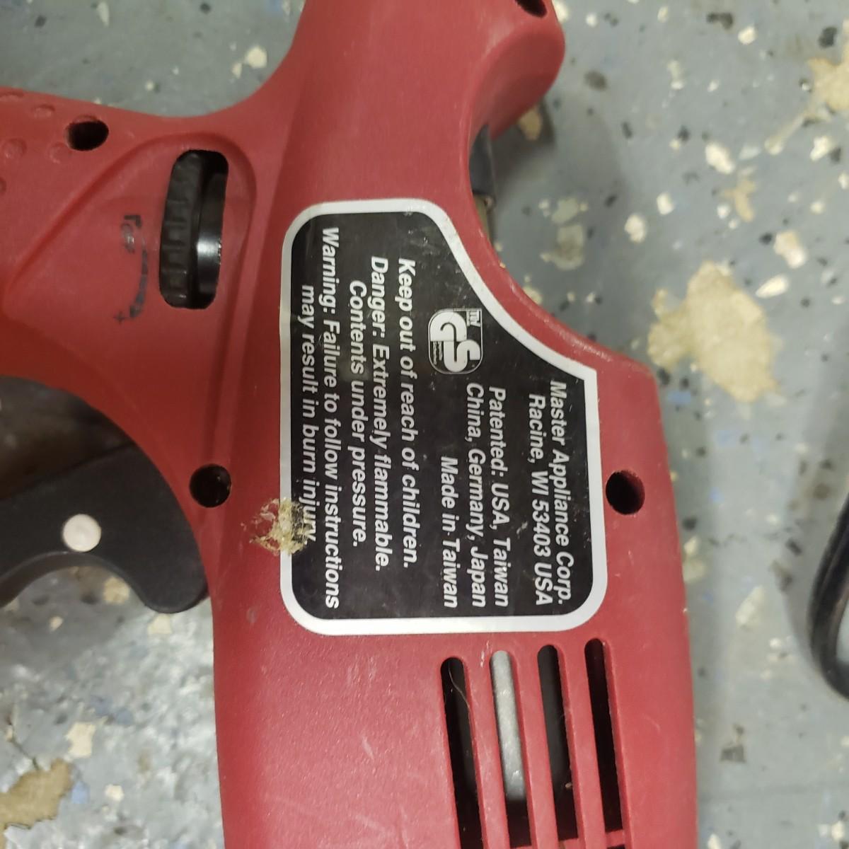 This lot contains a Remington Depress hand held tool with boxes/bins of fasteners, see pictures. There are three glue guns, the Master Appliance GG-100, HiPur polyurethane Former and the Surebonder Pro9000A. There are multiple sticks of glue, see pictures.