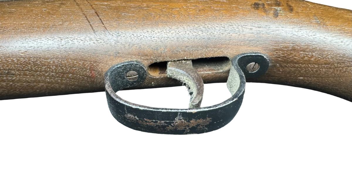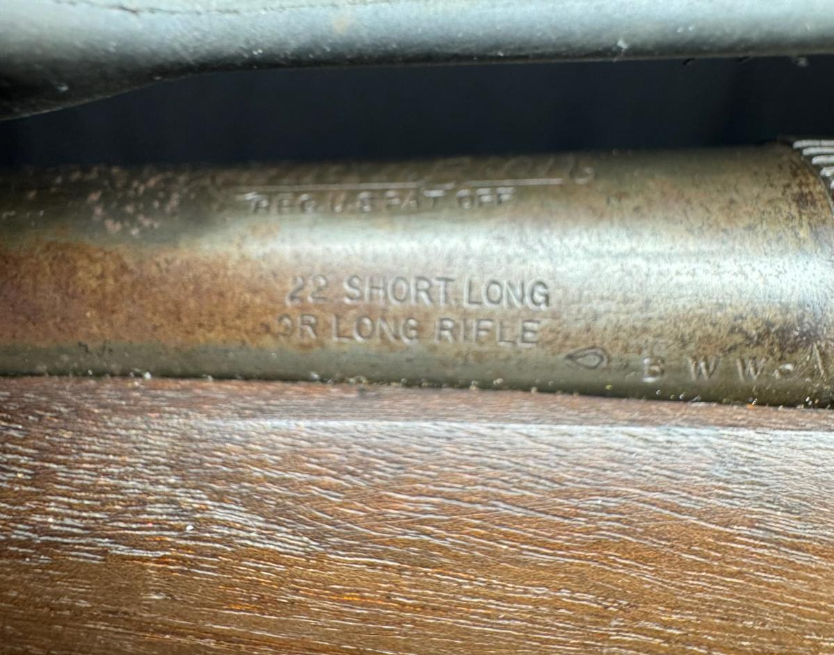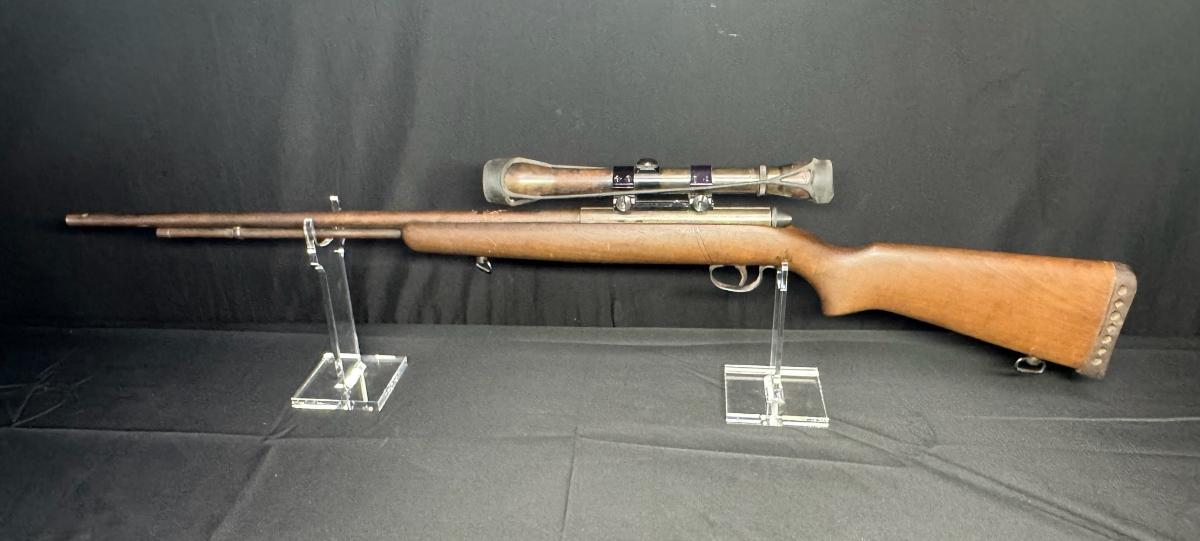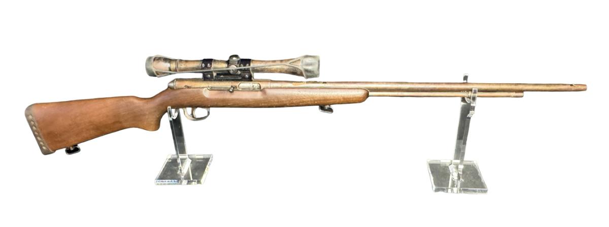 This is a tube fed .22 caliber semi-automatic rifle. It fires .22 short, long, and long rifle. It comes with a Weaver K6 scope. It has a hardwood stock with a shoulder pad, and swivels for a shoulder strap. Barrel length is 24 inches. Overall length is 44 inches. There is no visible serial number. Not tested. [KD]
