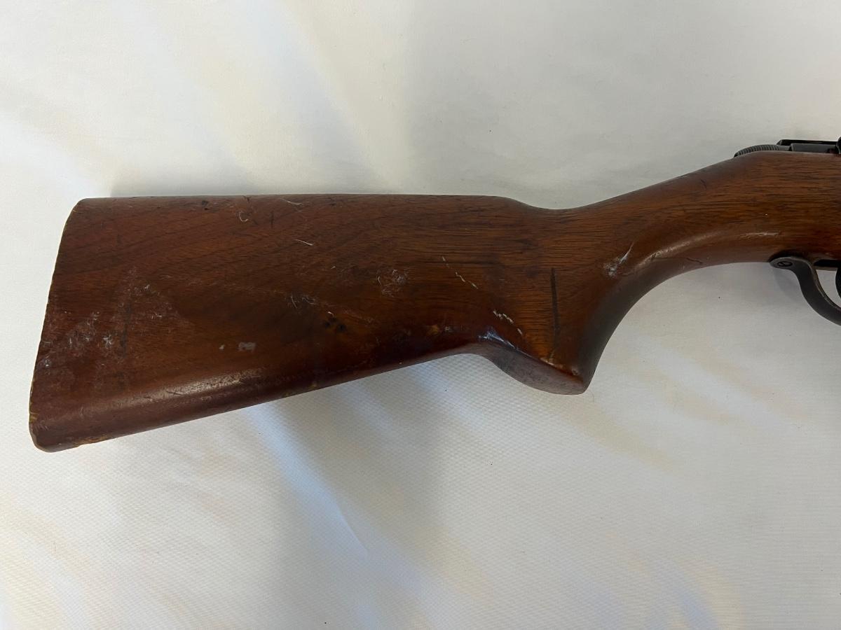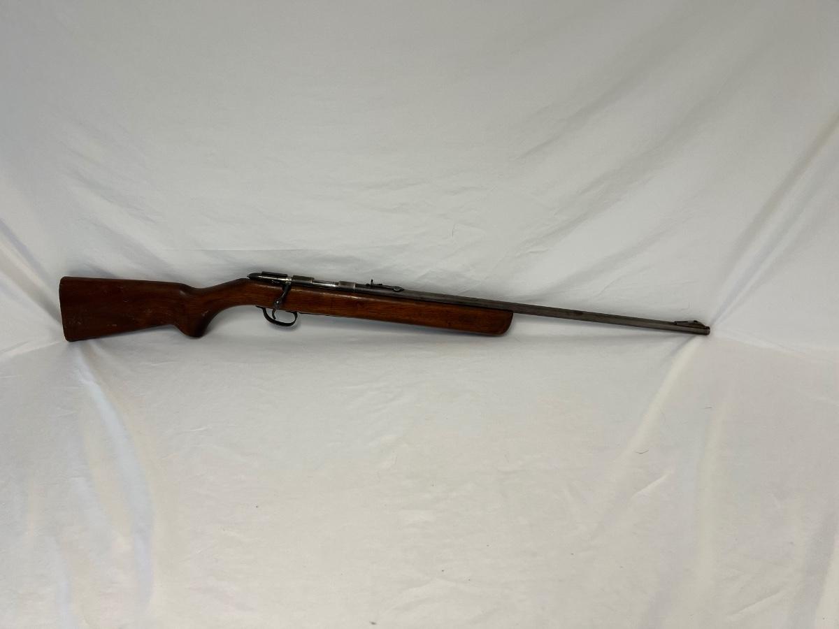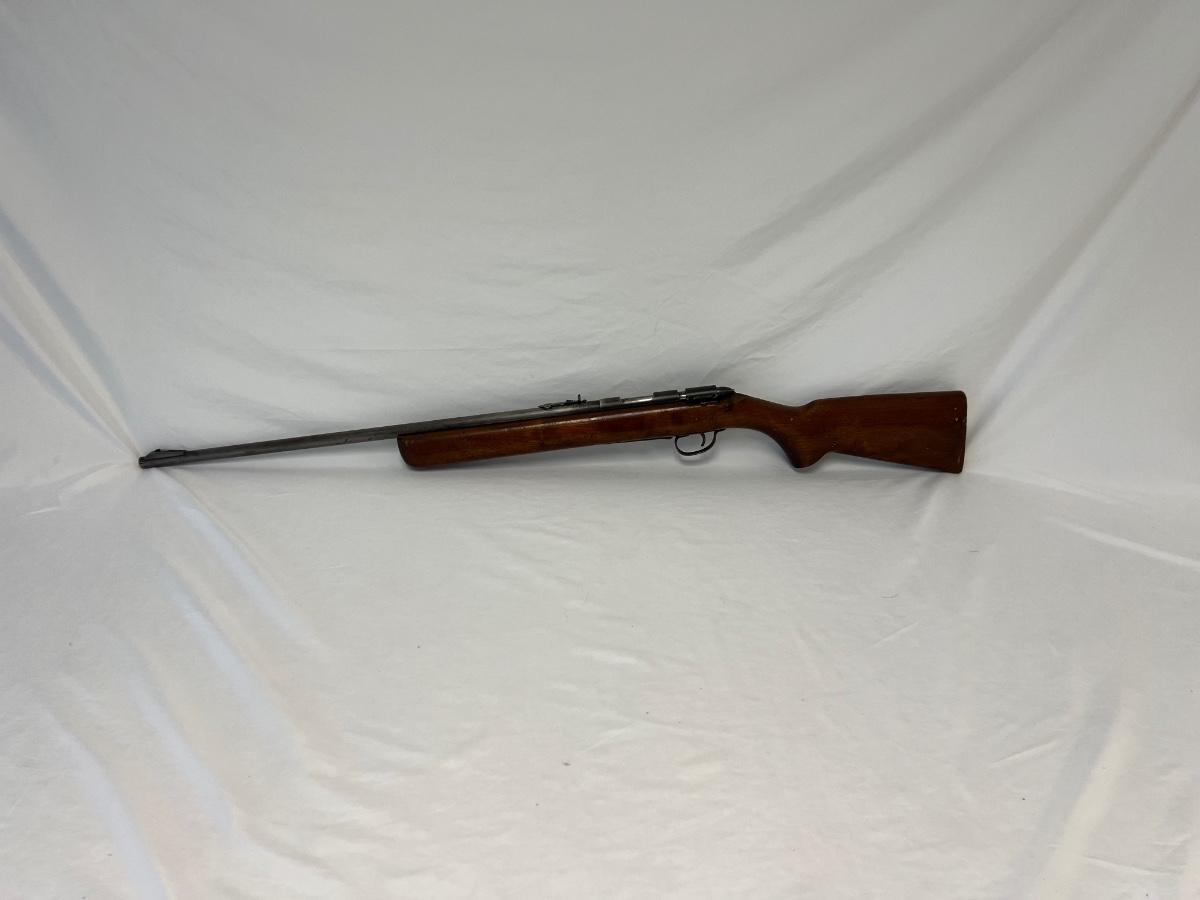 Bolt action. .22 long and short. Missing the butt plate. Has no magazine. Has substantial bluing loss. One area of the stock has some damage (pictured). Recommend that the firearm be evaluated by a gunsmith before being fired. Not tested. Measurement: 43"L (overall). [KA]