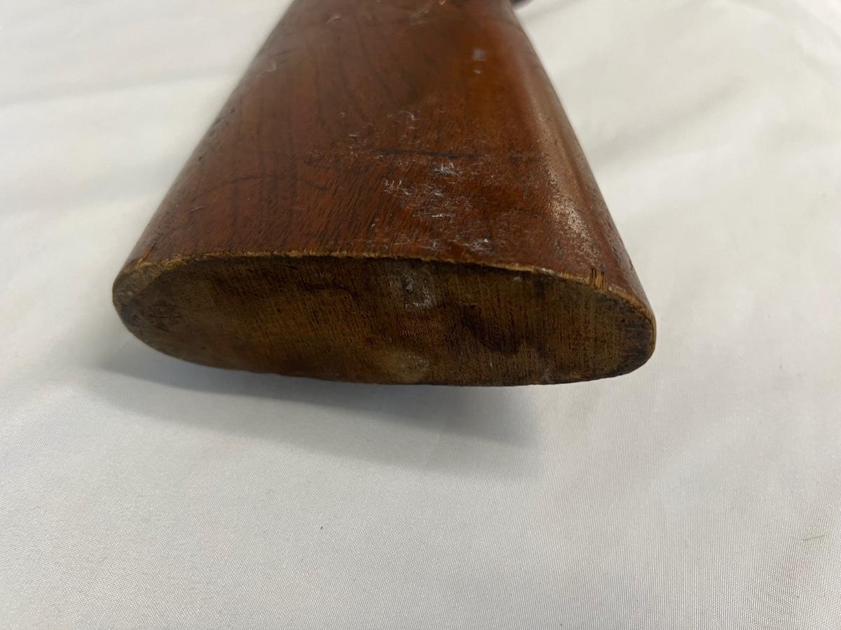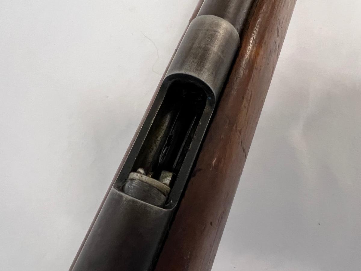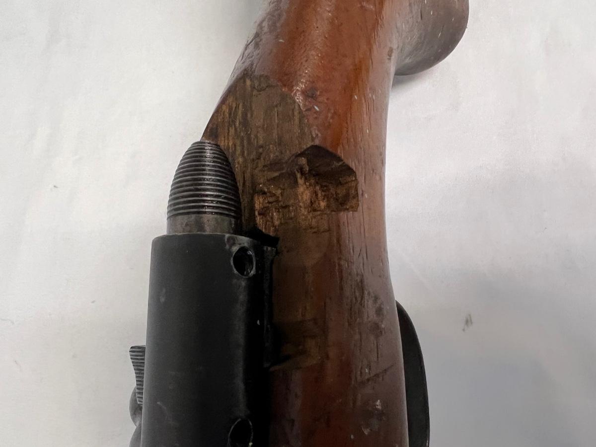 Bolt action. .22 long and short. Missing the butt plate. Has no magazine. Has substantial bluing loss. One area of the stock has some damage (pictured). Recommend that the firearm be evaluated by a gunsmith before being fired. Not tested. Measurement: 43"L (overall). [KA]