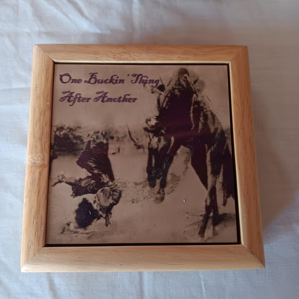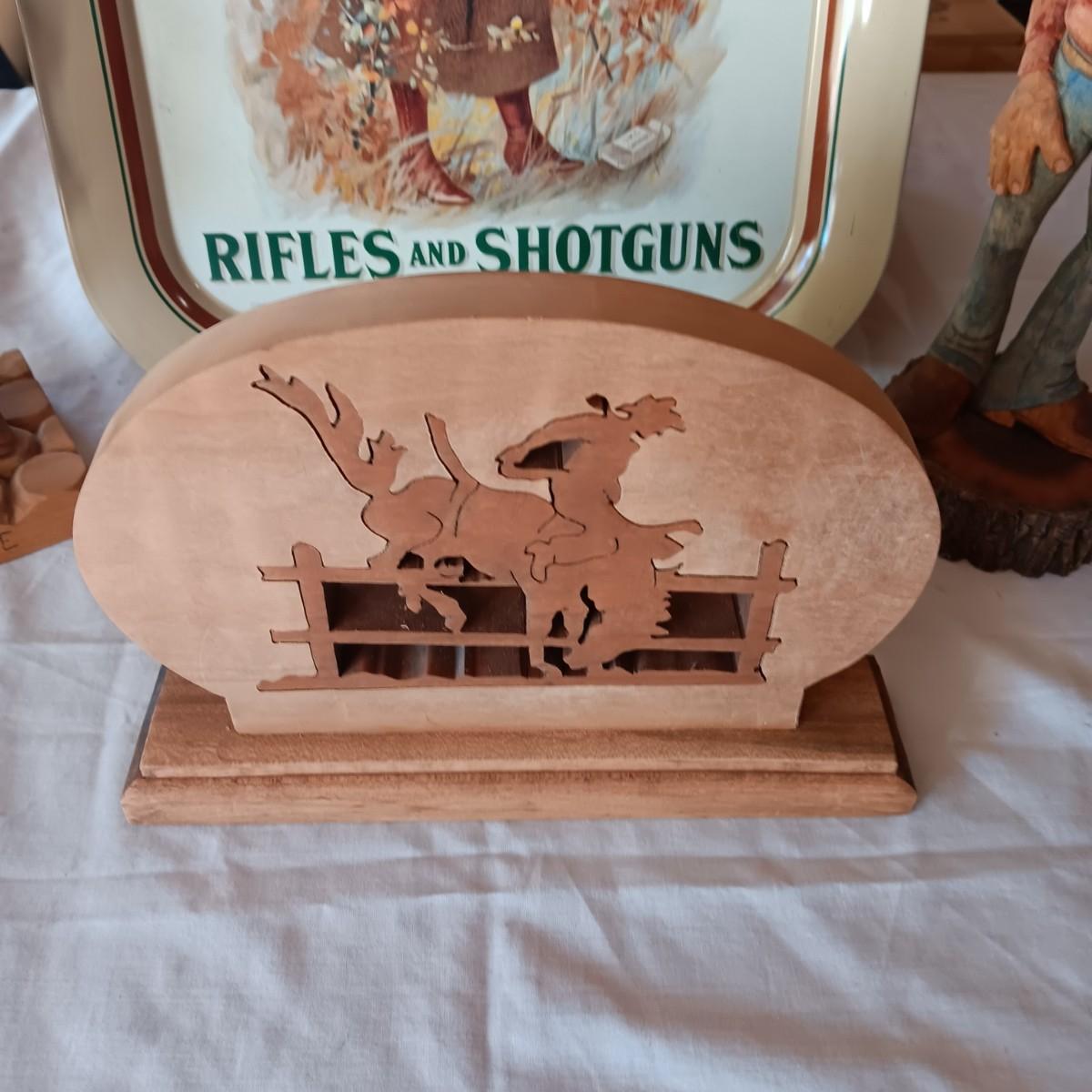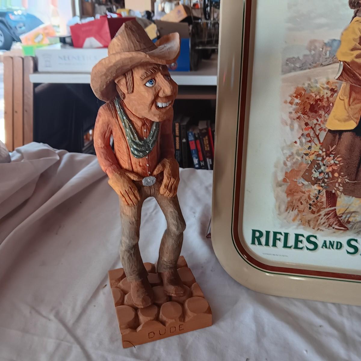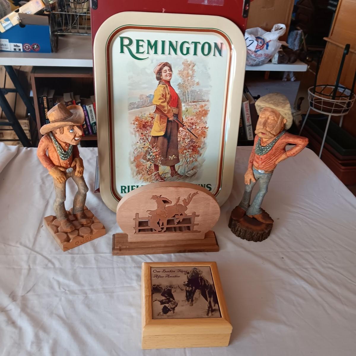 REMINGTON TIN TRAY, HAND CARVED COWBOYS, WOODEN BOX AND INLAID BUCKING BRONCO