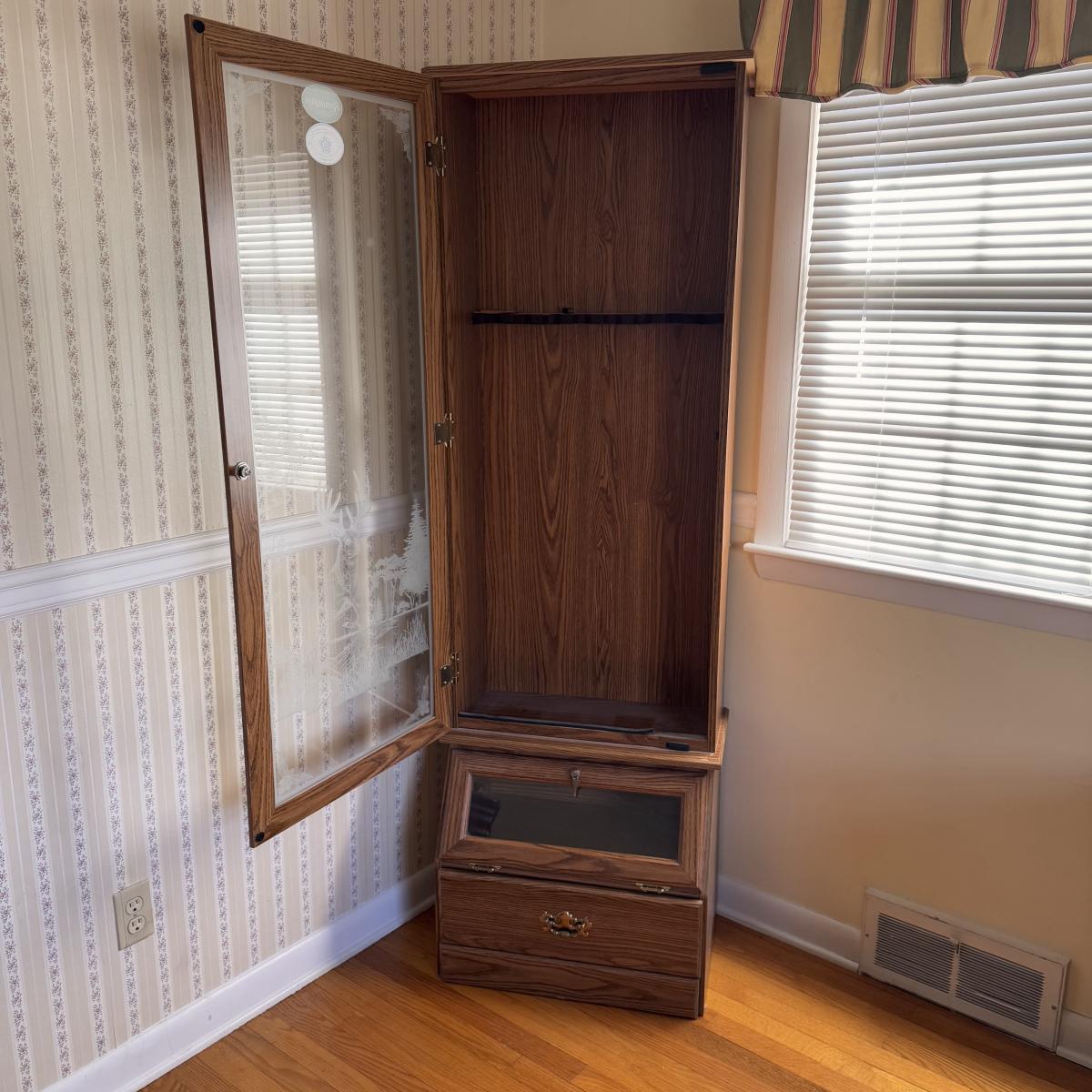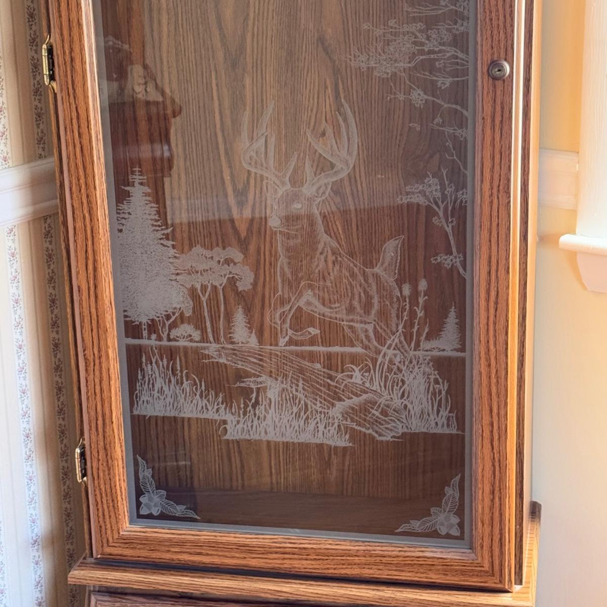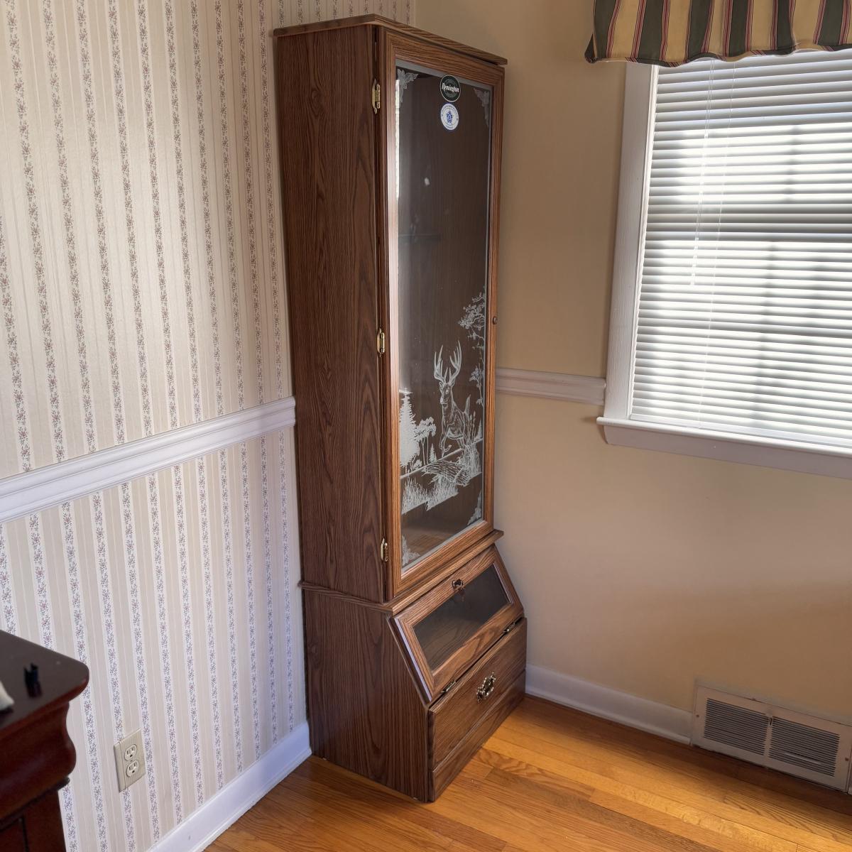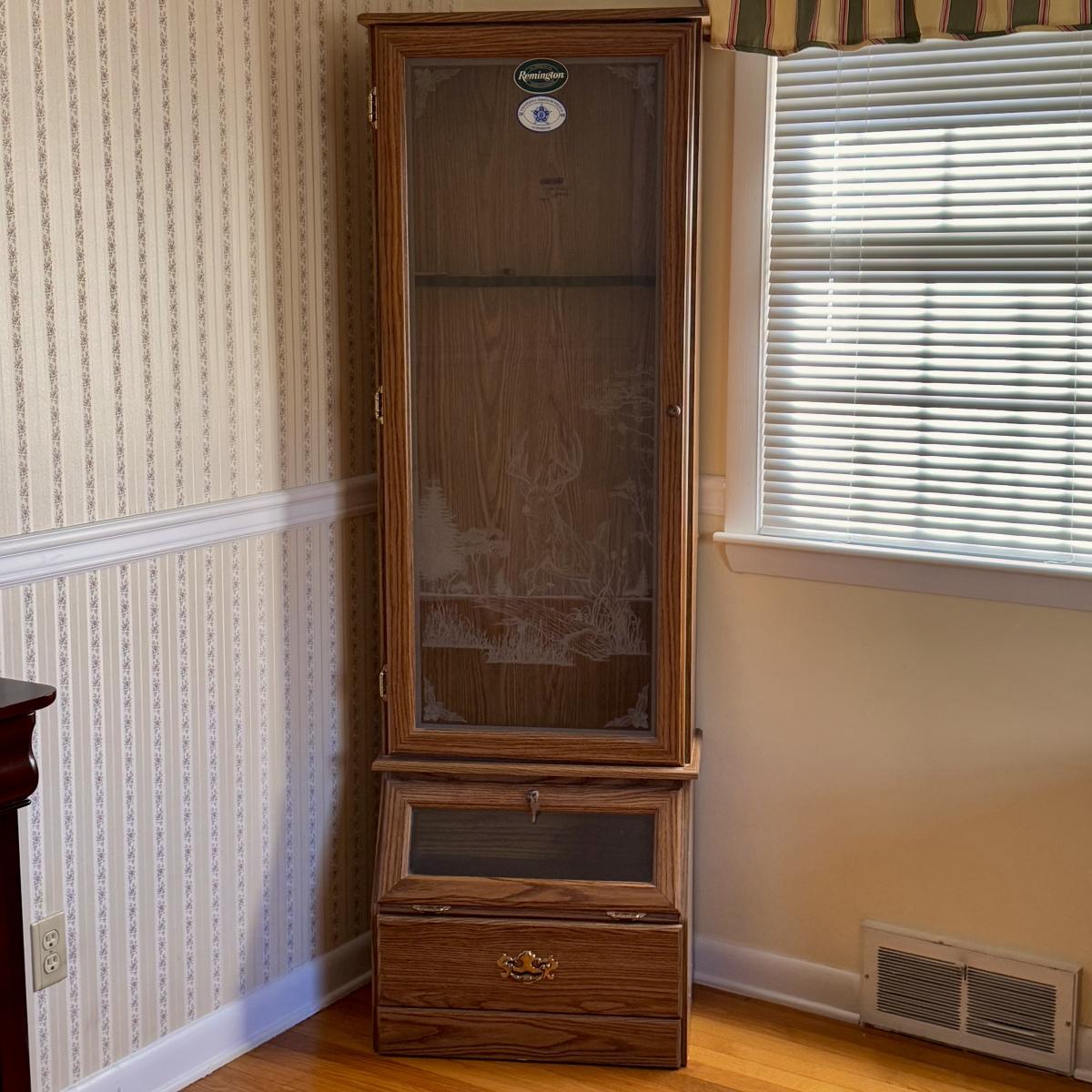 Lot includes one Remington wooden locking gun cabinet. The cabinet has an eight-gun capacity in the upper cabinet. The glass on the front has a frosted hunting design. There are two locks on this piece that come with functioning keys. The entire cabinet Measures 22.5” x 15.5” x 72.25”H. Local pickup only. Winning bidder must bring assistance to help move and load this item due to its weight and/or size.