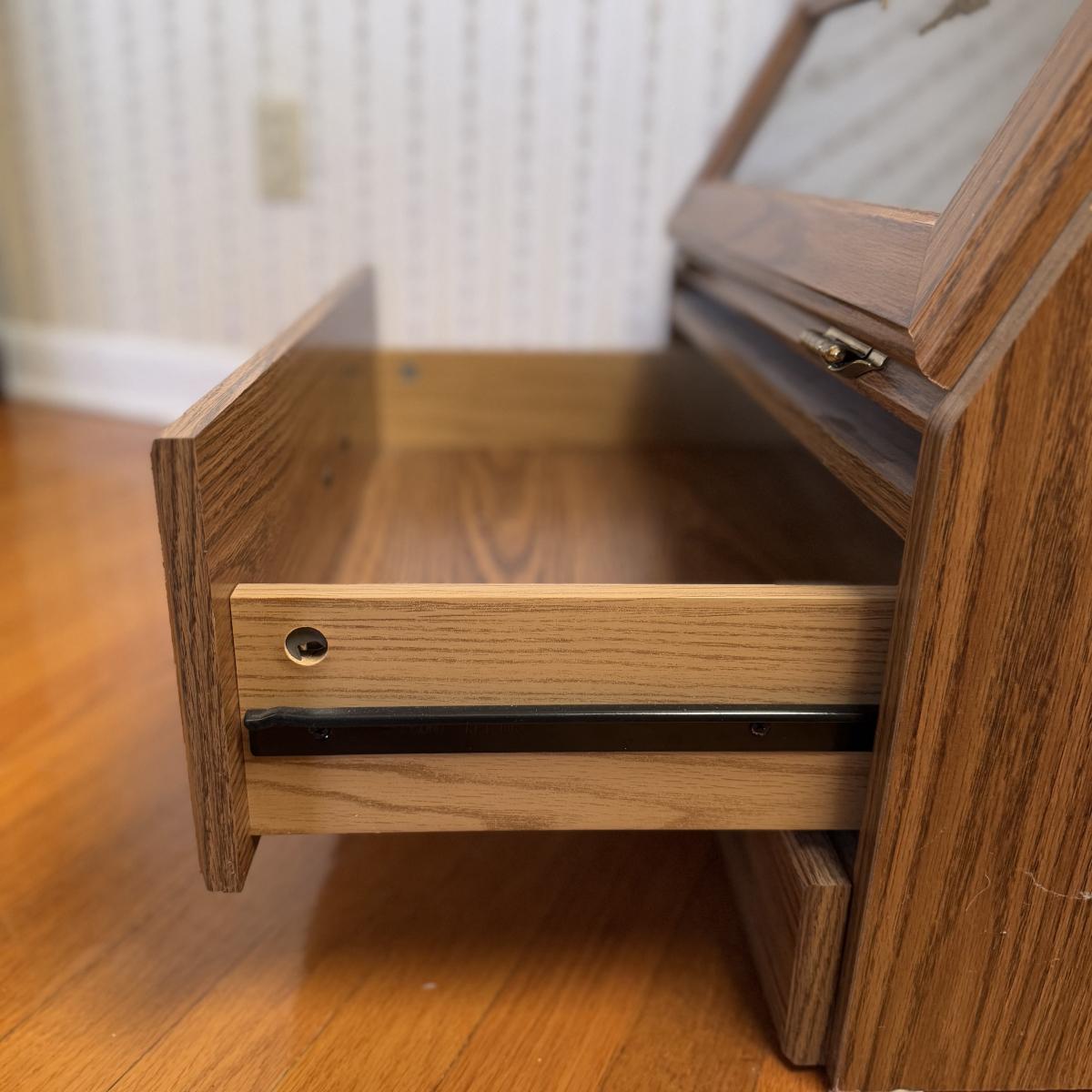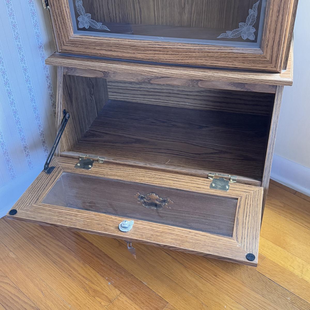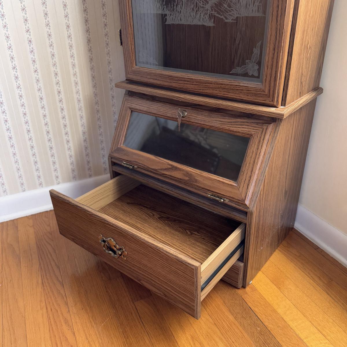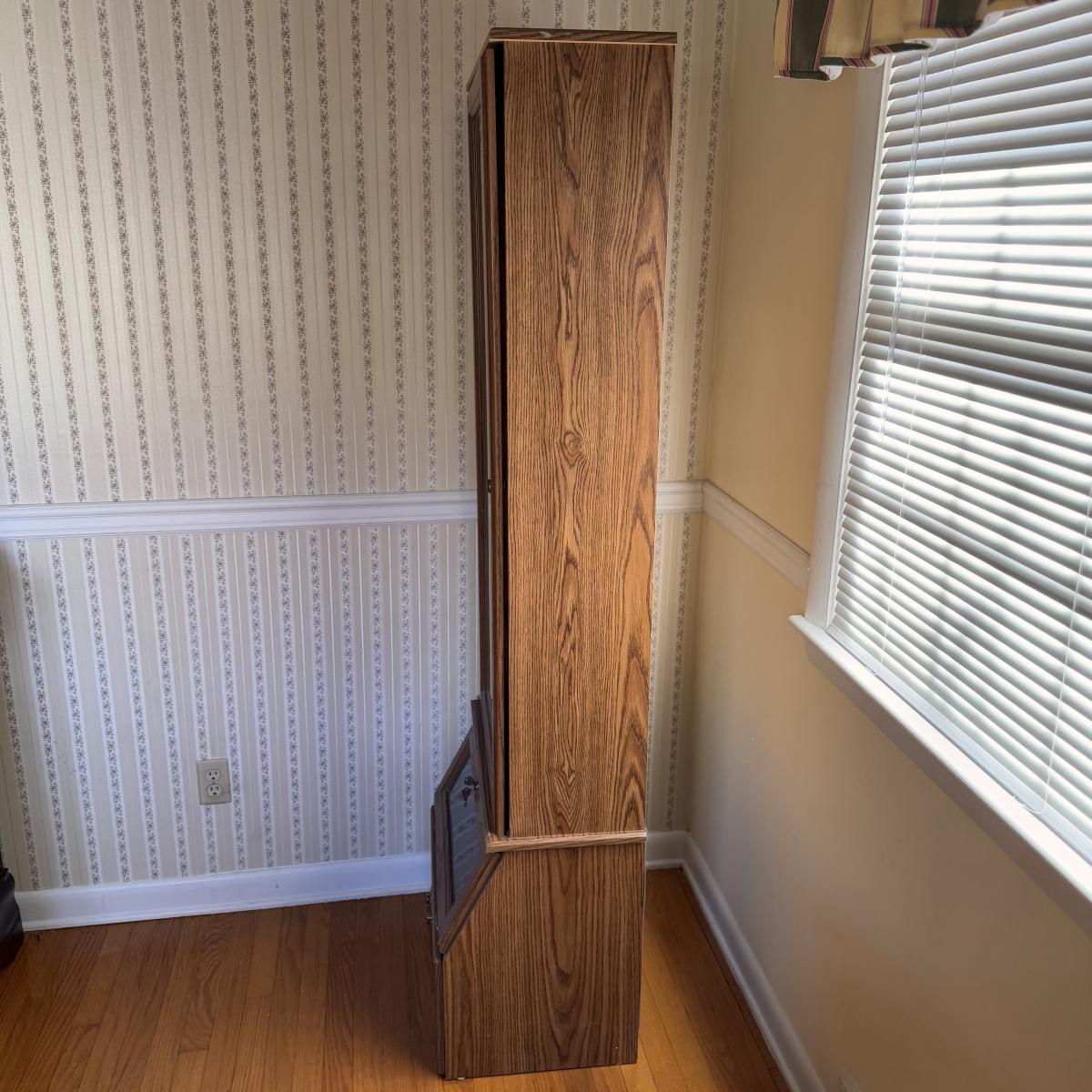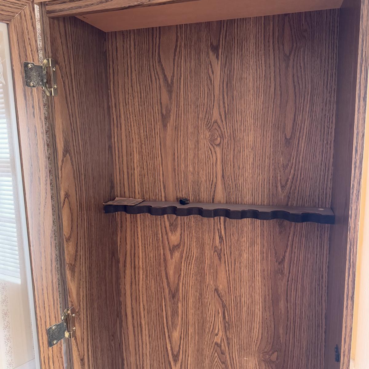 Lot includes one Remington wooden locking gun cabinet. The cabinet has an eight-gun capacity in the upper cabinet. The glass on the front has a frosted hunting design. There are two locks on this piece that come with functioning keys. The entire cabinet Measures 22.5” x 15.5” x 72.25”H. Local pickup only. Winning bidder must bring assistance to help move and load this item due to its weight and/or size.