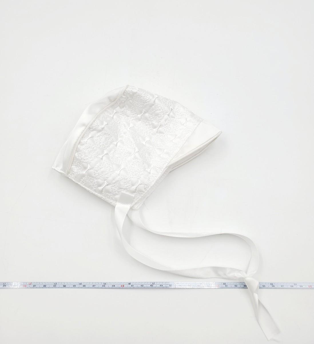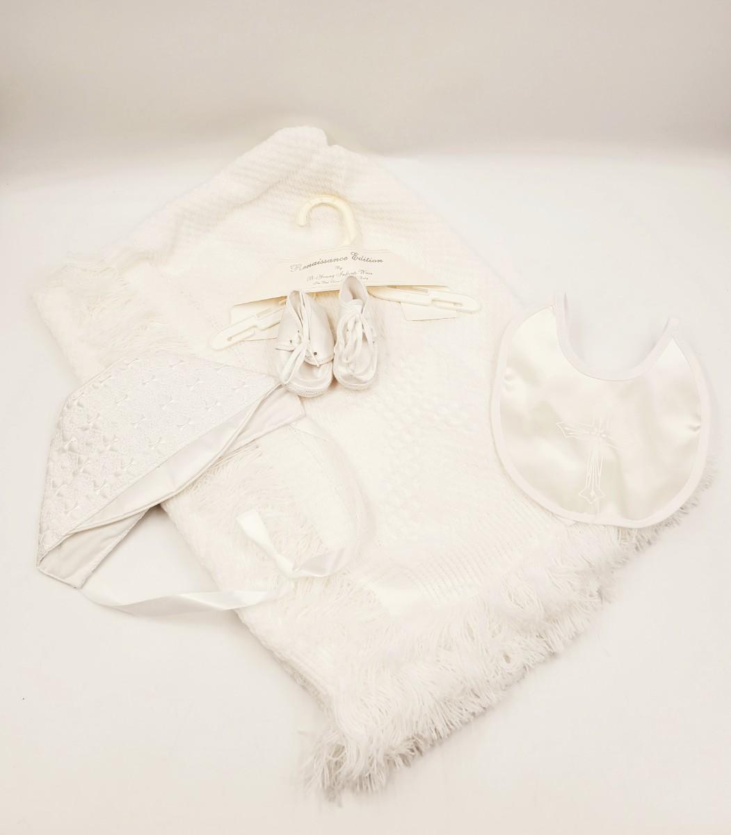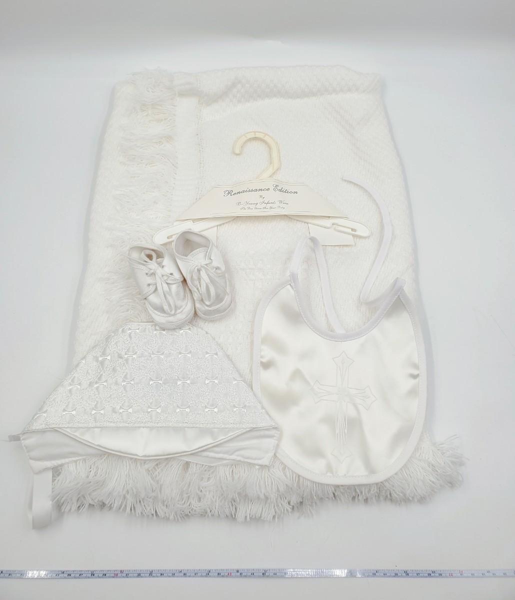 Set includes 1 soft white baby blanket with fringe, cross in the middle and on each corner. 1 pair of size 1 soft baby shoes, a bonnet and bin with cross. All in good condition