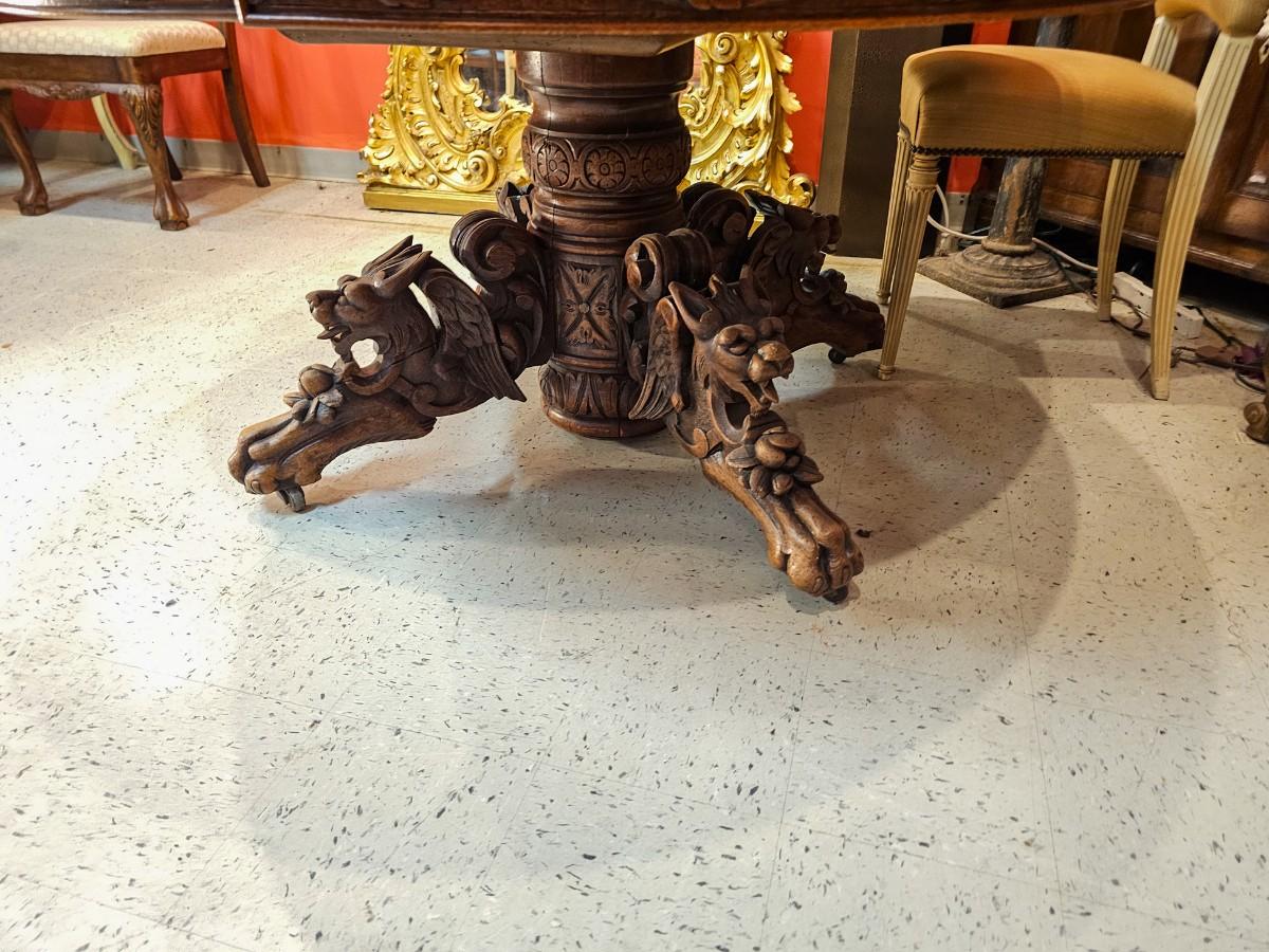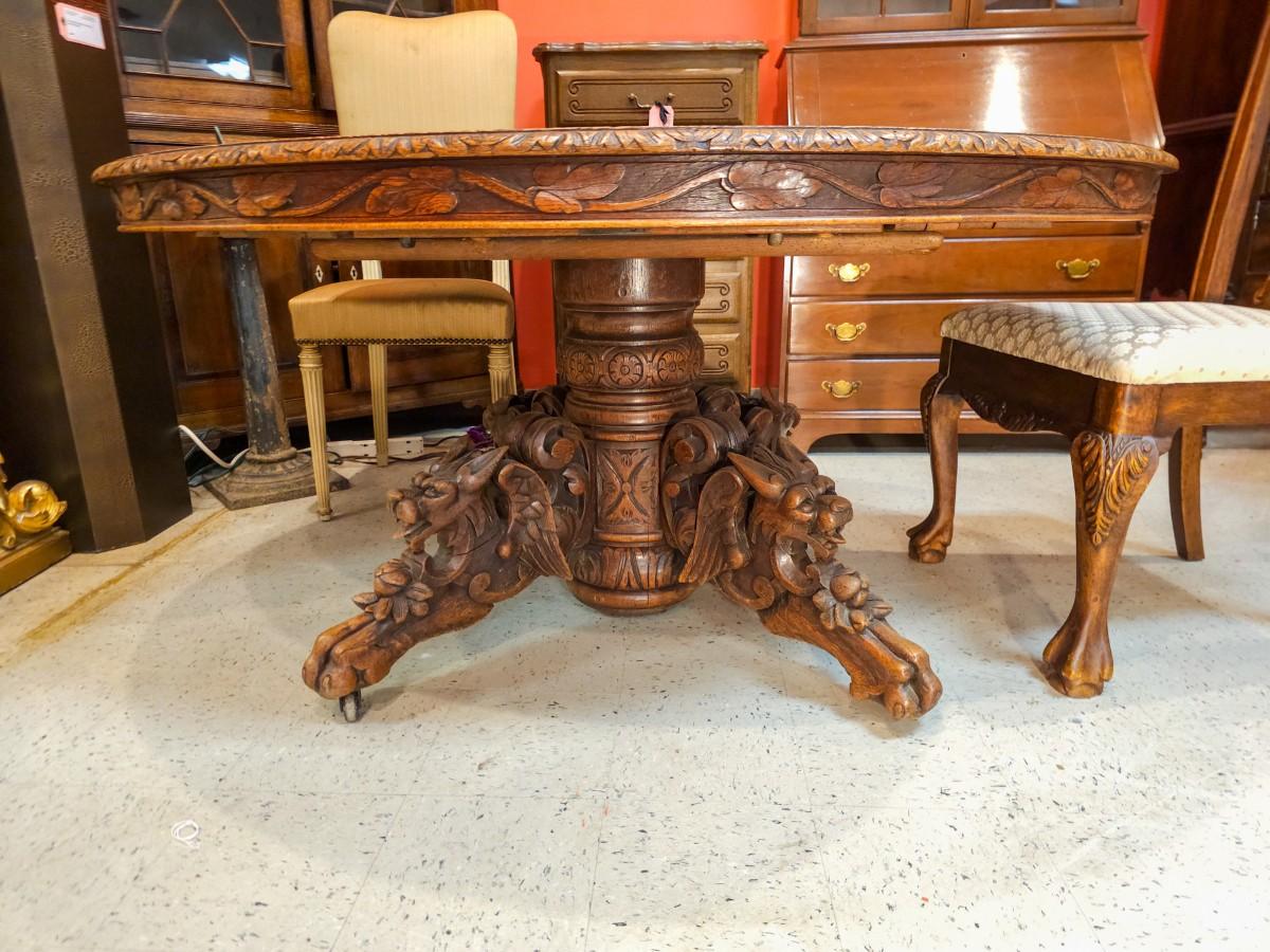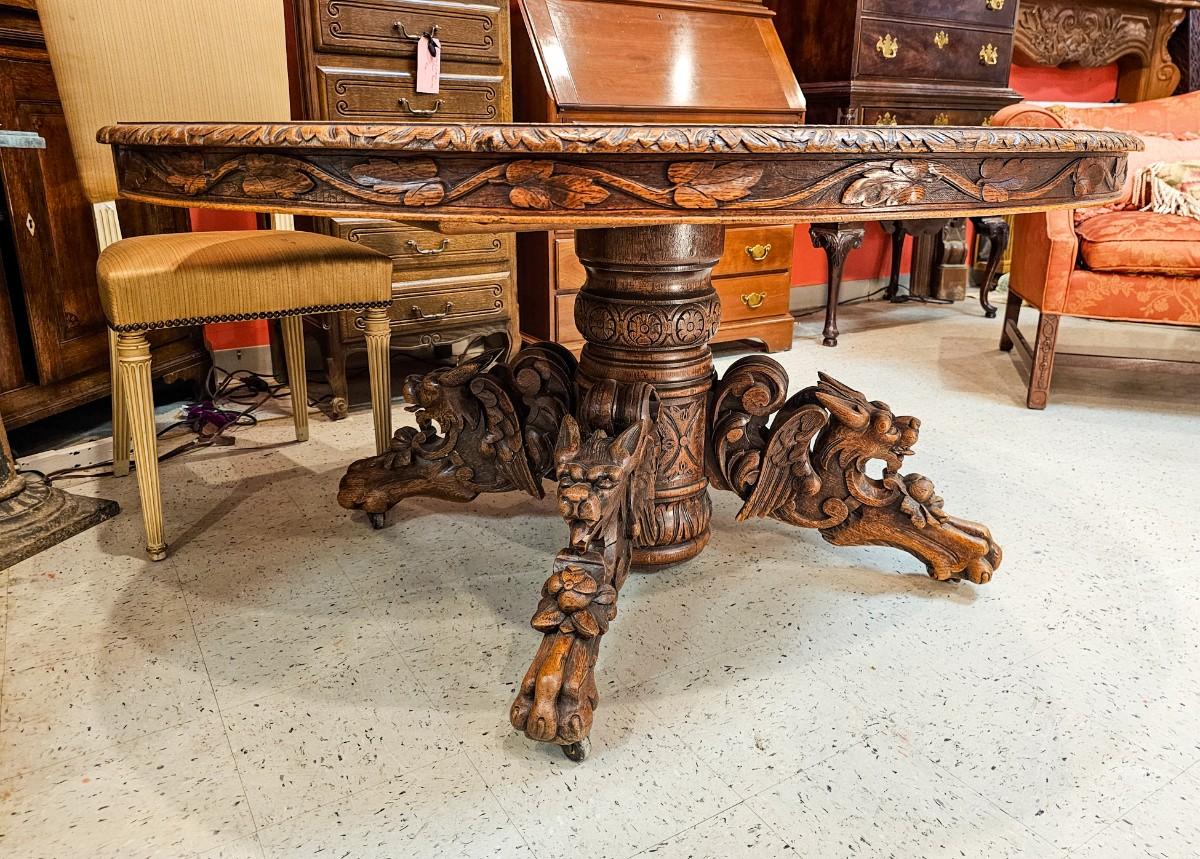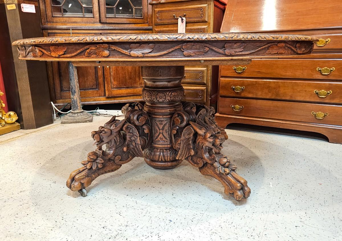 Antique Renaissance Revival oak table, heavily carved featuring mythical creatures