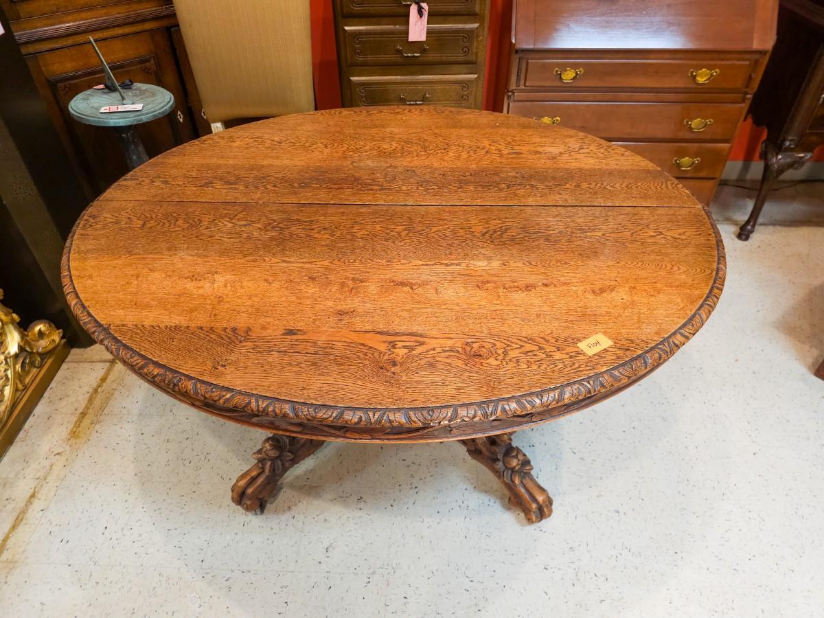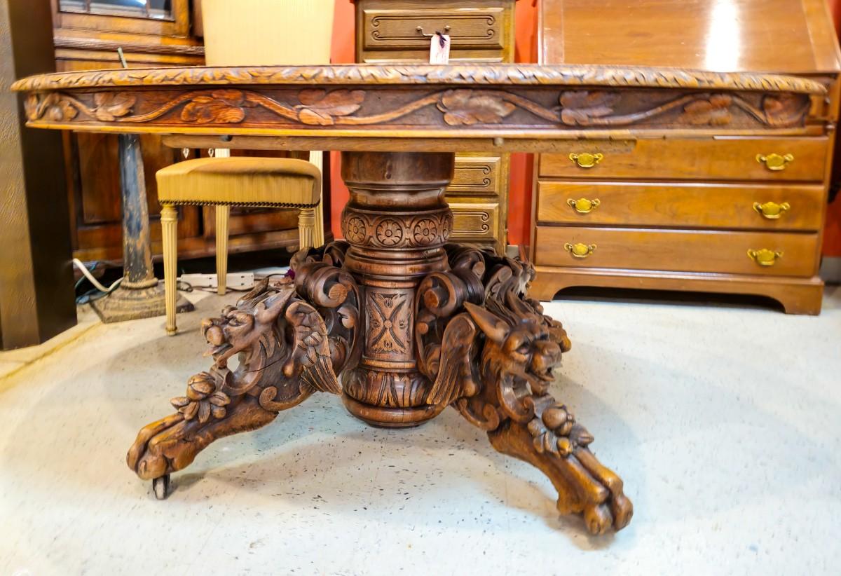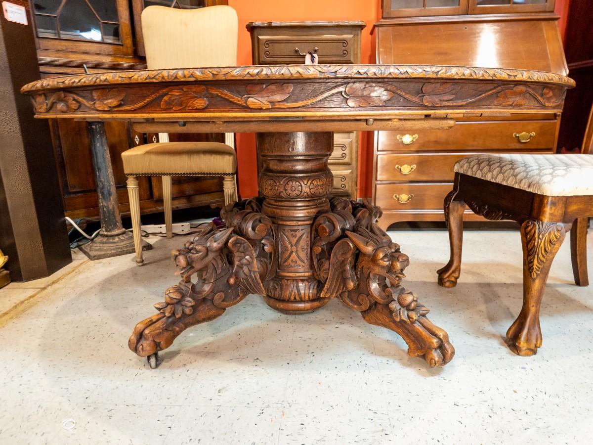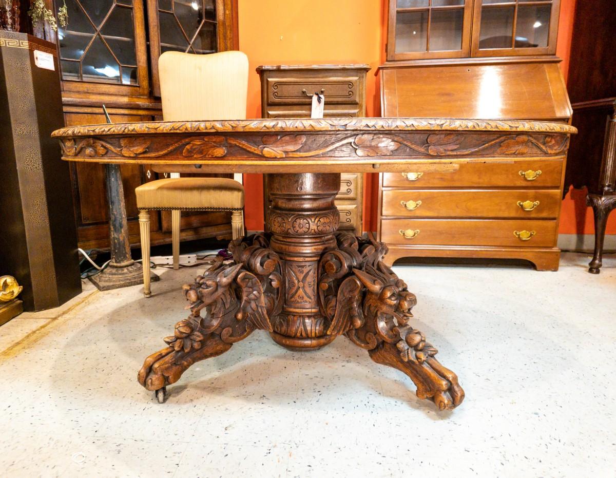 Antique Renaissance Revival oak table, heavily carved featuring mythical creatures