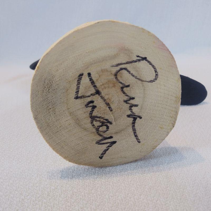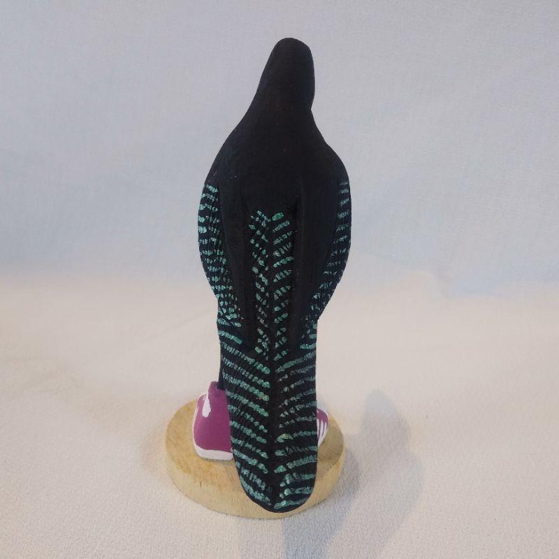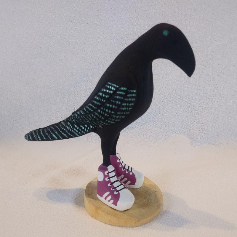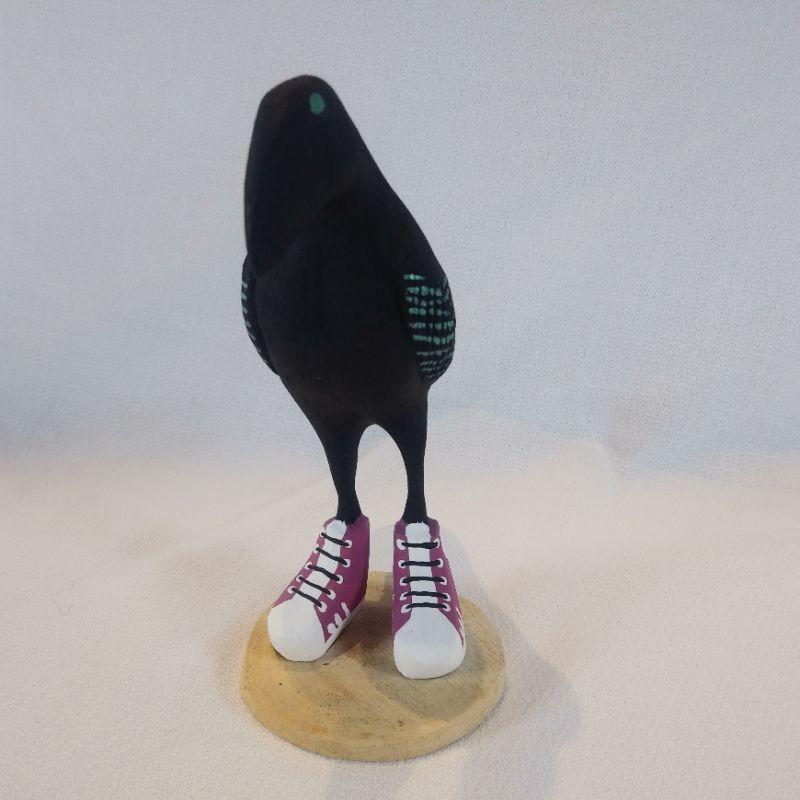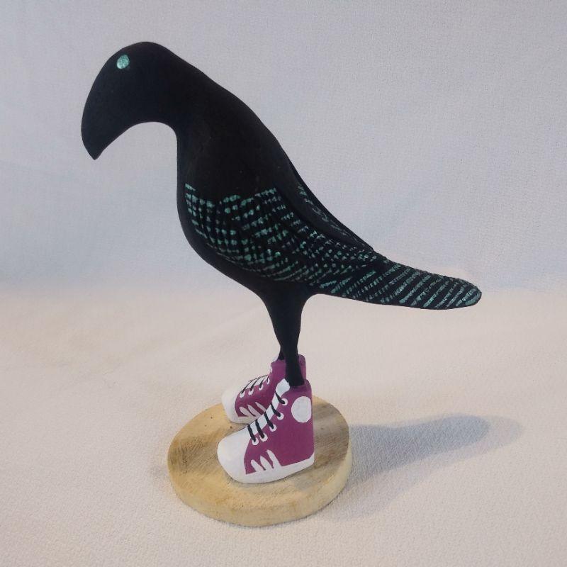 This offering is for a fine piece of folk art by Rena Jebon at its finest. The wonderful tennis-shoe festooned black bird is a great example of the work of a young artist. Stands just under 5 1/4-inches tall X 5-inches wide, would look great on your shelf or mantel.