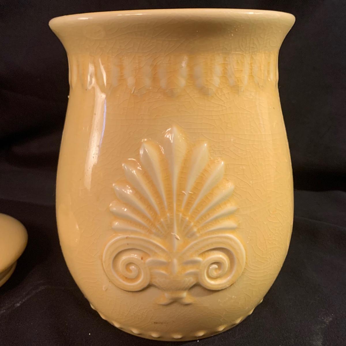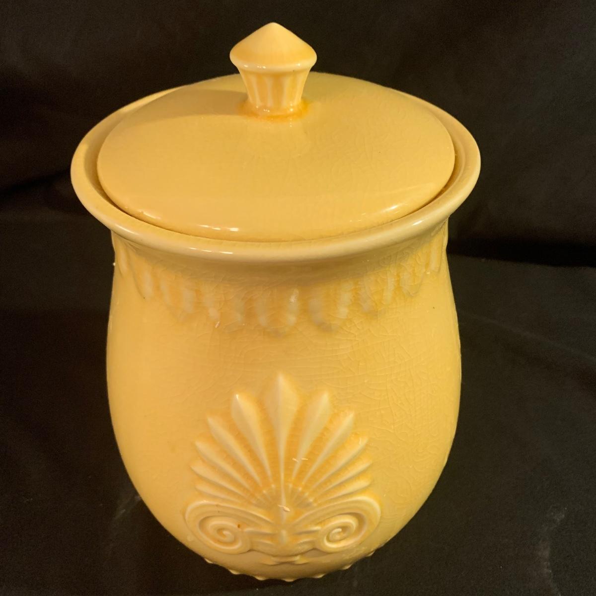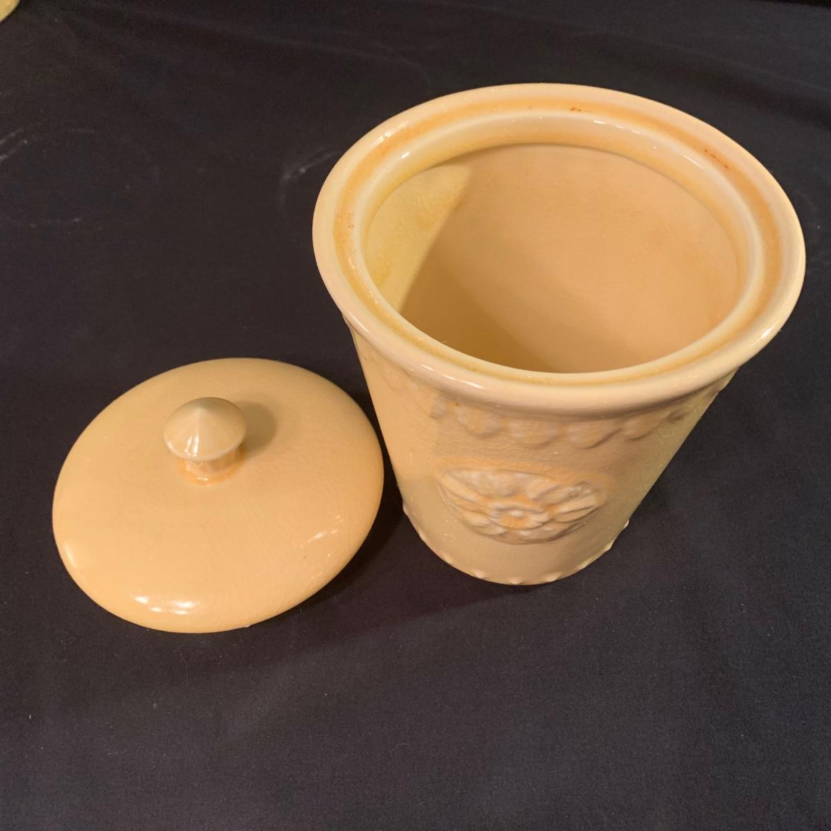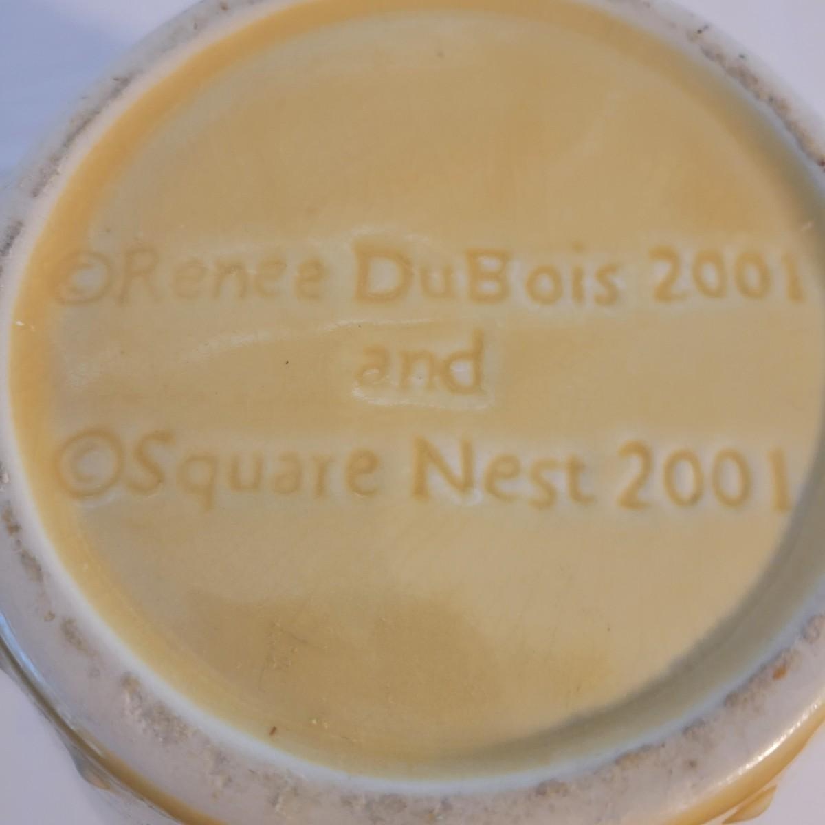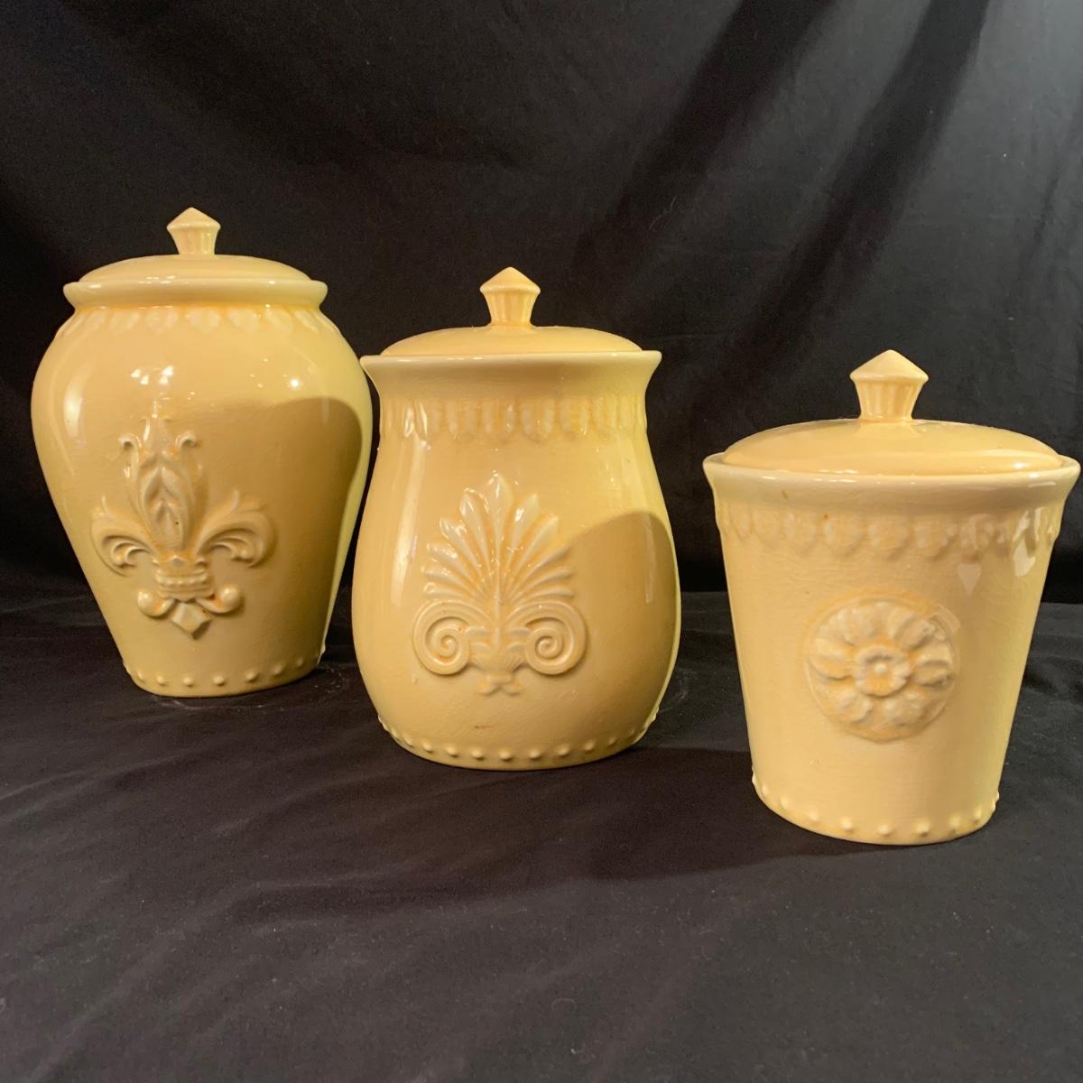 This lot includes three Square Nest Renee DuBois lidded canisters; in butter yellow with a crackle glaze finish. All canisters are lidded and stamped with “Renee DuBois 2001 and Square Nest 2001”. Canisters appear to be in good condition. Largest canister measures 7.5”D x 12”H.