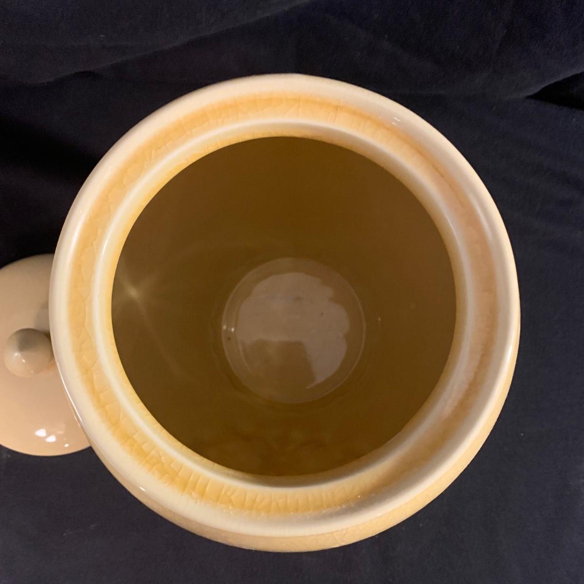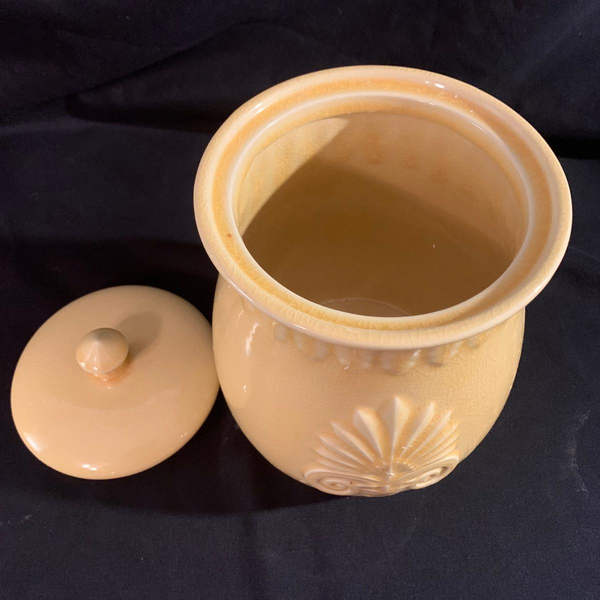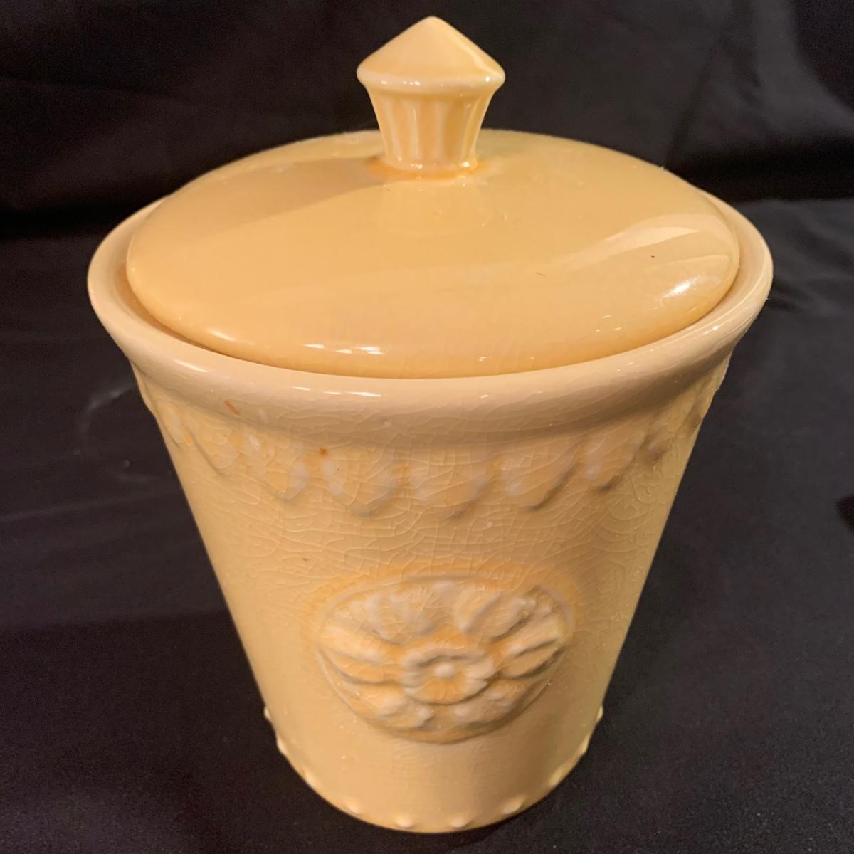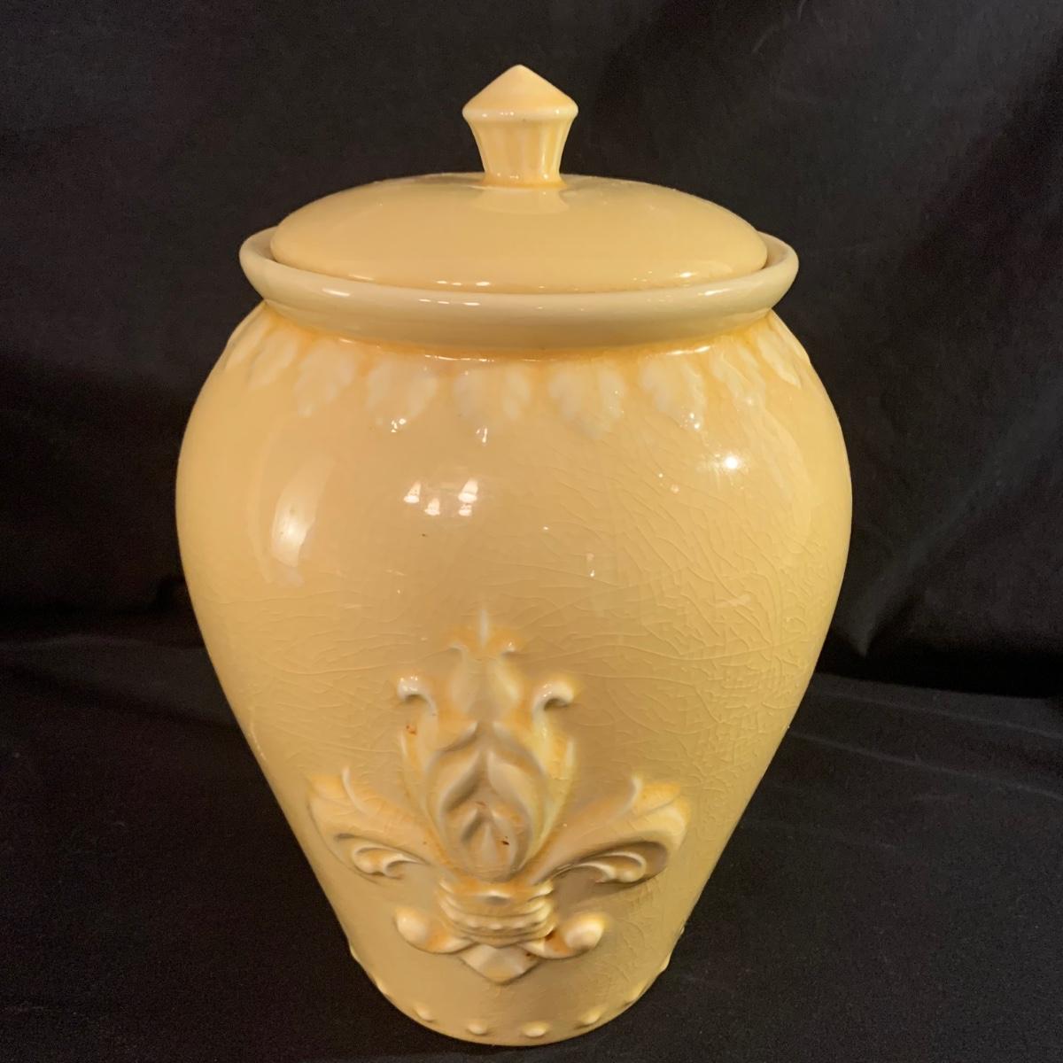 This lot includes three Square Nest Renee DuBois lidded canisters; in butter yellow with a crackle glaze finish. All canisters are lidded and stamped with “Renee DuBois 2001 and Square Nest 2001”. Canisters appear to be in good condition. Largest canister measures 7.5”D x 12”H.