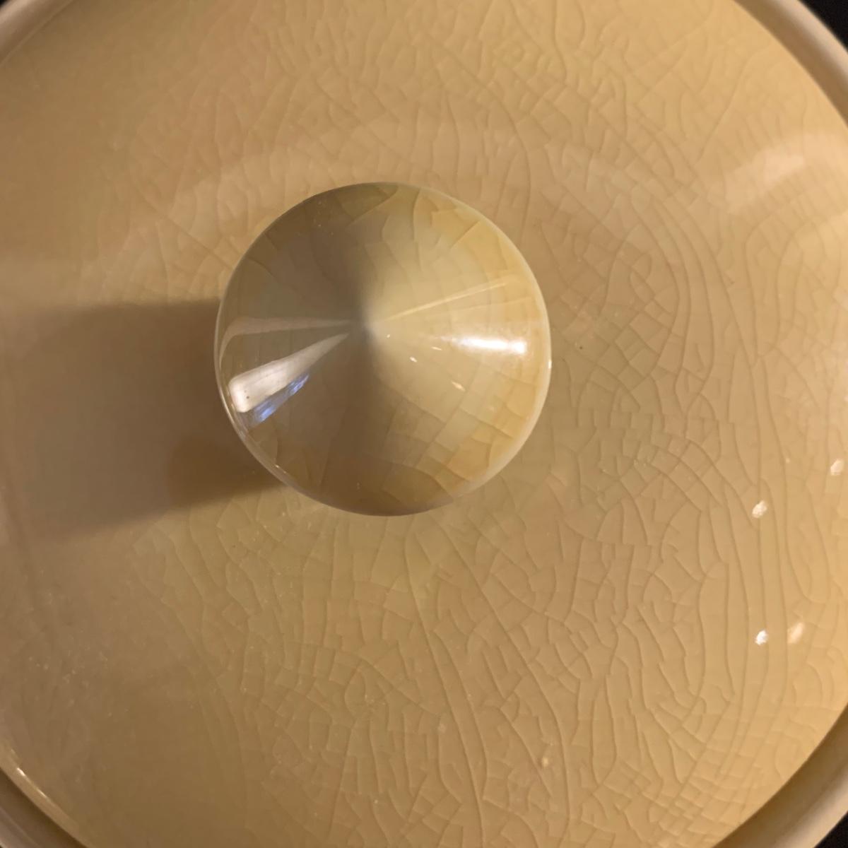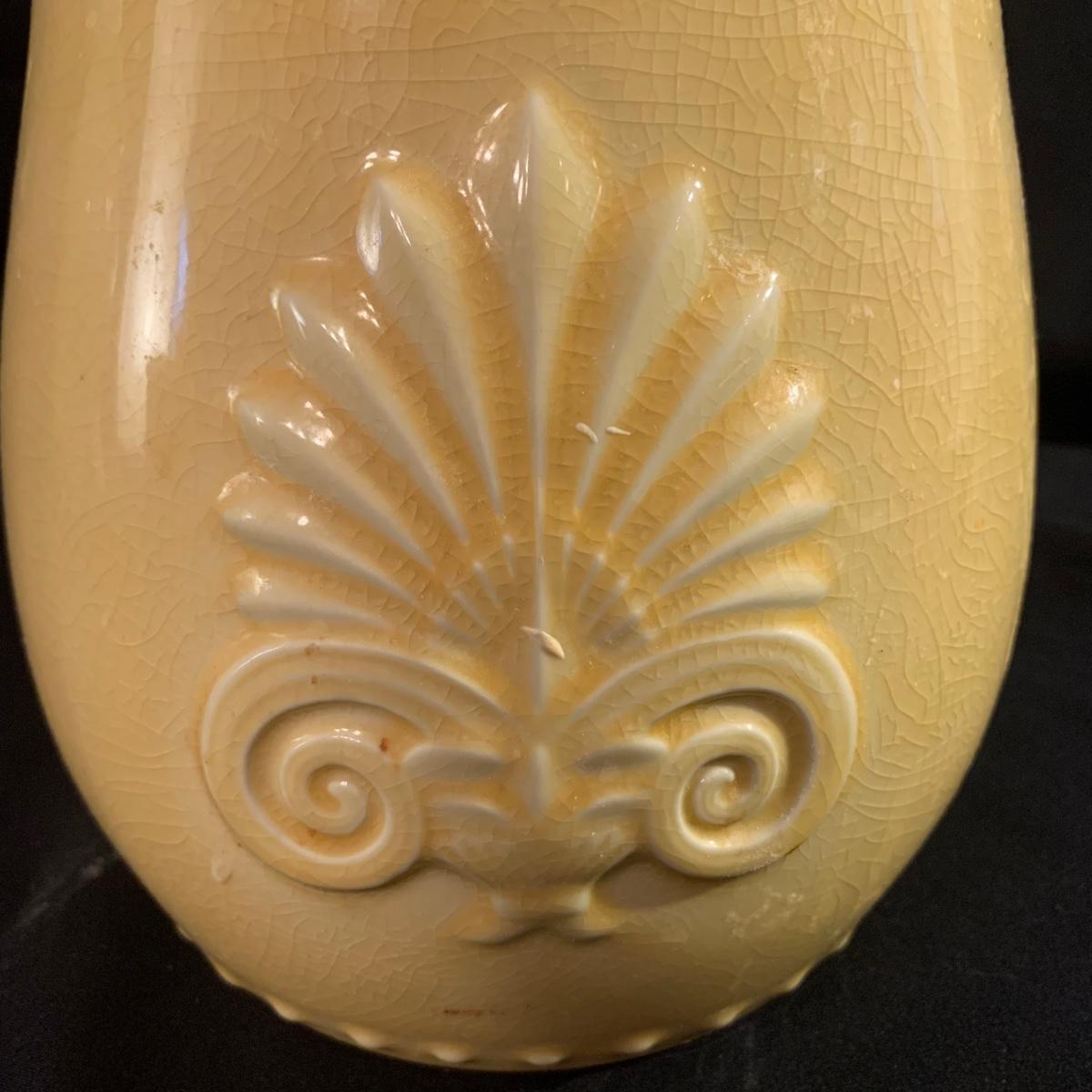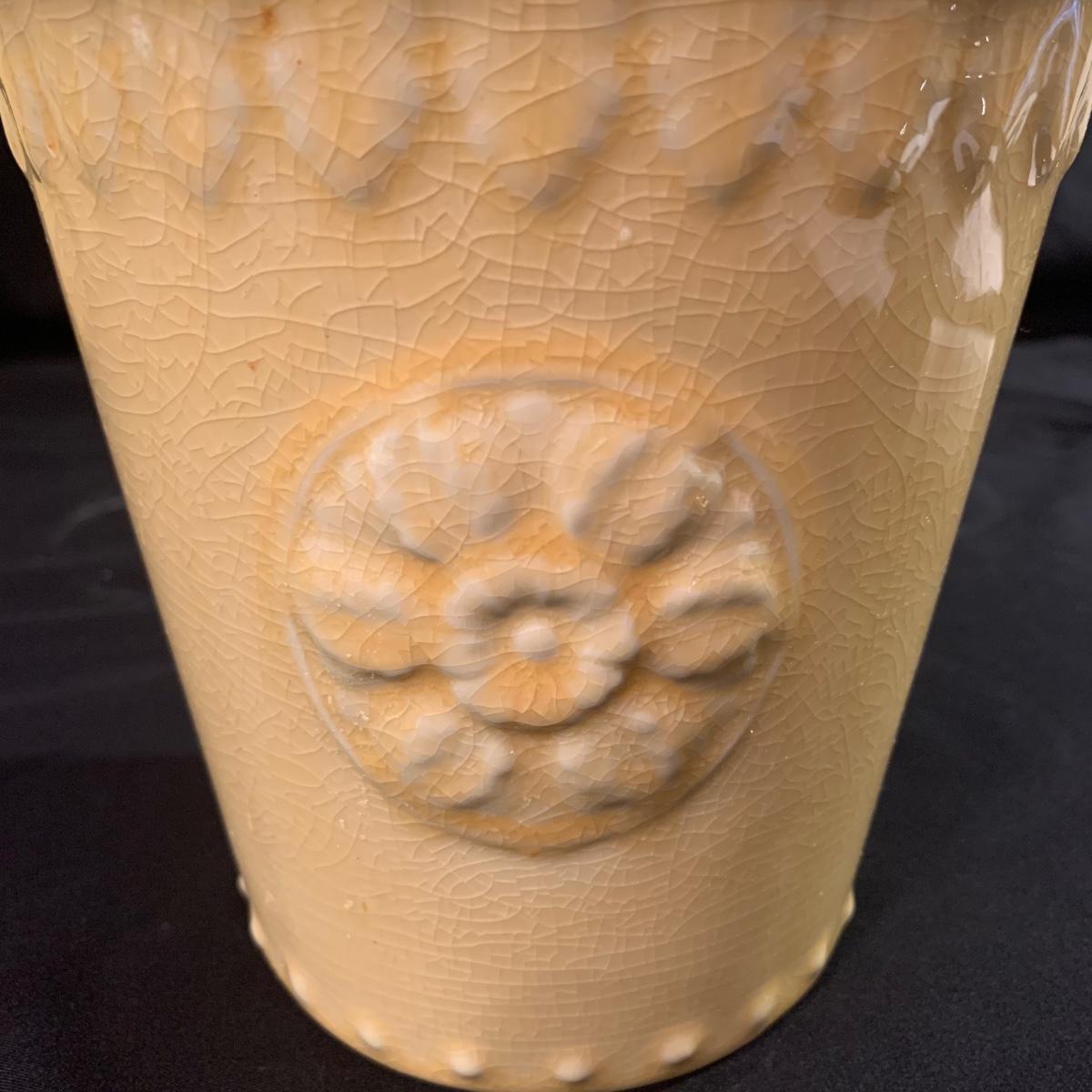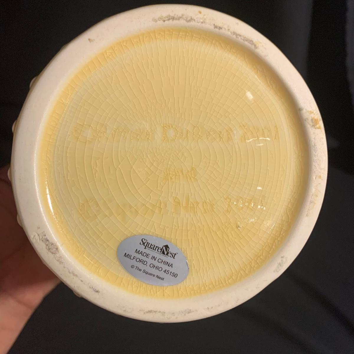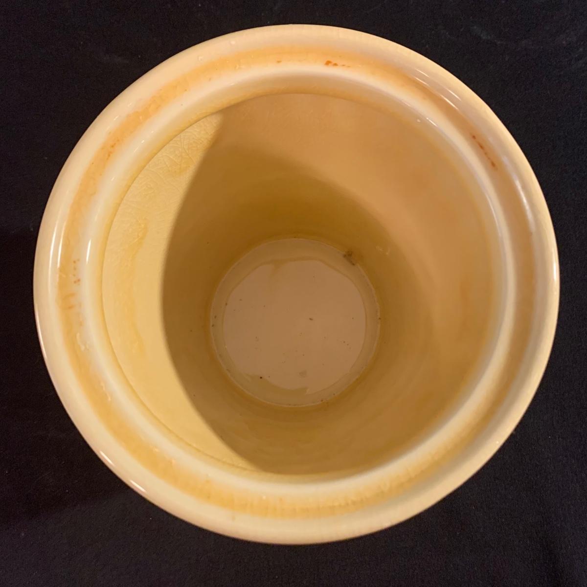 This lot includes three Square Nest Renee DuBois lidded canisters; in butter yellow with a crackle glaze finish. All canisters are lidded and stamped with “Renee DuBois 2001 and Square Nest 2001”. Canisters appear to be in good condition. Largest canister measures 7.5”D x 12”H.