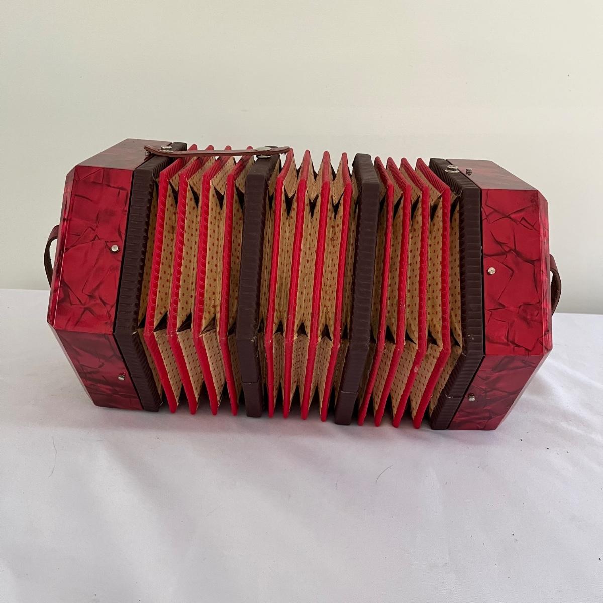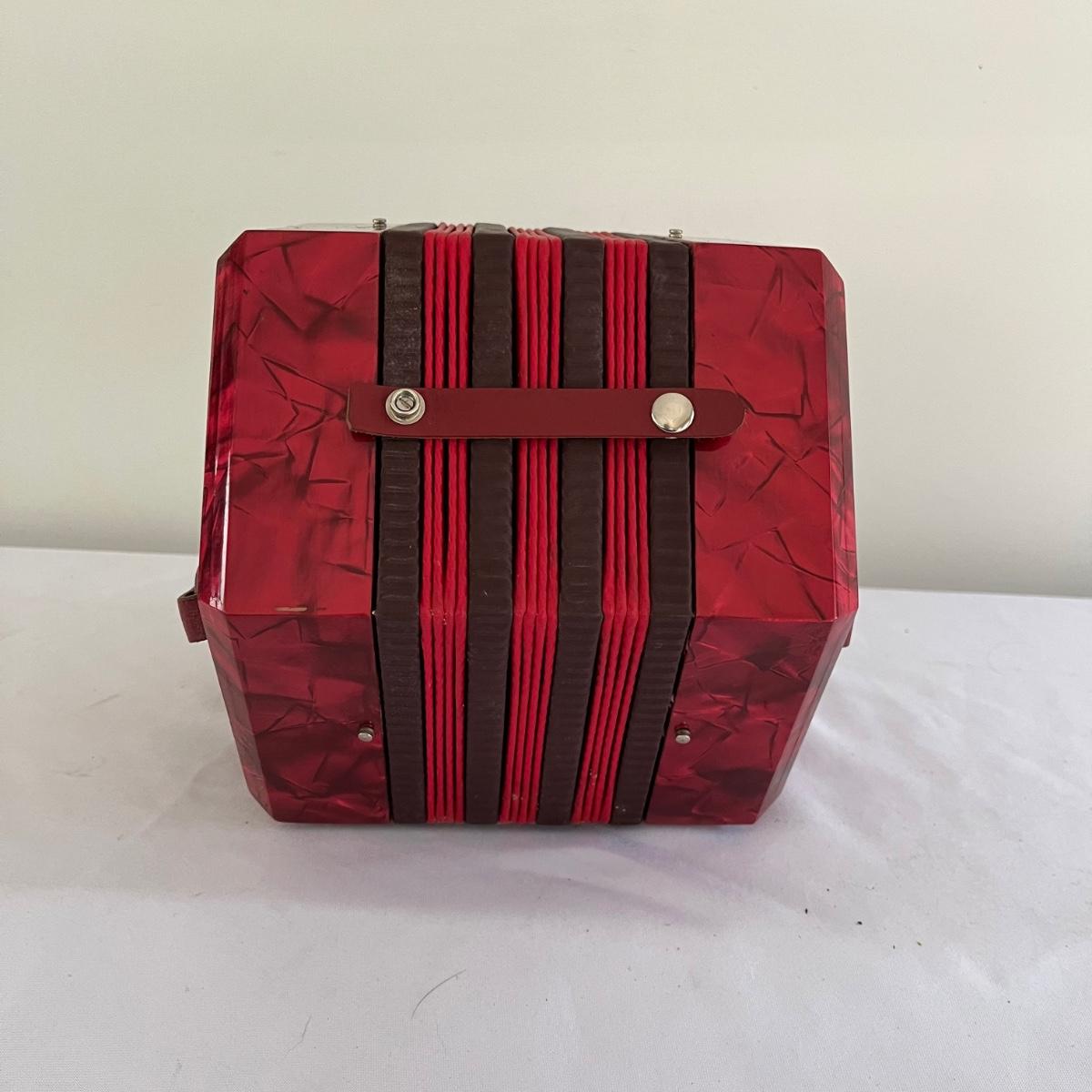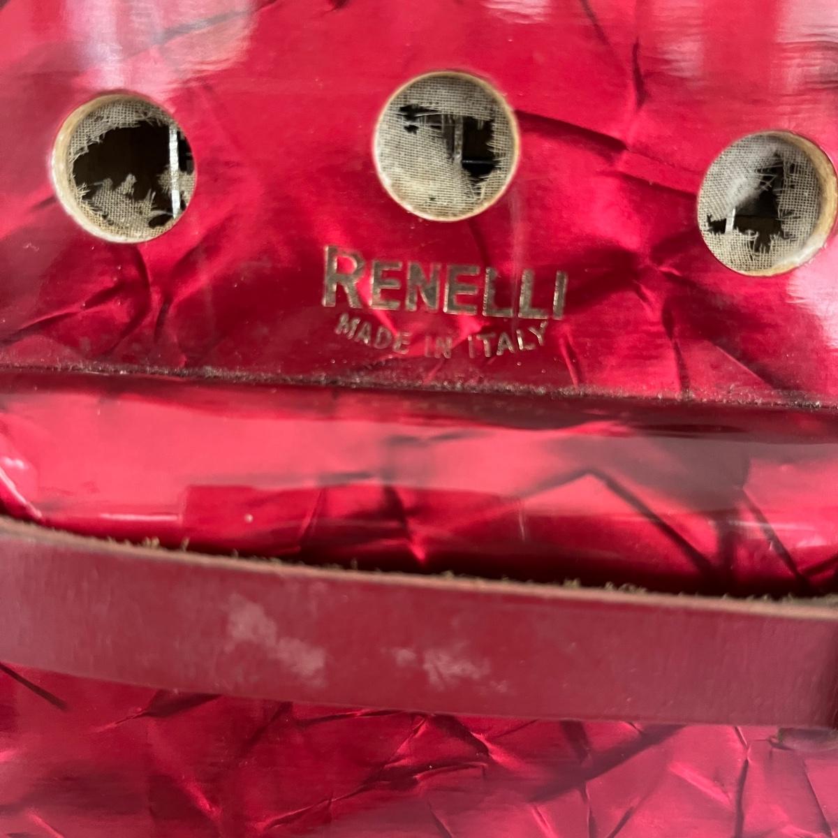 This Renelli accordion is marked "made in Italy". It is red and has leather straps going over the hand holds. Accordion made sound when tested. Close accordion measures 8” x 9” x 8.5”.