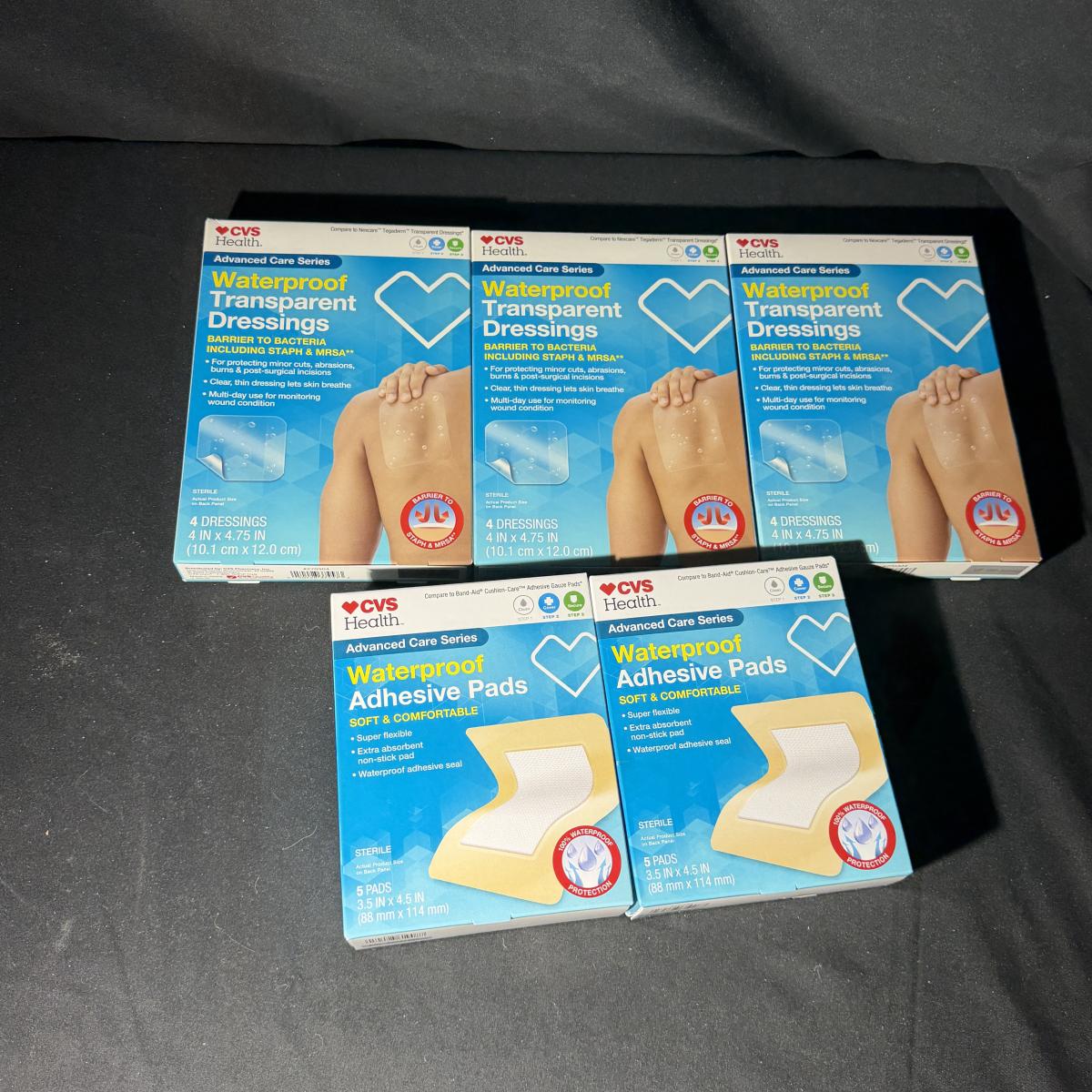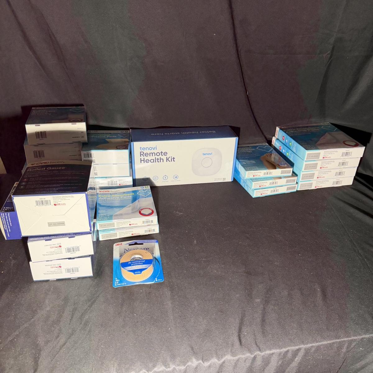 Lot includes a Tenovi remote health kit, NIB rolled gauze and a selection of adhesive pads and dressings.