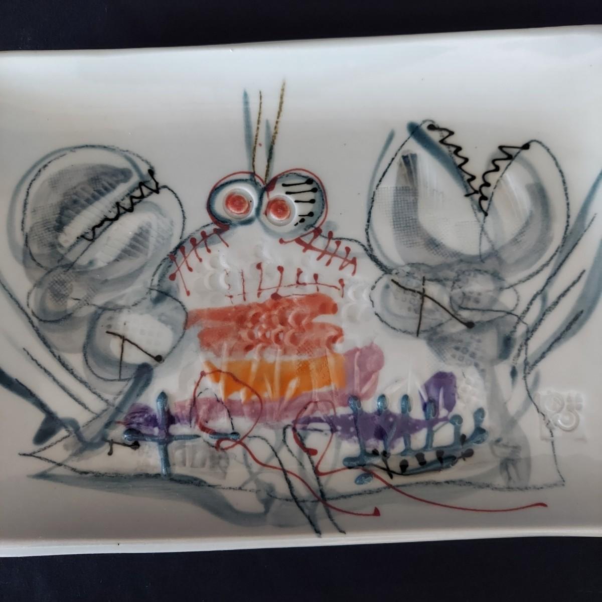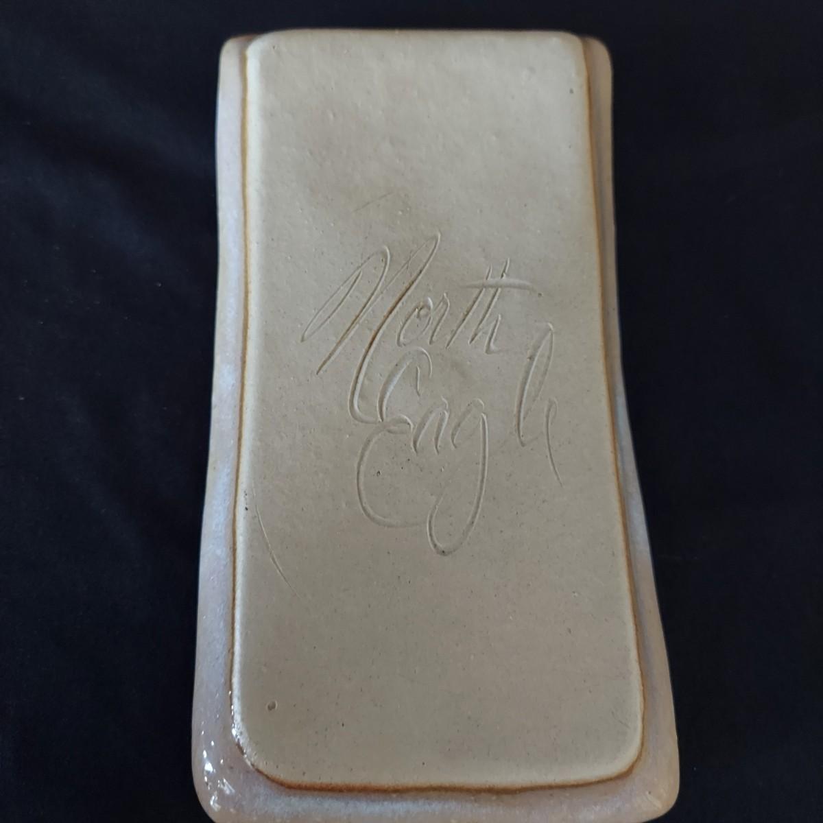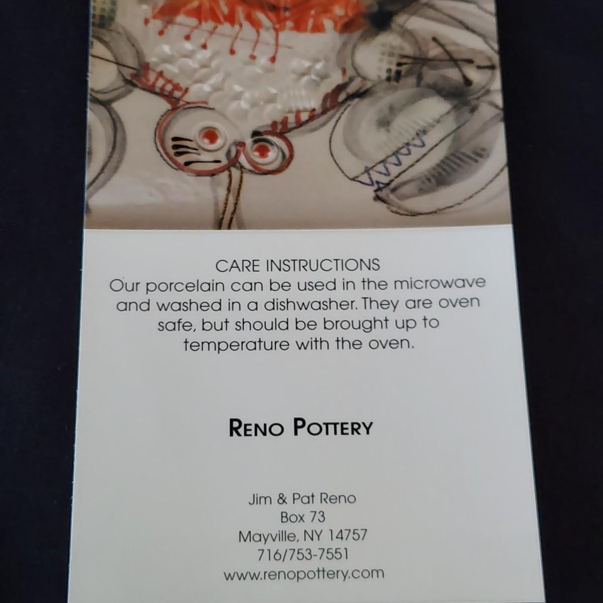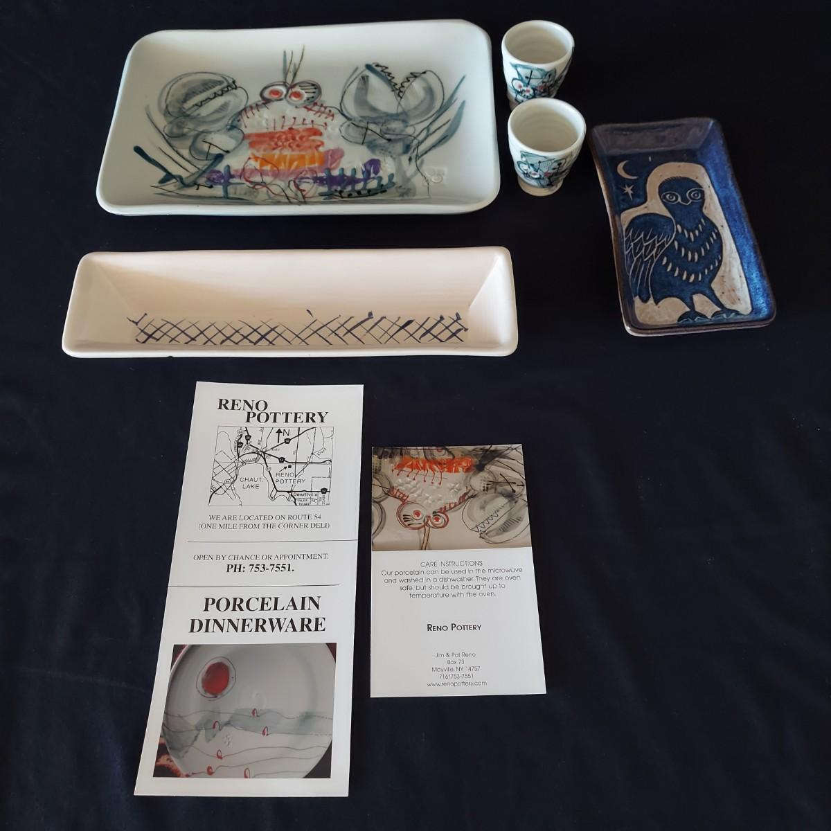 A plate and two cups that appear to be by Reno Pottery. The plate measures 10” x 7” and the cups are 2"H. Also includes a small platter/butter dish with an owl by North Eagle Pottery and a rectangular dish by Mary Kay Botkins. Please see photos for details. Plate stand is not included. Shipping available