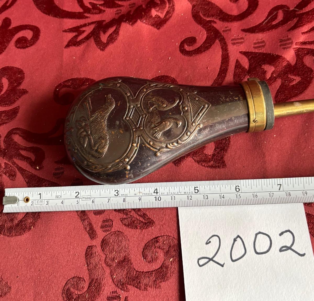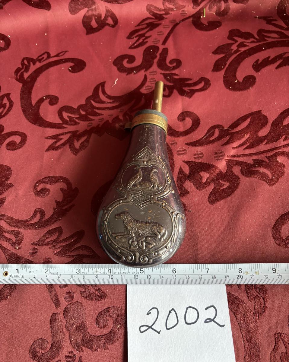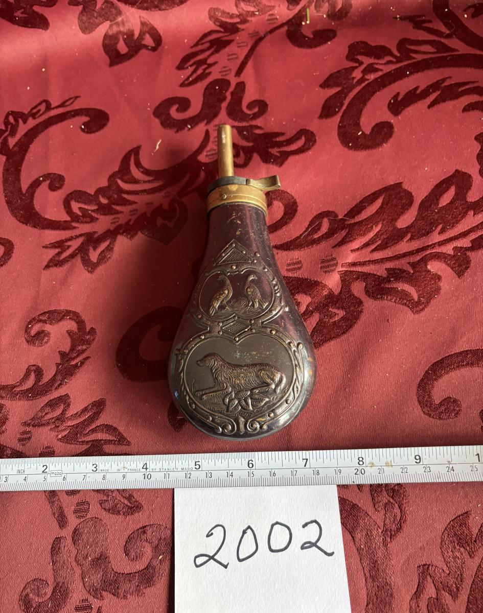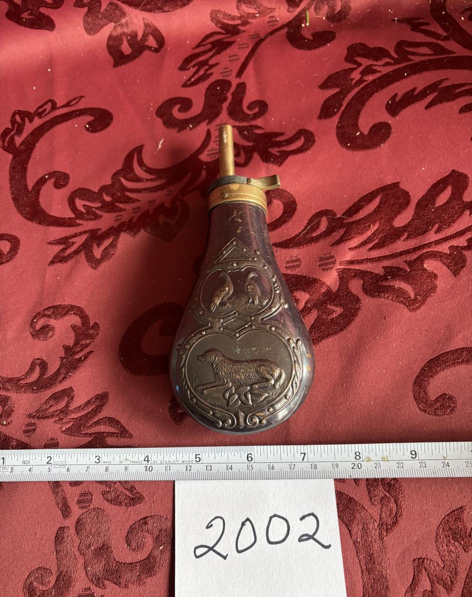 Replica 19th Century Embossed Metal Gun Powder Flask Hunting Dog Bird
